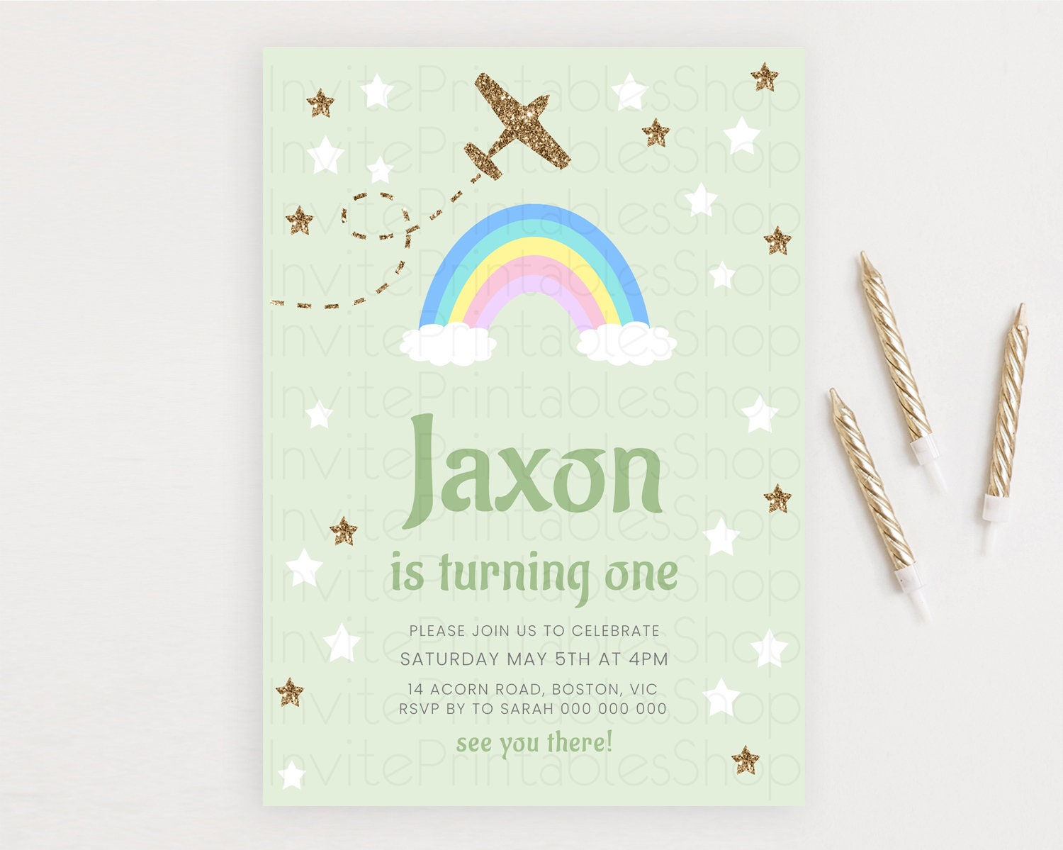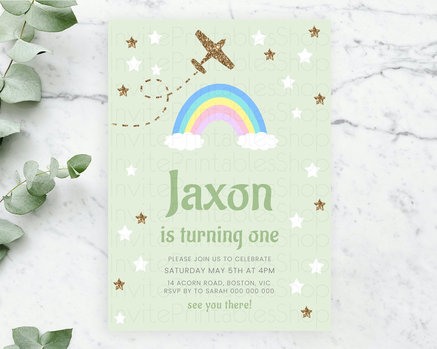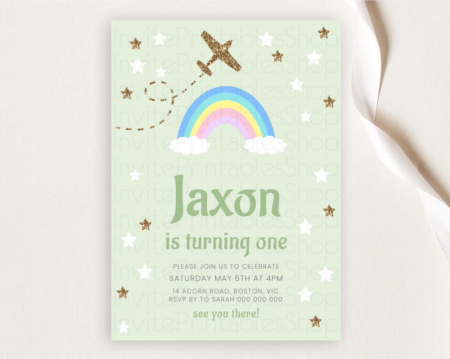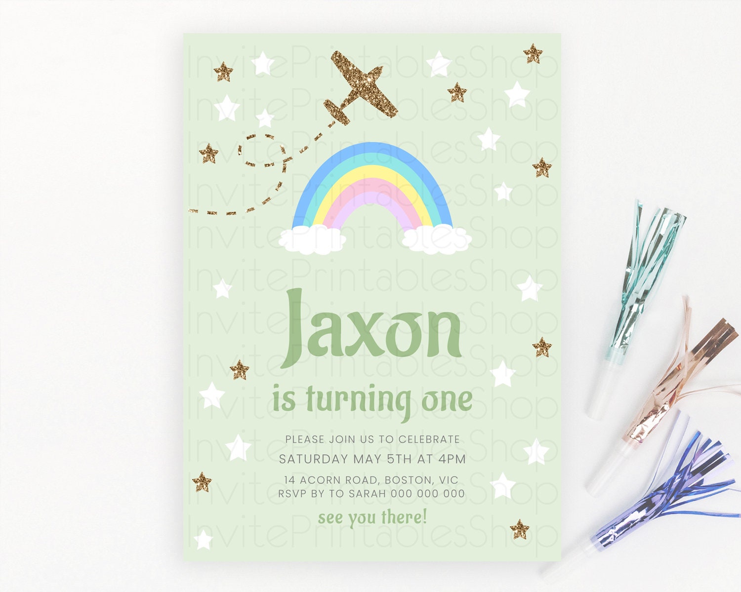 Plane Birthday Invitation Plane Invite Pastel Rainbow Clouds Stars Party Adventure Awaits Up Up Away Glitter 2nd 1st First Birthday D10293