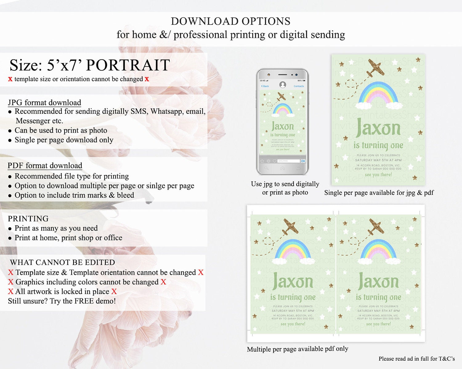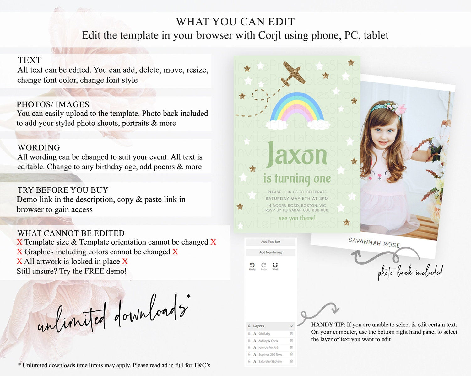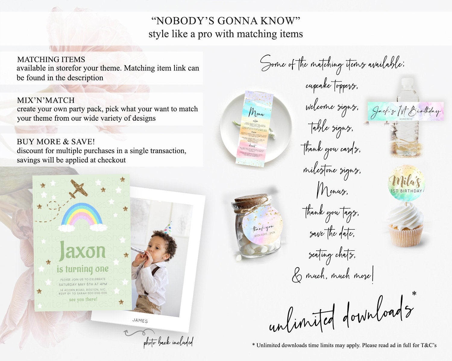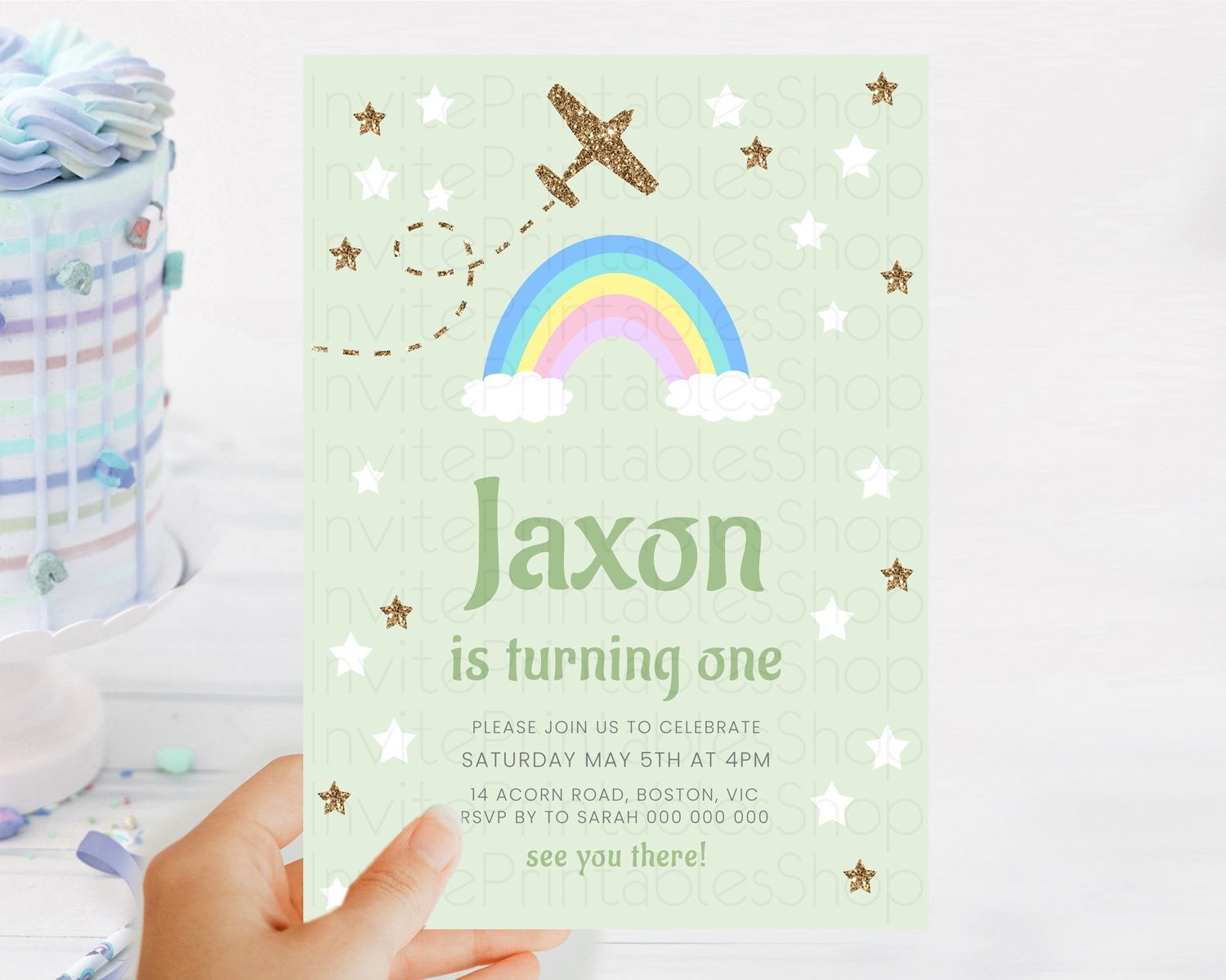 Plane Birthday Invitation Plane Invite Pastel Rainbow Clouds Stars Party Adventure Awaits Up Up Away Glitter 2nd 1st First Birthday D10293