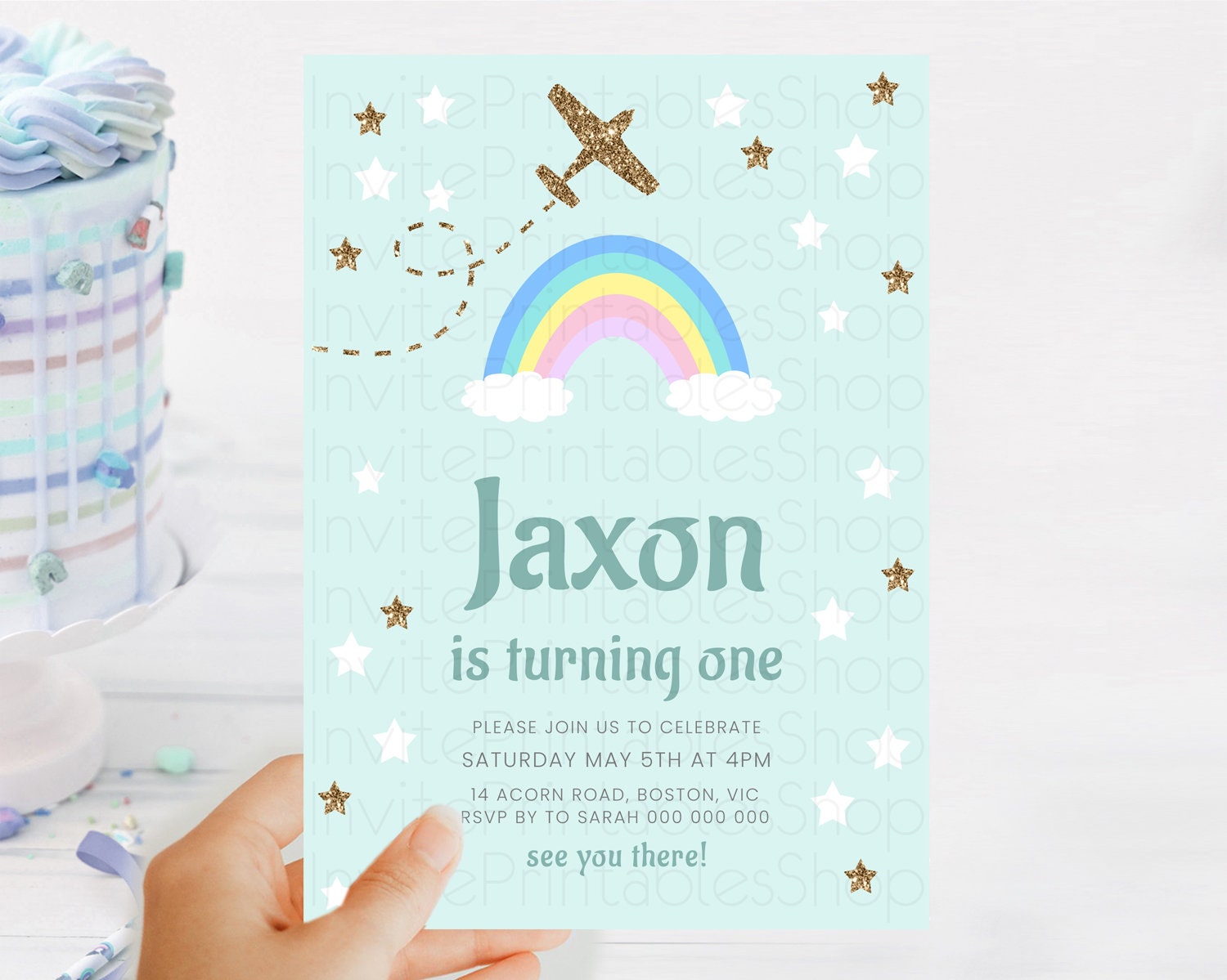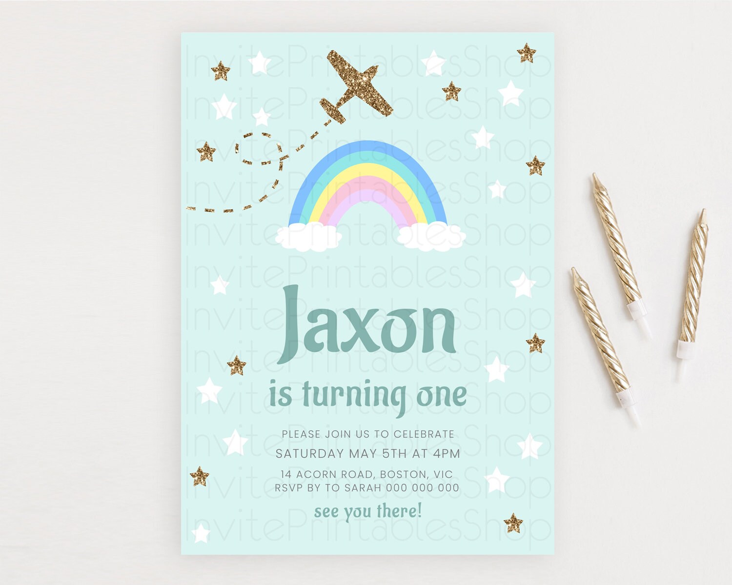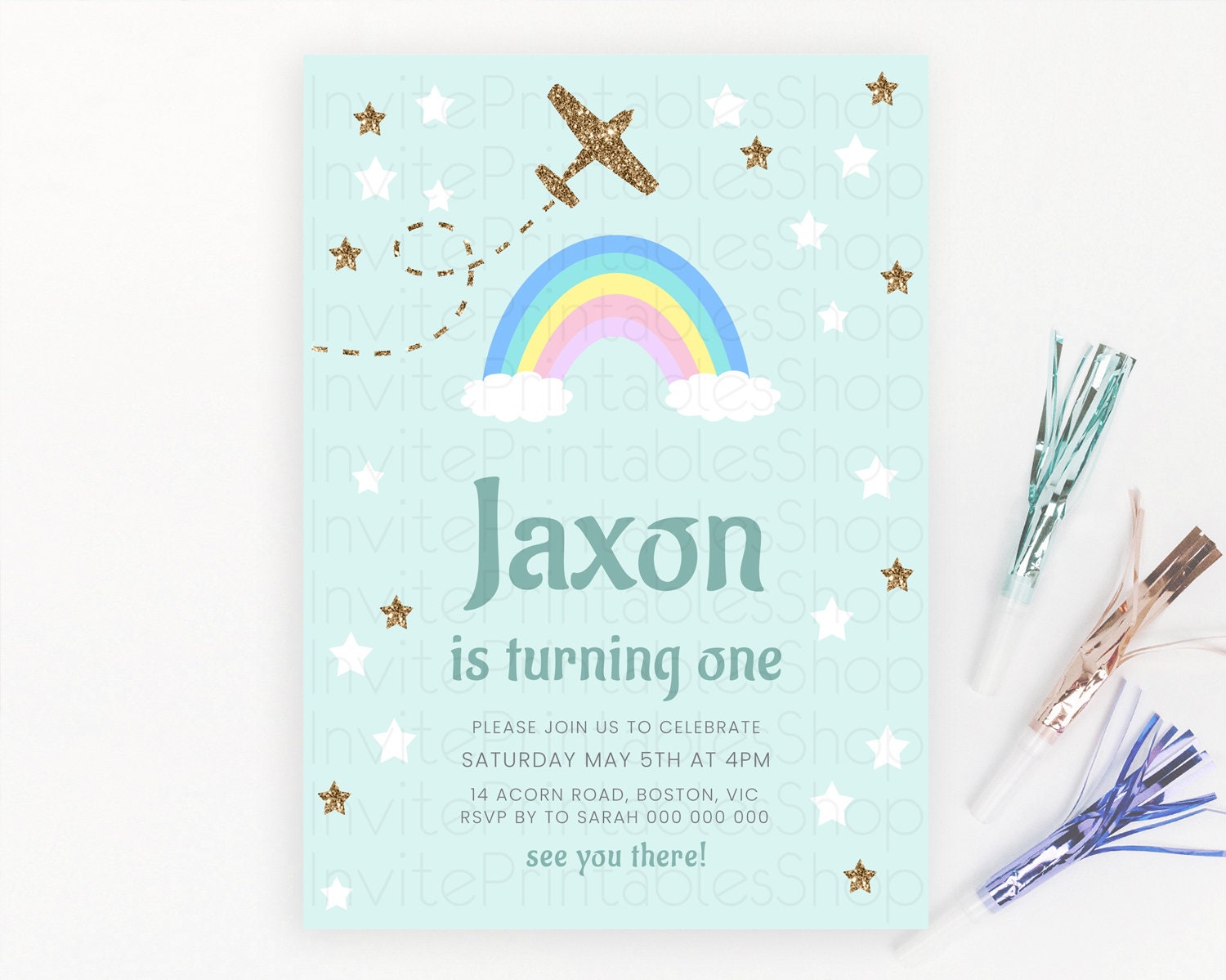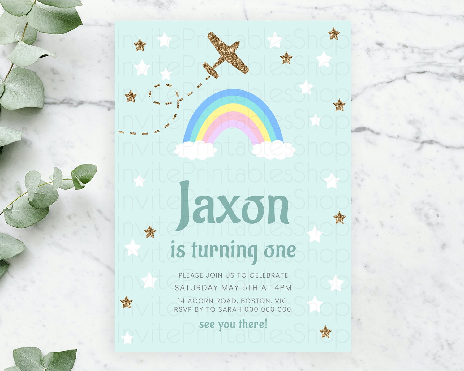 Plane Birthday Invitation Plane Invite Pastel Rainbow Clouds Stars Party Adventure Awaits Up Up Away Glitter 2nd 1st First Birthday D10296