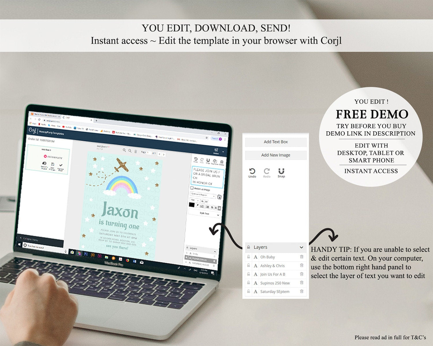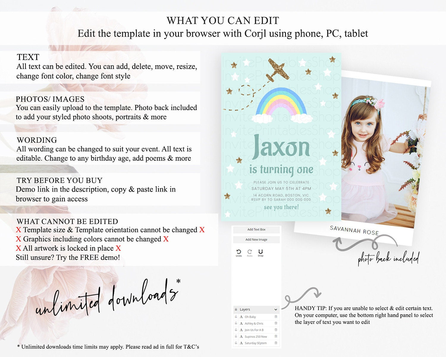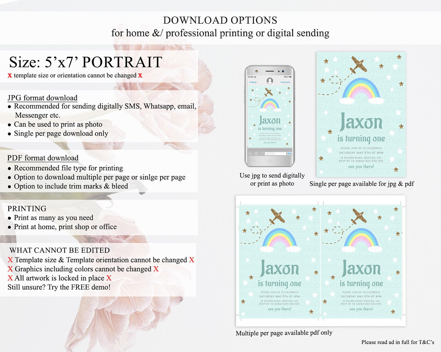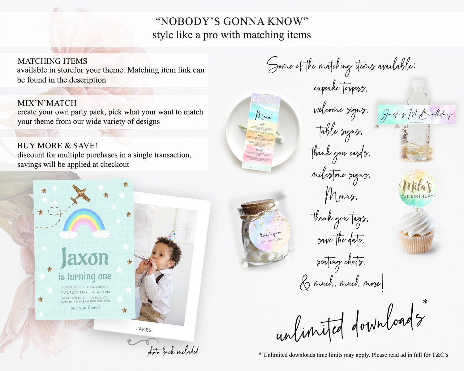 Plane Birthday Invitation Plane Invite Pastel Rainbow Clouds Stars Party Adventure Awaits Up Up Away Glitter 2nd 1st First Birthday D10296