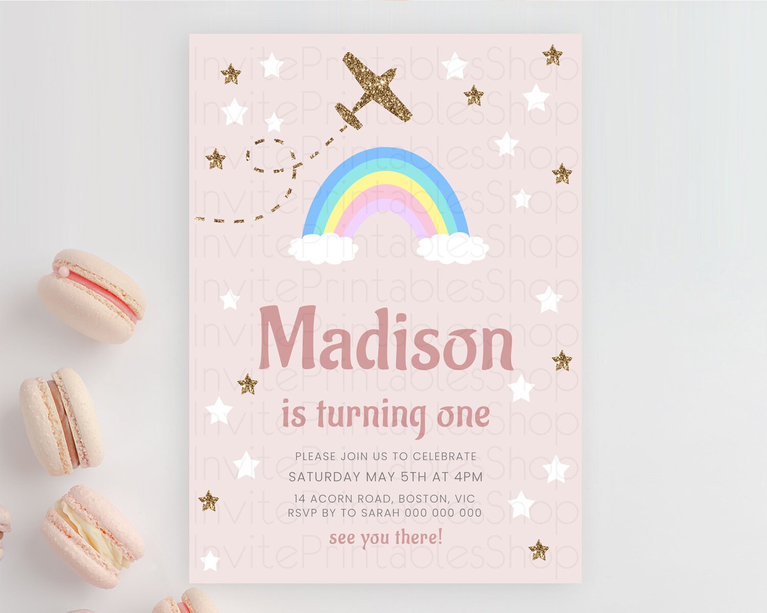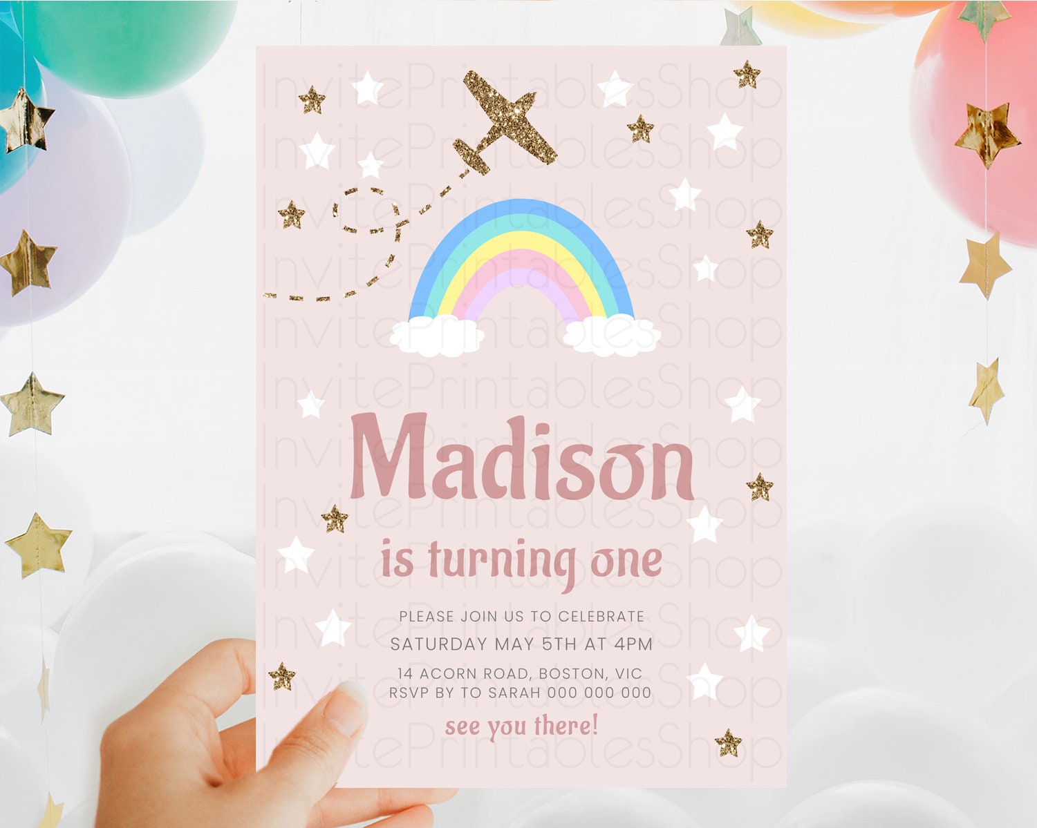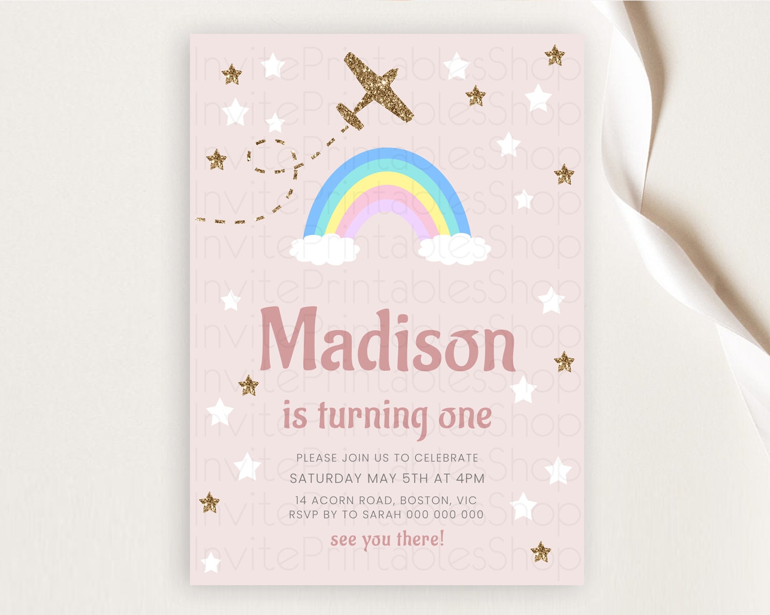 Plane Birthday Invitation Plane Invite Pastel Rainbow Clouds Stars Party Adventure Awaits Up Up Away Glitter 2nd 1st First Birthday D10297