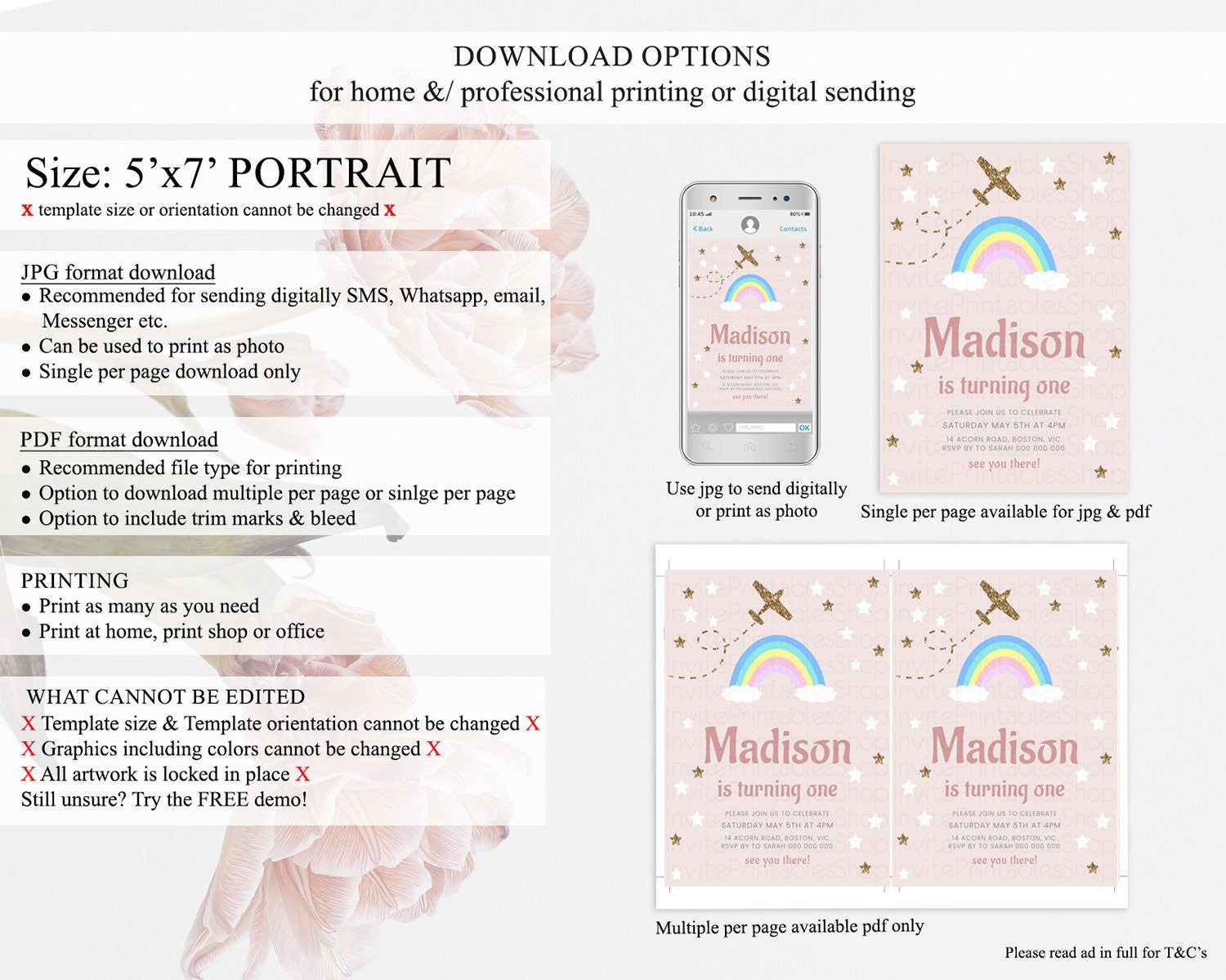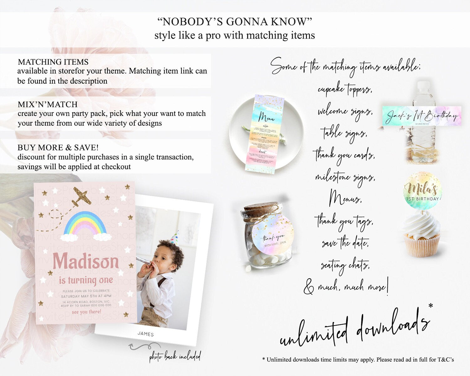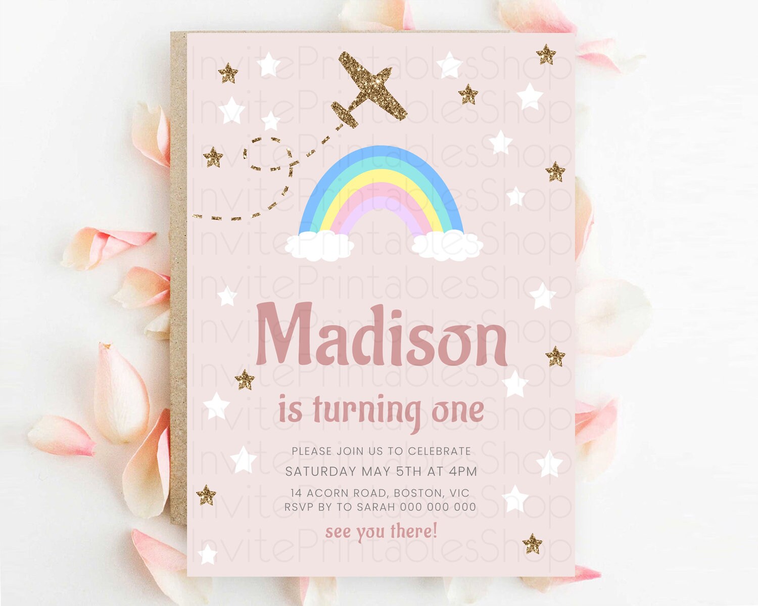 Plane Birthday Invitation Plane Invite Pastel Rainbow Clouds Stars Party Adventure Awaits Up Up Away Glitter 2nd 1st First Birthday D10297