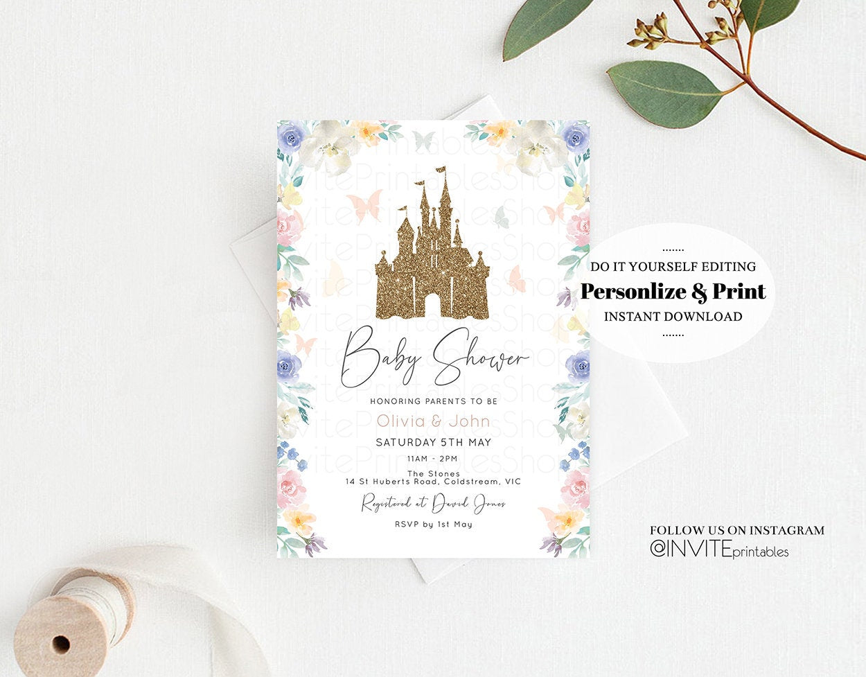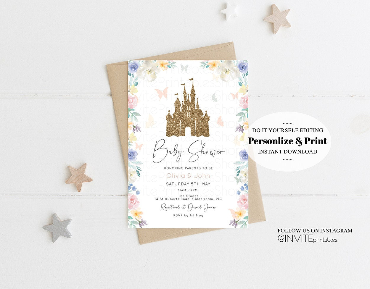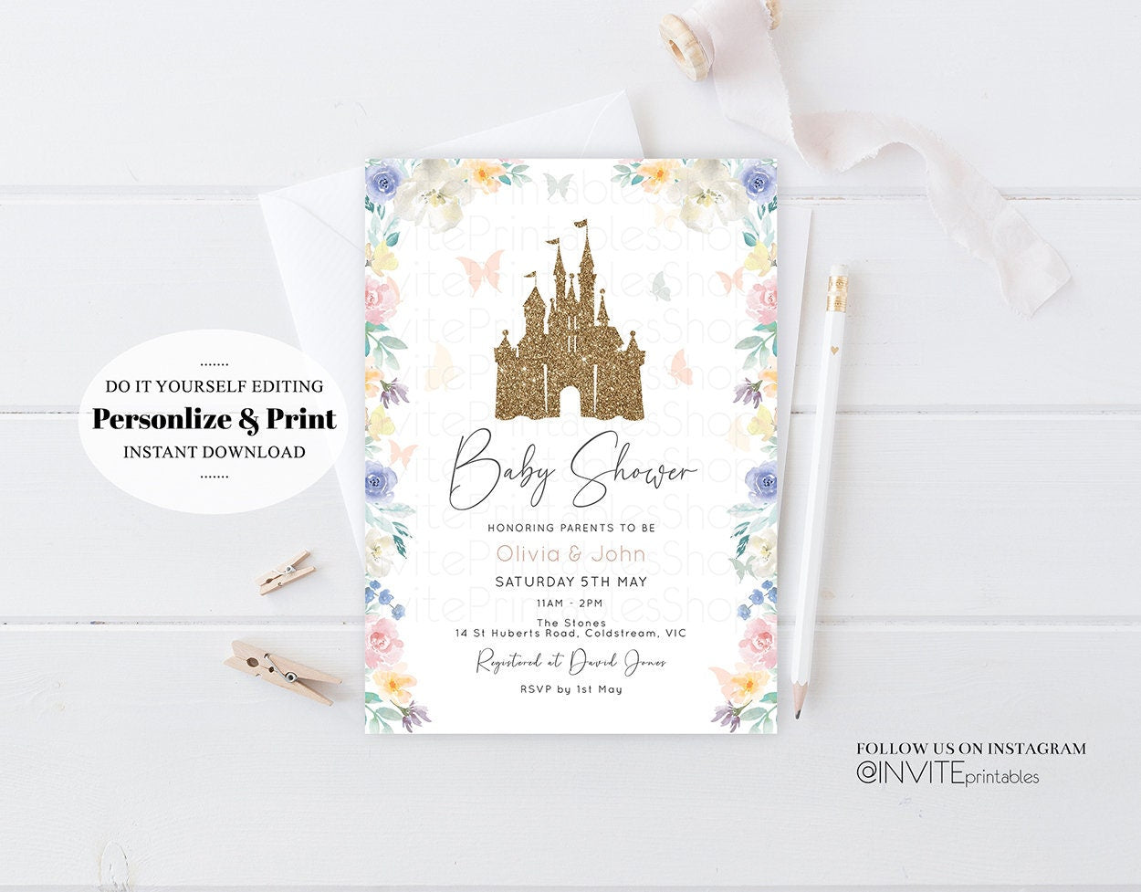 Princess Baby Shower Castle Invitation Disney Invitation Glitter Pastel Florals Secret Garden Enchanted Castle Magical Butterflies Flutters
