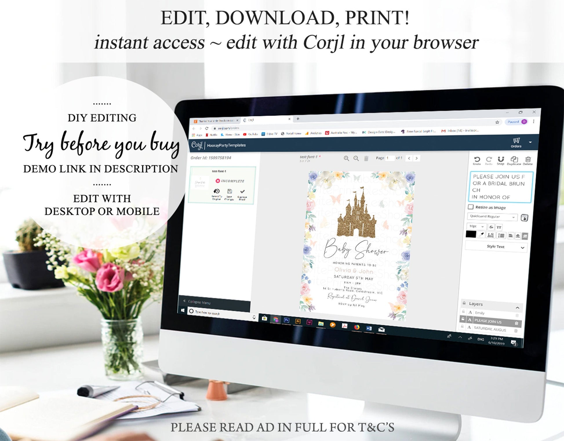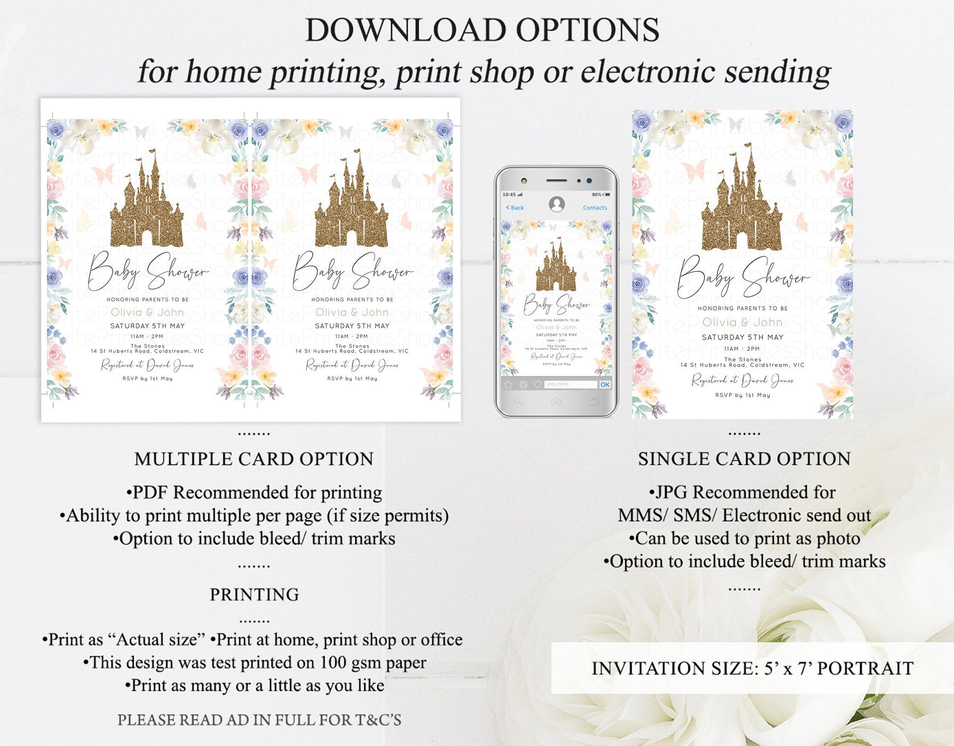 •Try before you buy! • DEMO LINK- https://www.corjl.com/d/116OL1 PLEASE READ AD IN FULL!! •Digital file. No physical item will be shipped •Do it yourself Editing. Edit online with Corjl or Edit with your mobile ITEM DETAILS Invitation size: 5’x7’ File type: PDF, JPEG Resolution: 300DPI PDF FILE OPTIONS: •Recommended for printing •Ability to print multiple per page (if size permits) •Option to include bleed/ trim marks JPG FILE OPTIONS: •Recommended for MMS/ SMS/ Electronic send out •Can be used to print as photo •Option to include bleed/ trim marks EDITING • Do it yourself editing • Mobile editing is available • Google chrome is the recommend browser for Corjl. Please download here for FREE: https://www.google.com/chrome/ • Using other browsers may not show all of Corjl's editing features • Editing on a desktop/ laptop computer is recommended to access all of Corjl features • Mobile editing is available, please use a desktop/ laptop computer to access all of Corjl features DOWNLOADS & EXPIRY •Maximum 3 downloads on the same edit •Link expires 30 days after purchase DOWNLOAD NOTICE •Once you have reached your download limits &/ “approve proof” in Corjl. You will not be able to request further downloads on your design. Further download requests are not permitted WHAT IS EDITABLE •Text - colours, fonts, size, move, delete & rotation. •Please see demo link for what you can and can’t do WHAT YOU CAN’T EDIT •Template size •Template orientation •Graphics CAN NOT BE deleted, moved, or changed in colour •Please see demo link for what you can and can’t do HOW TO 1. Choose design template & checkout on Etsy. 2. Email will be sent from Corjl. Follow link to access template 3. Edit, save & print INSTRUCTIONS •Instructions on how to edit your design have been written by Corjl and will be available with your purchase. PRINTING •Colours can vary depending on the monitor, printer & cardstock •Can be printed at home •Home printing will require you to select the high quality print settings, select appropriate paper thickness & click "Actual size" prior to you printing •This design was test printed on 100 gsm paper •Can be printed at local print shop. Please check printing requirements & any printing restrictions prior to purchase PERSONAL USE ONLY. This item cannot be shared, re-sold, or used commercially for profit. REFUND POLICY •We are unable to provide a refund/ exchange on commenced & completed work, instant downloads or self-editing link templates. Please use the demo link to work out if this product is right for you. Copyright © 2018 by InvitePrintablesShop PTY LTD All rights reserved. This file or any portion thereof may not be reproduced or resold without the express written permission of the publisher (including edits to the design). Our files are provided as high-resolution PDFs – the end result is dependent upon the printer and paper used. If using a professional printing company, InvitePrintablesShop are not responsible for their specific printing requirements, paper or colour quality. Any changes required to the template are not included with your purchase – the files come as described in the listing only and cannot be changed. Thank you for visiting Invite Printables Shop:)