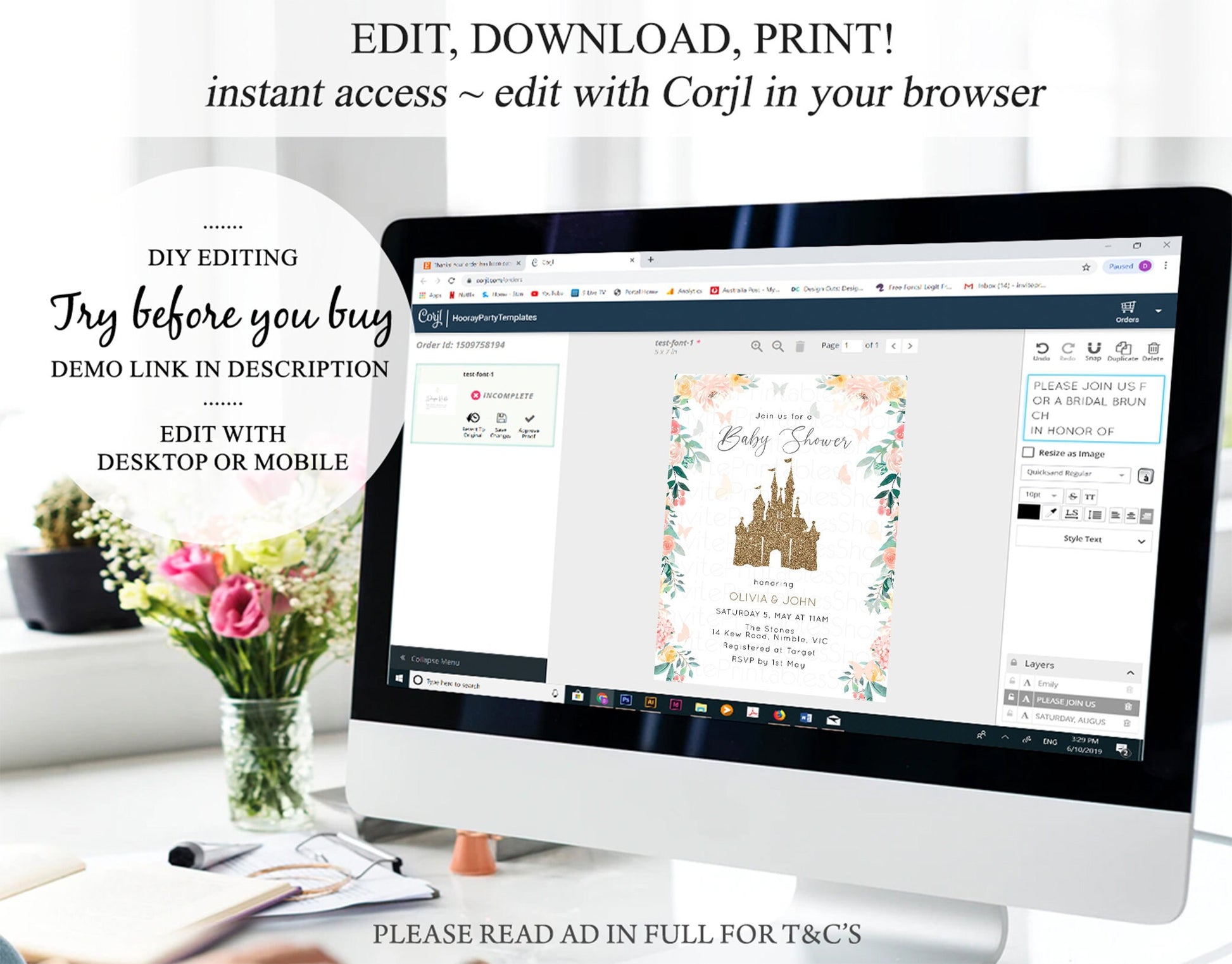 Princess Baby Shower Castle Invitation Glitter Castle Invitation Glitter Pastel Florals Secret Garden Enchanted Magical Butterflies Flutters