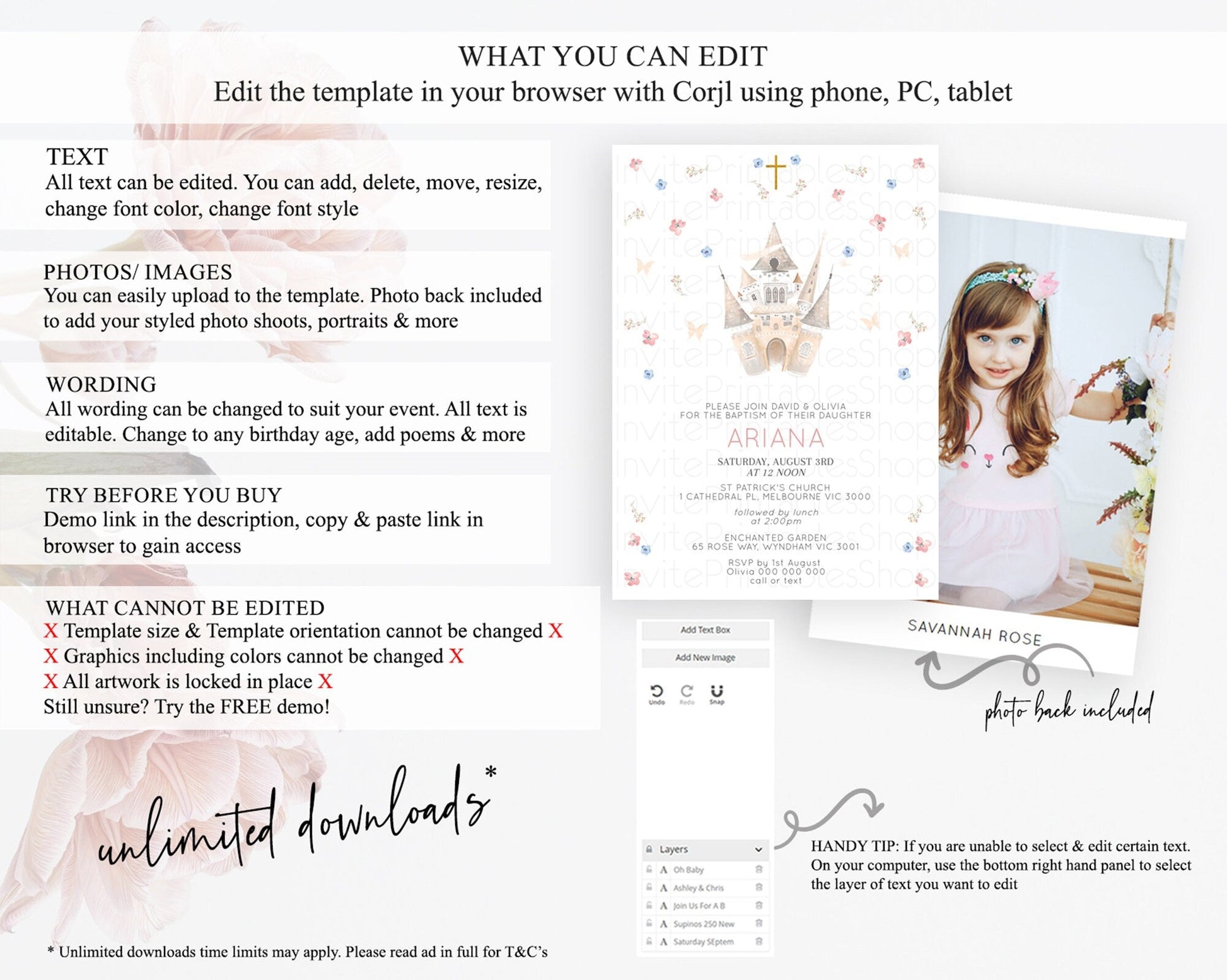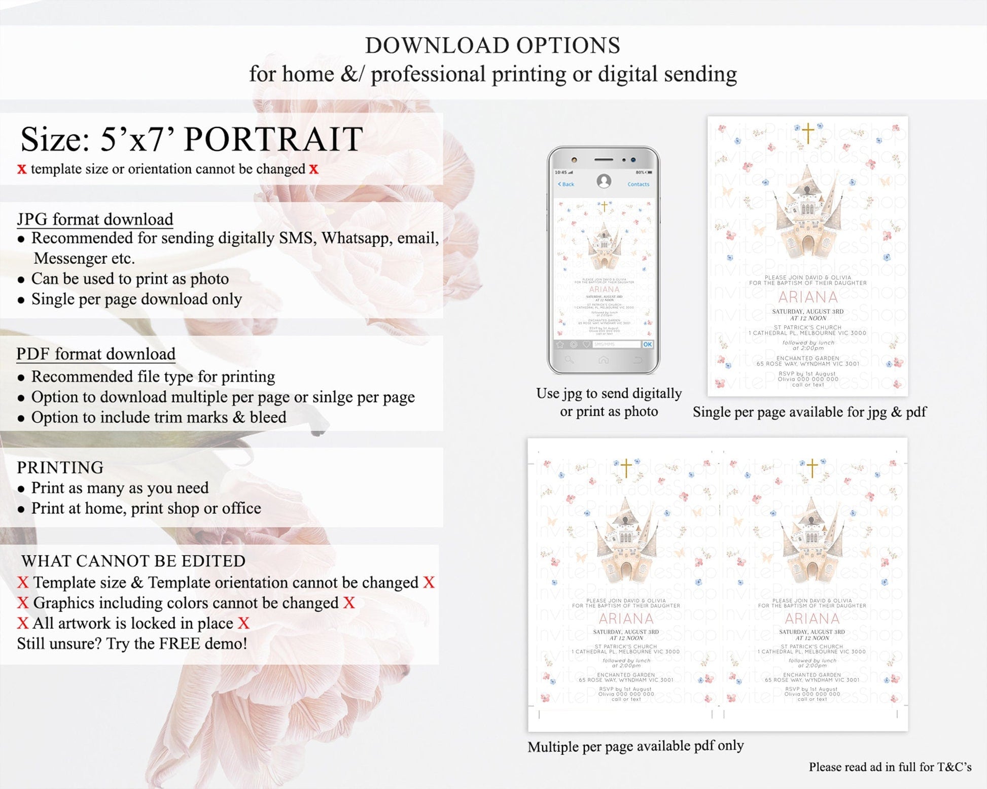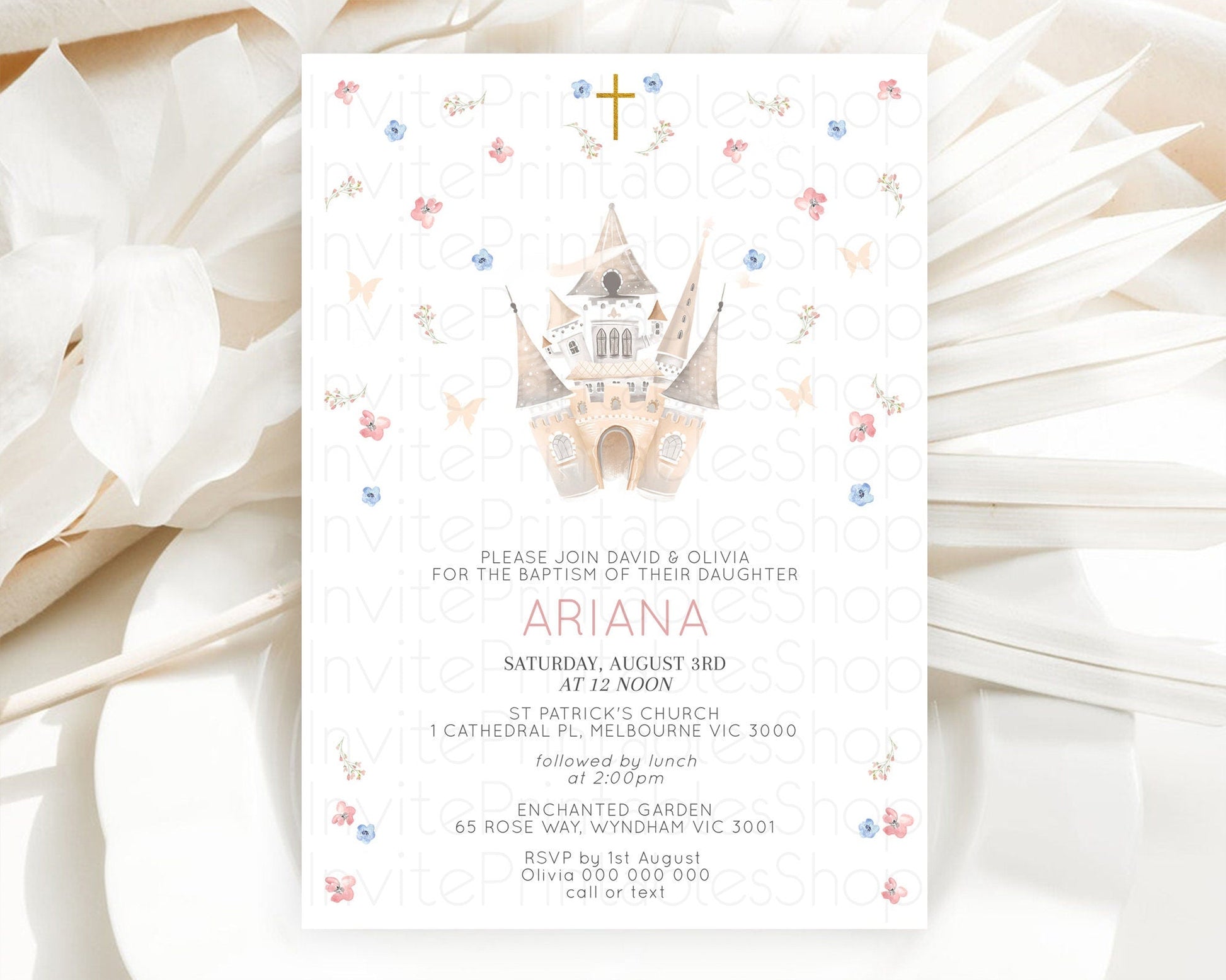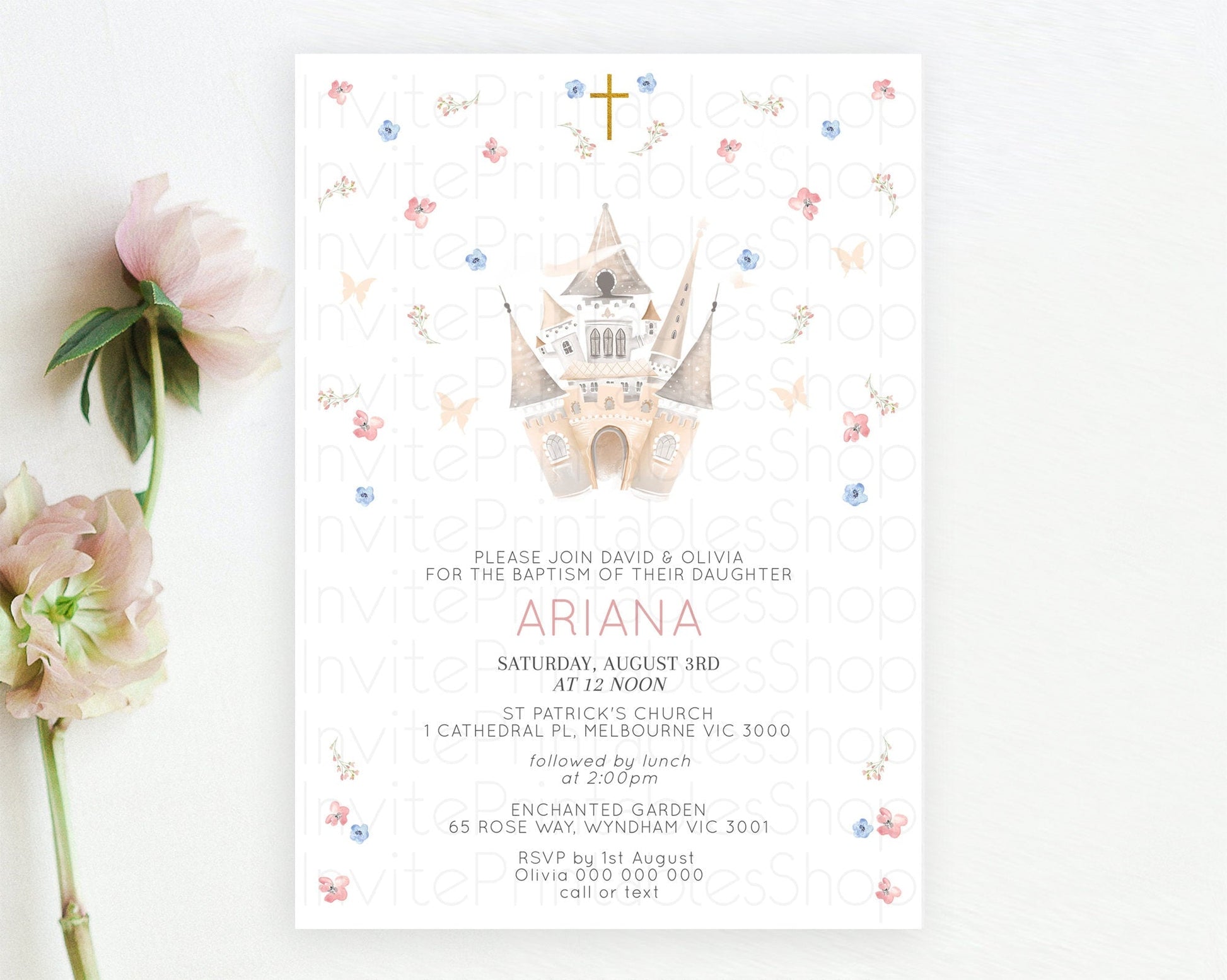 Princess Baptism Invitation Enchanted Castle Baptism 1st Birthday Invitation Royal Party Pastel Floral Secret Garden Christening D10364