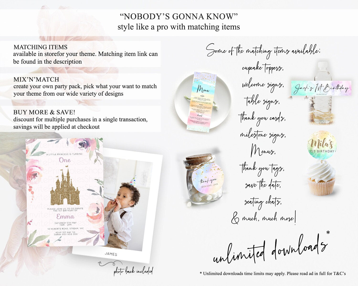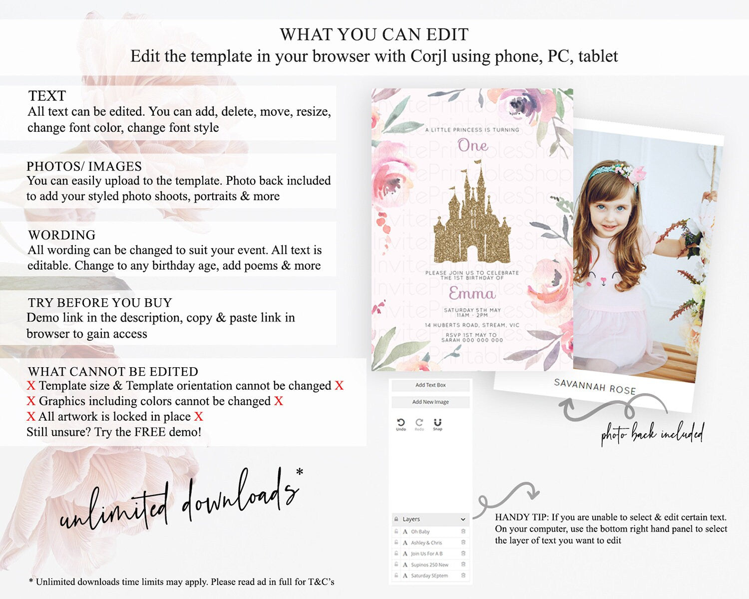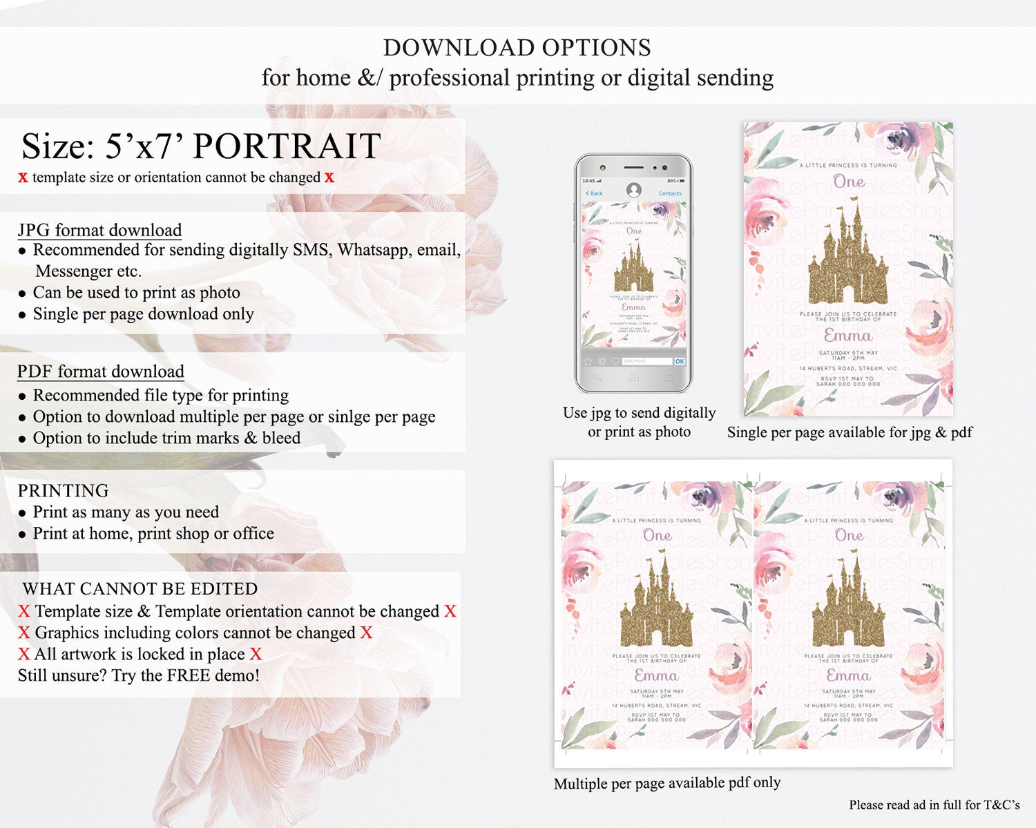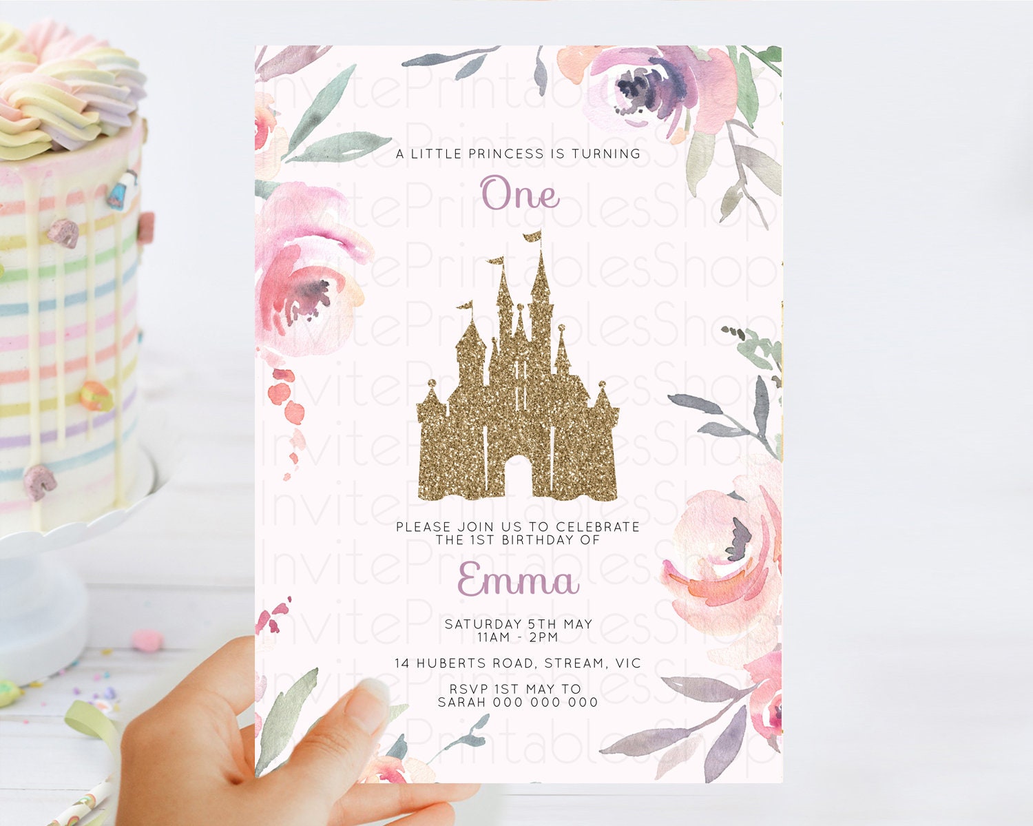 Princess Birthday Invitation Castle Invitation Royal Birthday Fairy Tale Enchanted Castle Pastel Floral Garden 1st First Birthday D10195