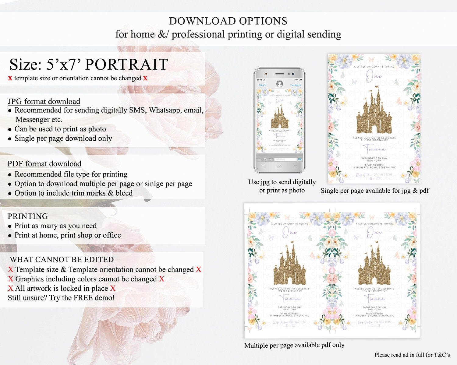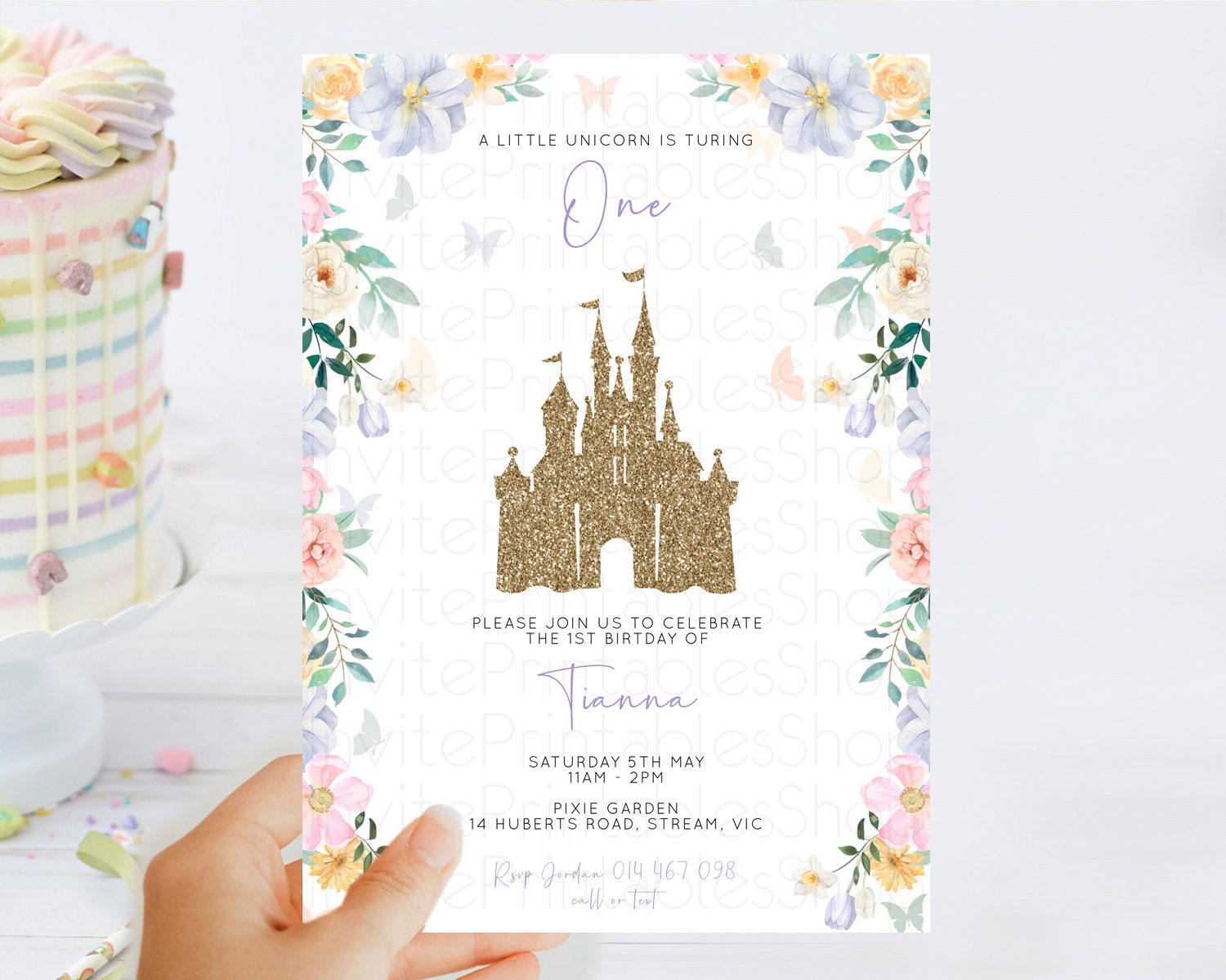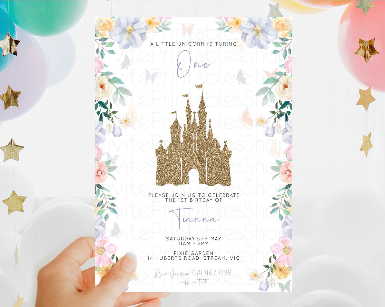 Princess Birthday Invitation Castle Invitation Royal Birthday Fairy Tale Enchanted Castle Pastel Floral Garden 1st First Birthday D10469