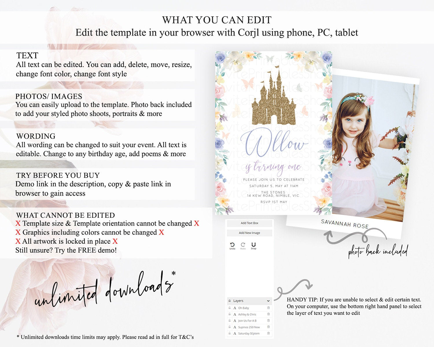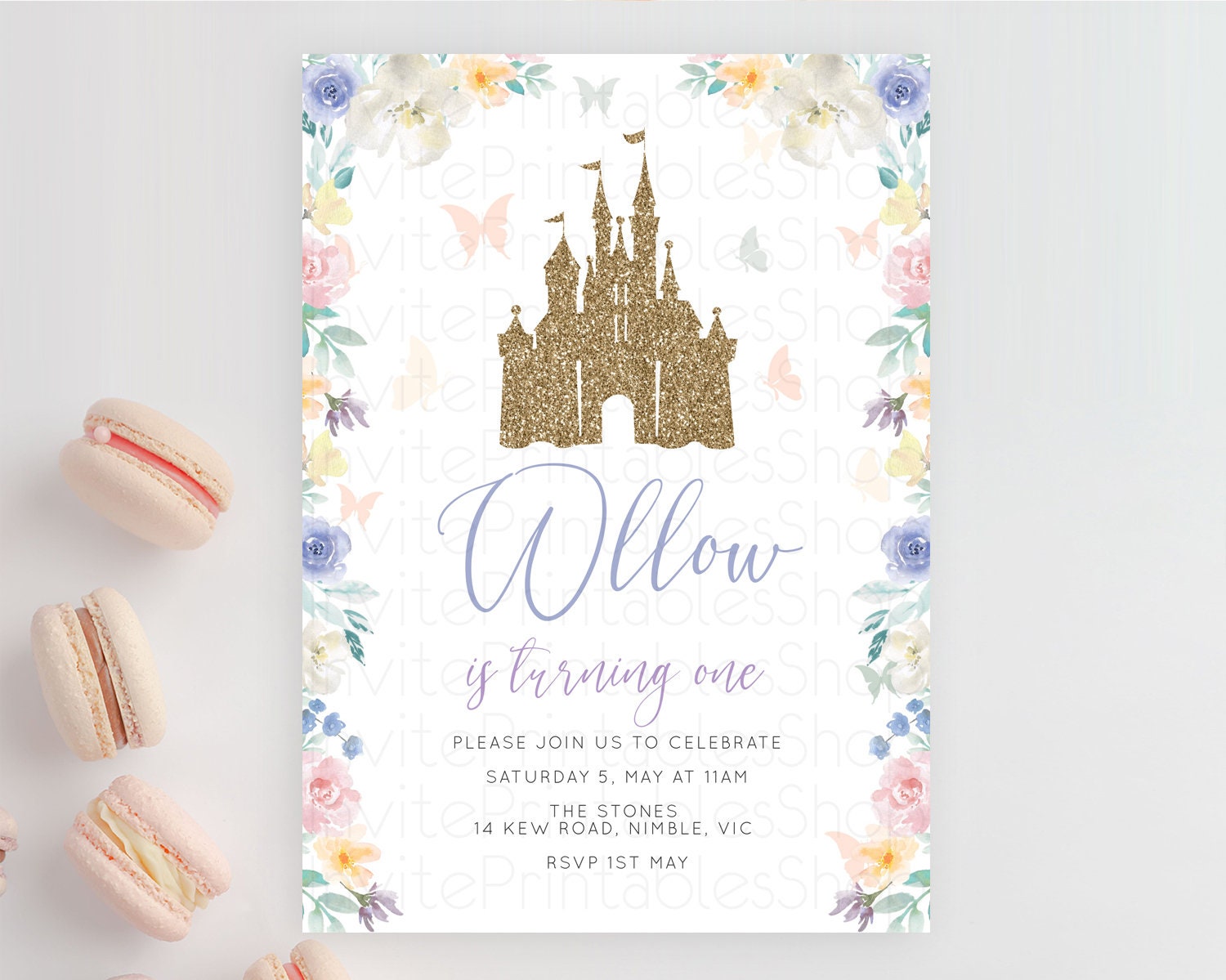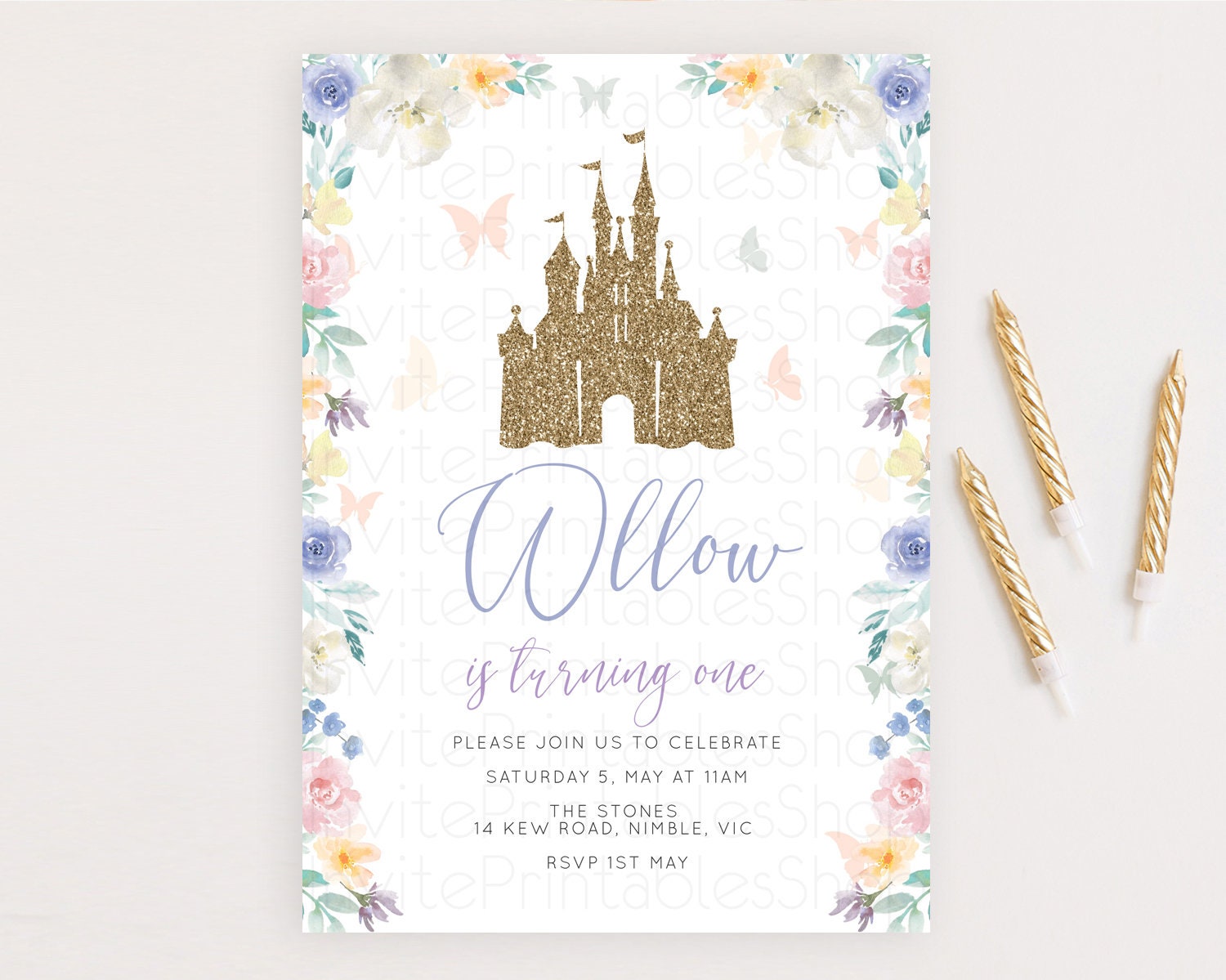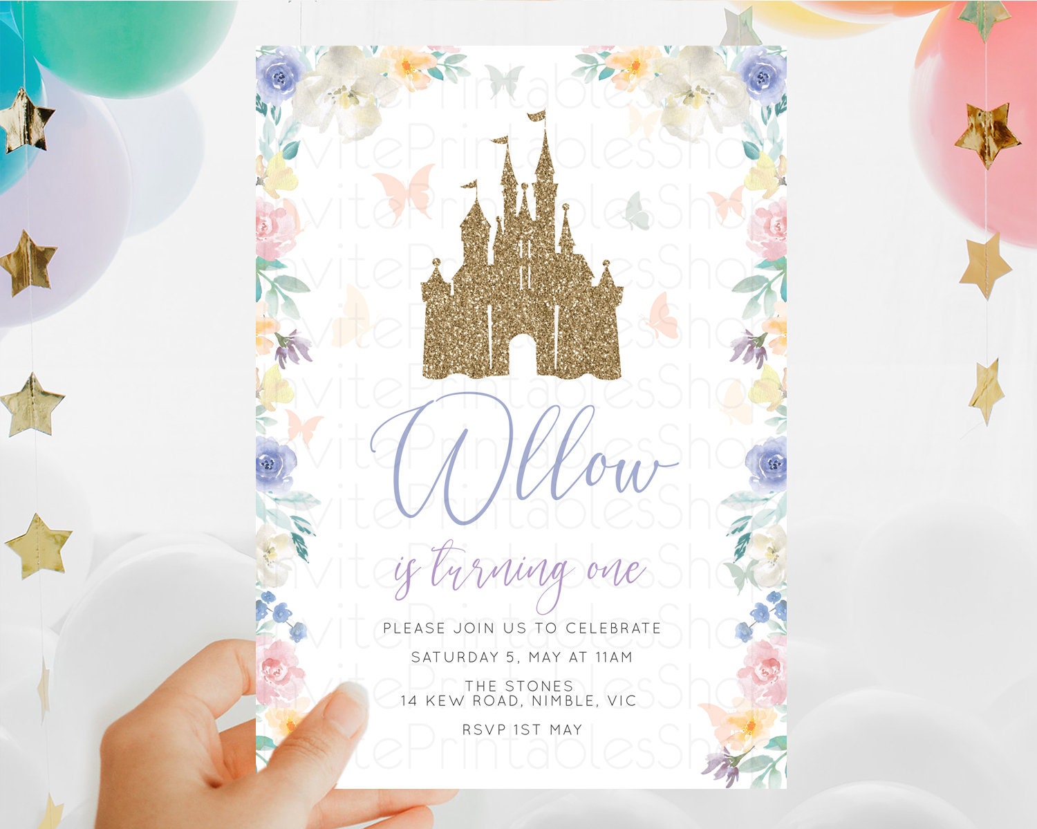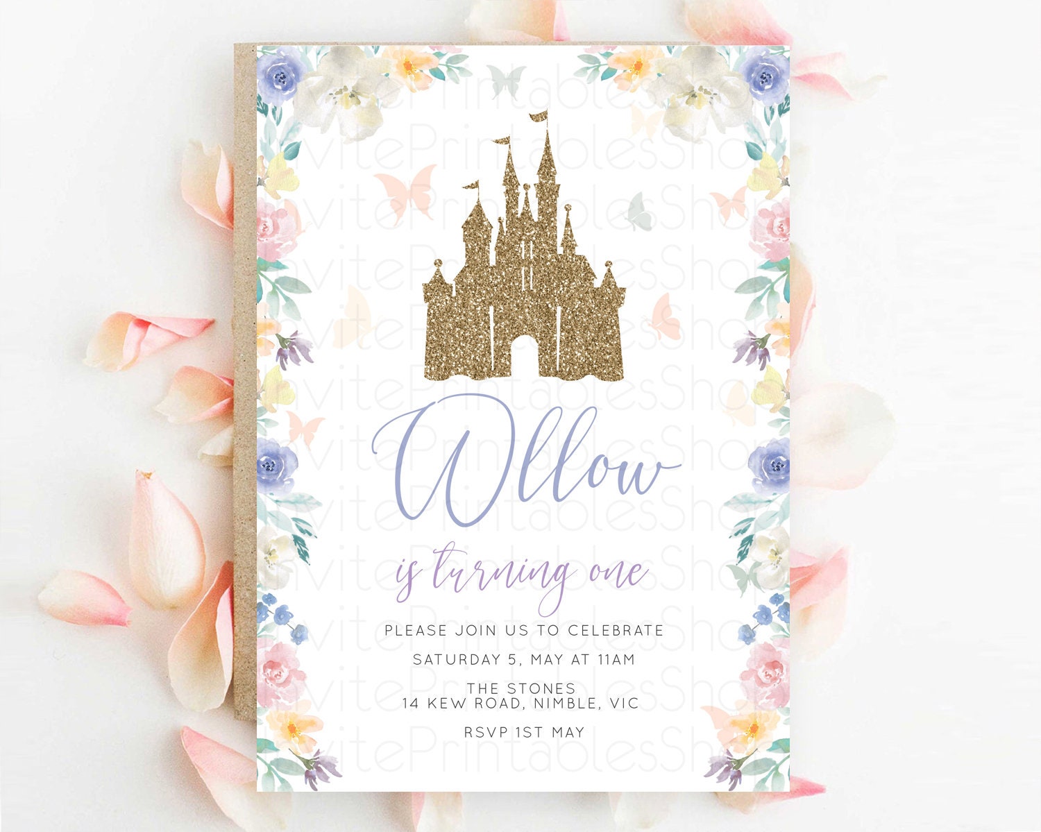 Princess Birthday Invitation Castle Invitation Royal Birthday Fairy Tale Enchanted Castle Pastel Floral Garden 1st First Birthday D10931
