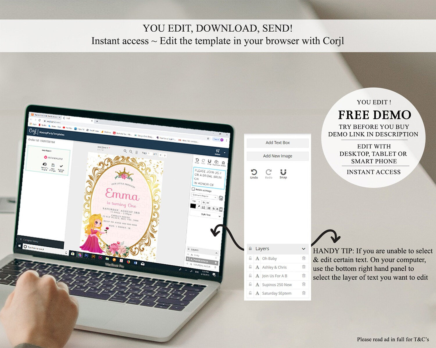 Princess Birthday Invitation Castle Invitation Royal Birthday Fairy Tale Enchanted Mirror Pastel Floral Garden 1st First Birthday D10130