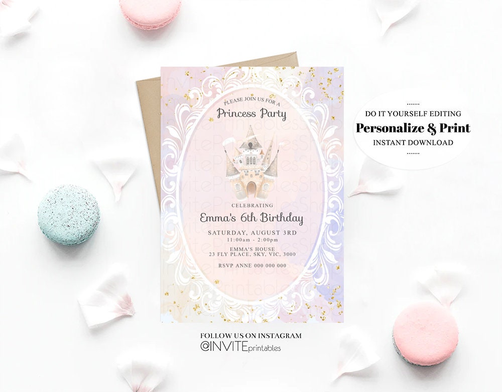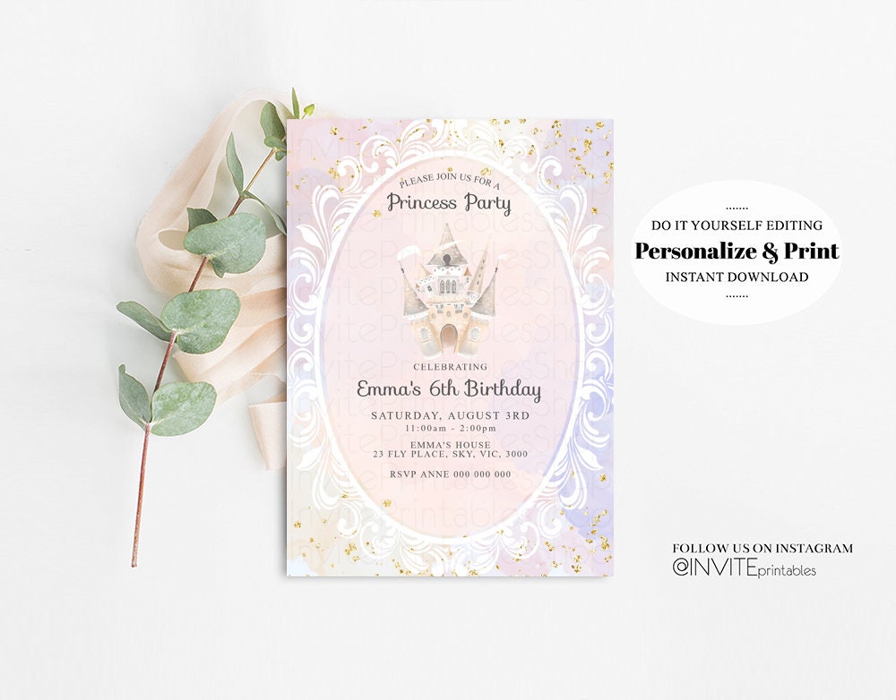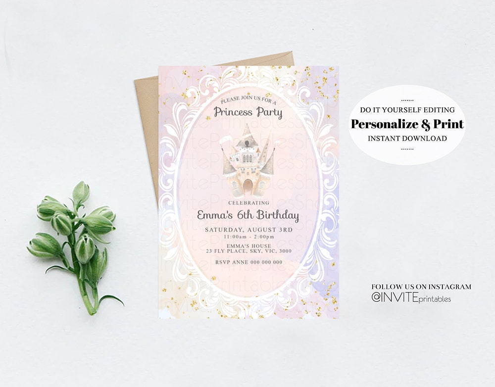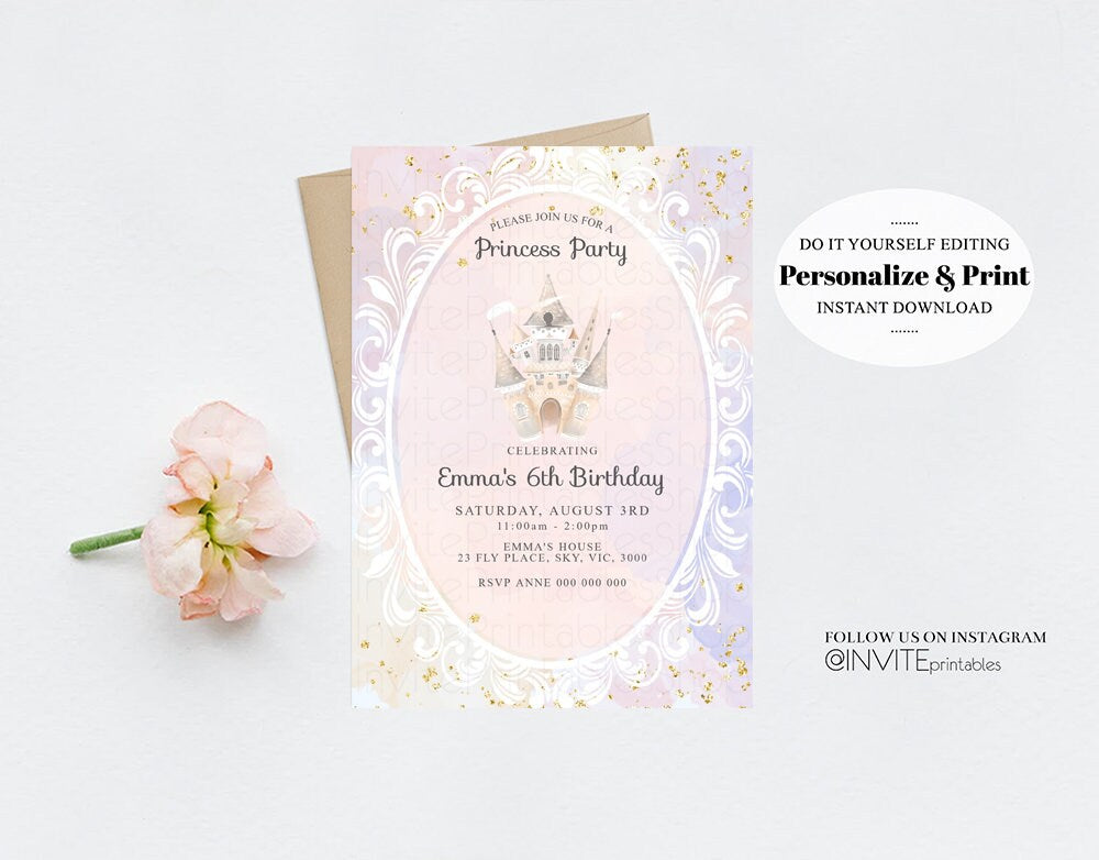 Princess Birthday Invitation Enchanted Castle Invite Royal Celebration Watercolor Mirror Mirror Gold Foil Glitter Purple Editable
