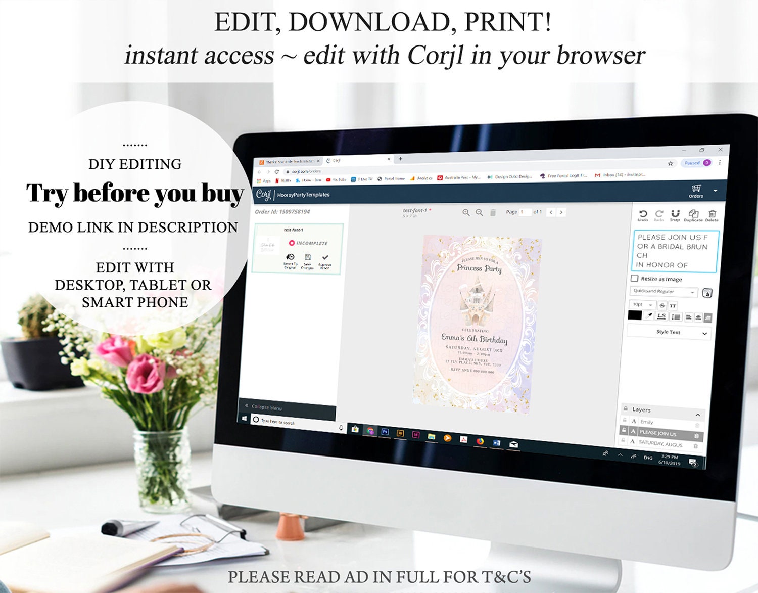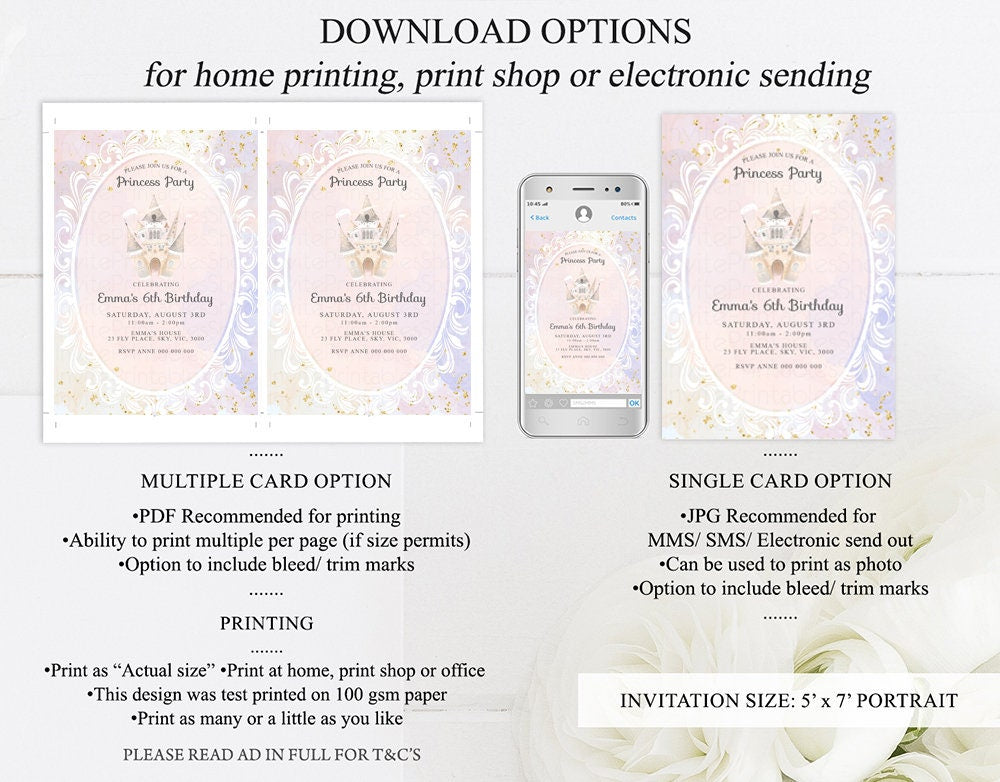 •Try before you buy! • DEMO LINK- https://www.corjl.com/d/AN9D0 PLEASE READ AD IN FULL!! •Digital file. No physical item will be shipped •Do it yourself Editing. Edit online with Corjl or Edit with your mobile ITEM DETAILS Invitation size: 5’x7’ File type: PDF, JPEG Resolution: 300DPI PDF FILE OPTIONS: •Recommended for printing •Ability to print multiple per page (if size permits) •Option to include bleed/ trim marks JPG FILE OPTIONS: •Recommended for MMS/ SMS/ Electronic send out •Can be used to print as photo •Option to include bleed/ trim marks EDITING • Do it yourself editing • Mobile editing is available • Google chrome is the recommend browser for Corjl. Please download here for FREE: https://www.google.com/chrome/ • Using other browsers may not show all of Corjl's editing features • Editing on a desktop/ laptop computer is recommended to access all of Corjl features • Mobile editing is available, please use a desktop/ laptop computer to access all of Corjl features DOWNLOADS & EXPIRY •Maximum 3 downloads on the same edit •Link expires 30 days after purchase DOWNLOAD NOTICE •Once you have reached your download limits &/ “approve proof” in Corjl. You will not be able to request further downloads on your design. Further download requests are not permitted WHAT IS EDITABLE •Text - colours, fonts, size, move, delete & rotation. •Please see demo link for what you can and can’t do WHAT YOU CAN’T EDIT •Template size •Template orientation •Graphics CAN NOT BE deleted, moved, or changed in colour •Please see demo link for what you can and can’t do HOW TO 1. Choose design template & checkout on Etsy. 2. Email will be sent from Corjl. Follow link to access template 3. Edit, save & print INSTRUCTIONS •Instructions on how to edit your design have been written by Corjl and will be available with your purchase. PRINTING •Colours can vary depending on the monitor, printer & cardstock •Can be printed at home •Home printing will require you to select the high quality print settings, select appropriate paper thickness & click "Actual size" prior to you printing •This design was test printed on 100 gsm paper •Can be printed at local print shop. Please check printing requirements & any printing restrictions prior to purchase PERSONAL USE ONLY. This item cannot be shared, re-sold, or used commercially for profit. REFUND POLICY •We are unable to provide a refund/ exchange on commenced & completed work, instant downloads or self-editing link templates. Please use the demo link to work out if this product is right for you. Copyright © 2018 by InvitePrintablesShop PTY LTD All rights reserved. This file or any portion thereof may not be reproduced or resold without the express written permission of the publisher (including edits to the design). Our files are provided as high-resolution PDFs – the end result is dependent upon the printer and paper used. If using a professional printing company, InvitePrintablesShop are not responsible for their specific printing requirements, paper or colour quality. Any changes required to the template are not included with your purchase – the files come as described in the listing only and cannot be changed. Thank you for visiting Invite Printables Shop:)