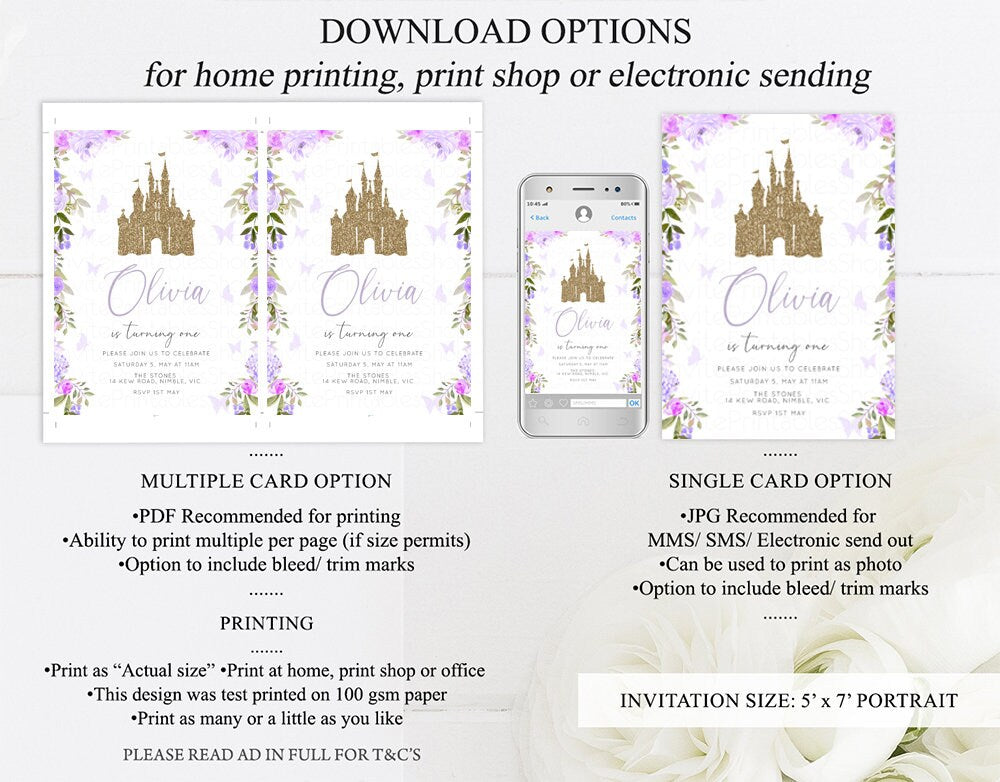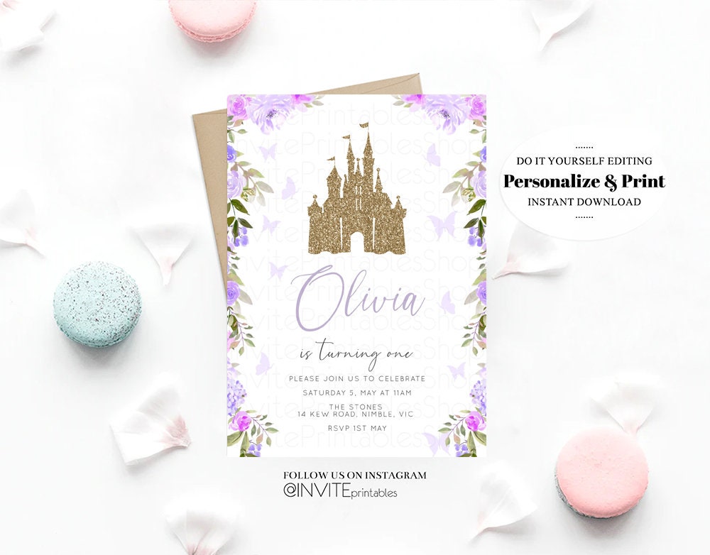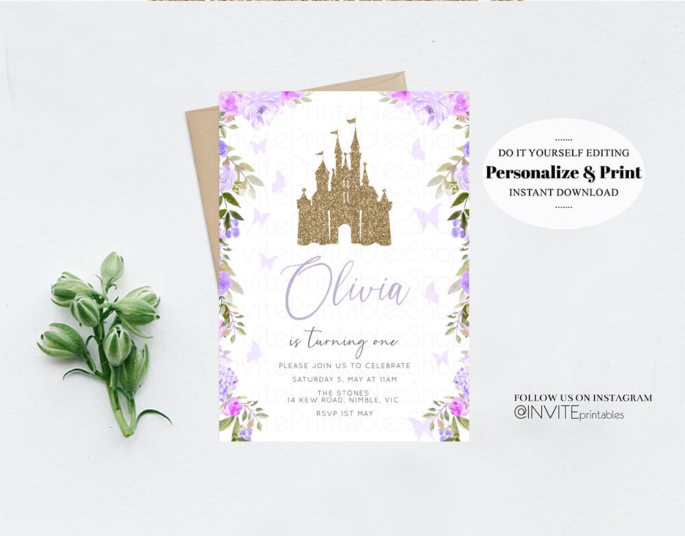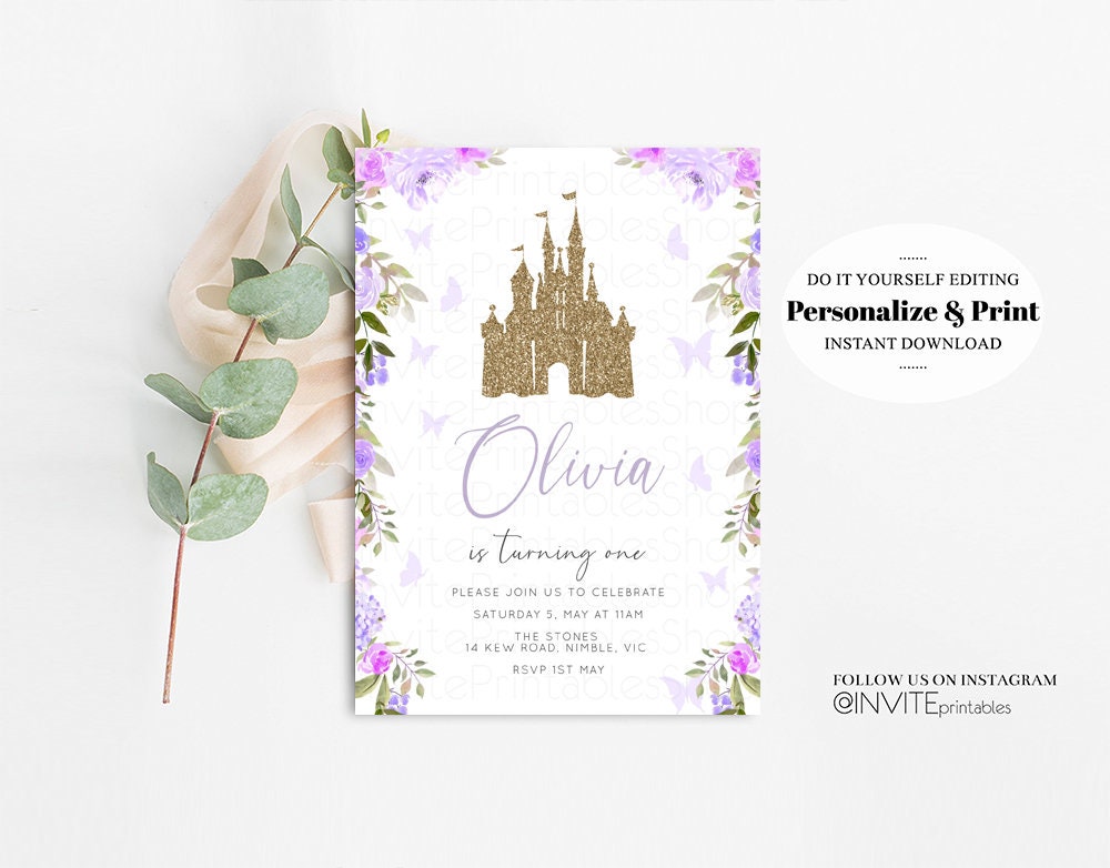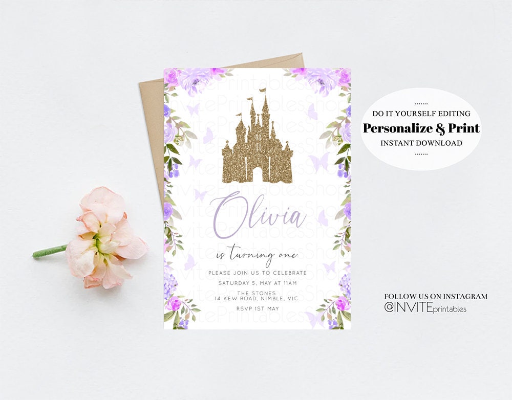 Princess Birthday Invitation Gold Glitter Enchanted Castle Royal Celebration Fairytale Floral Garden Purple Be Our Guest Custom Invite