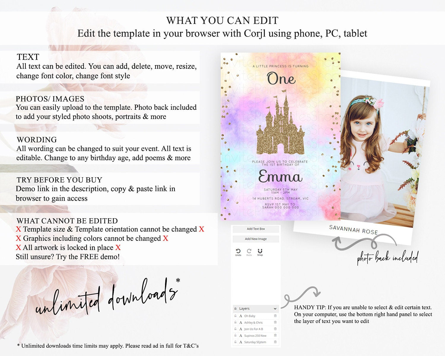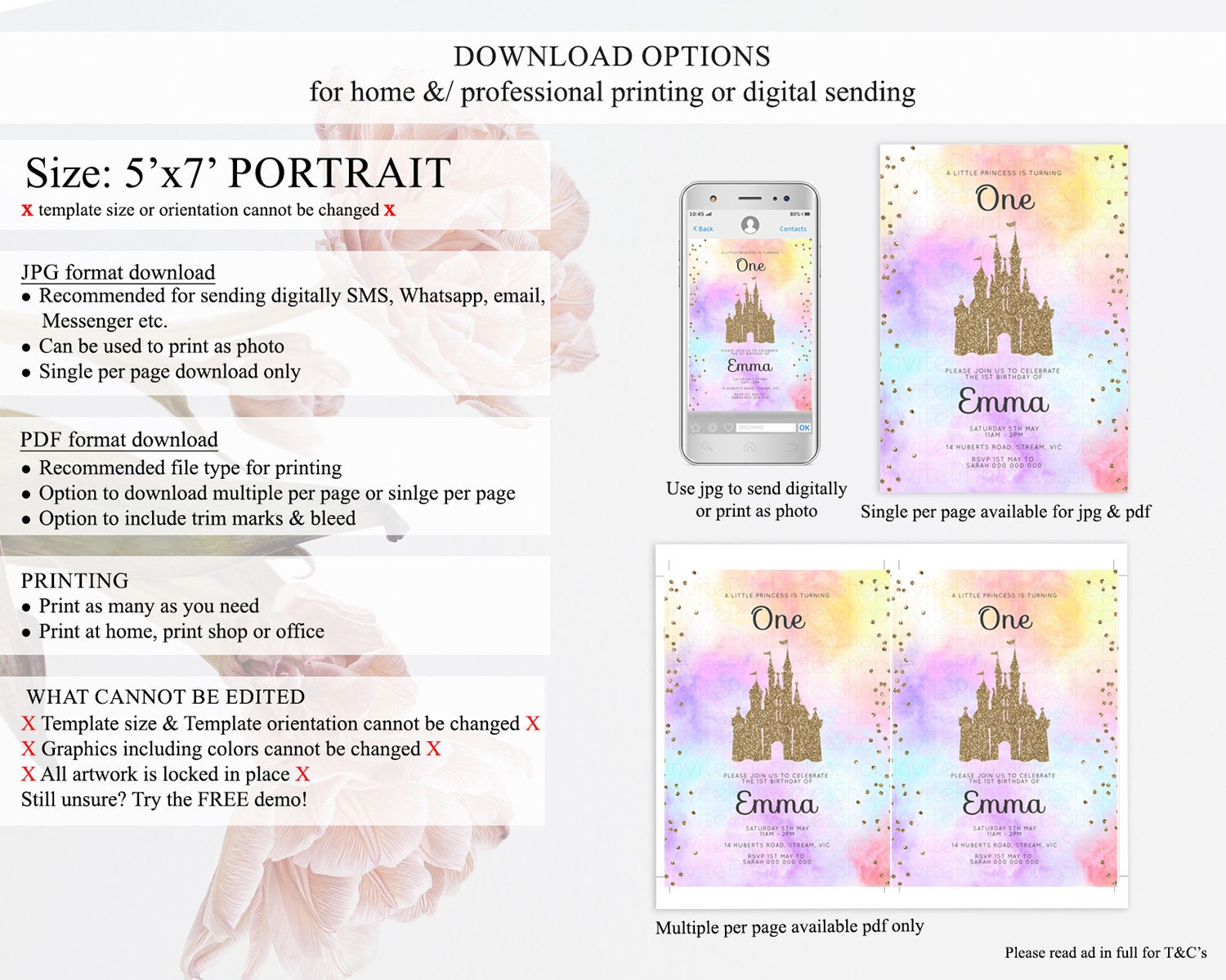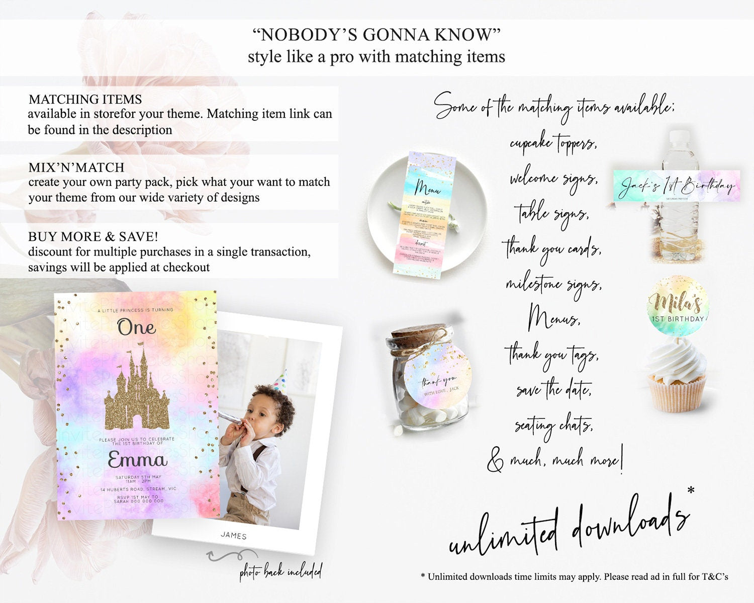 Princess Birthday Invitation Princess Invitation Pastel Invitation Royal Birthday Rainbow Color Enchanted Castle 1st First Birthday D10148