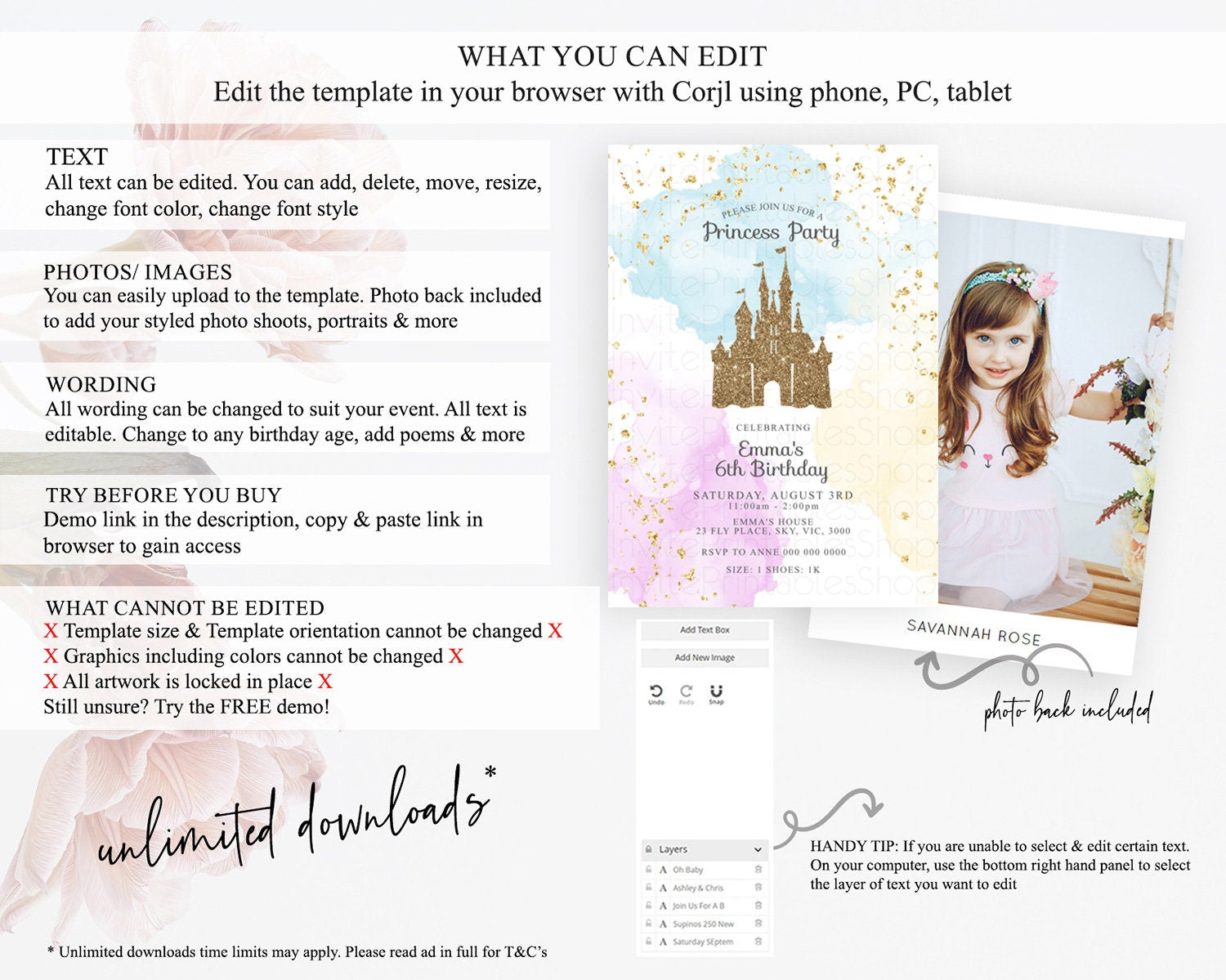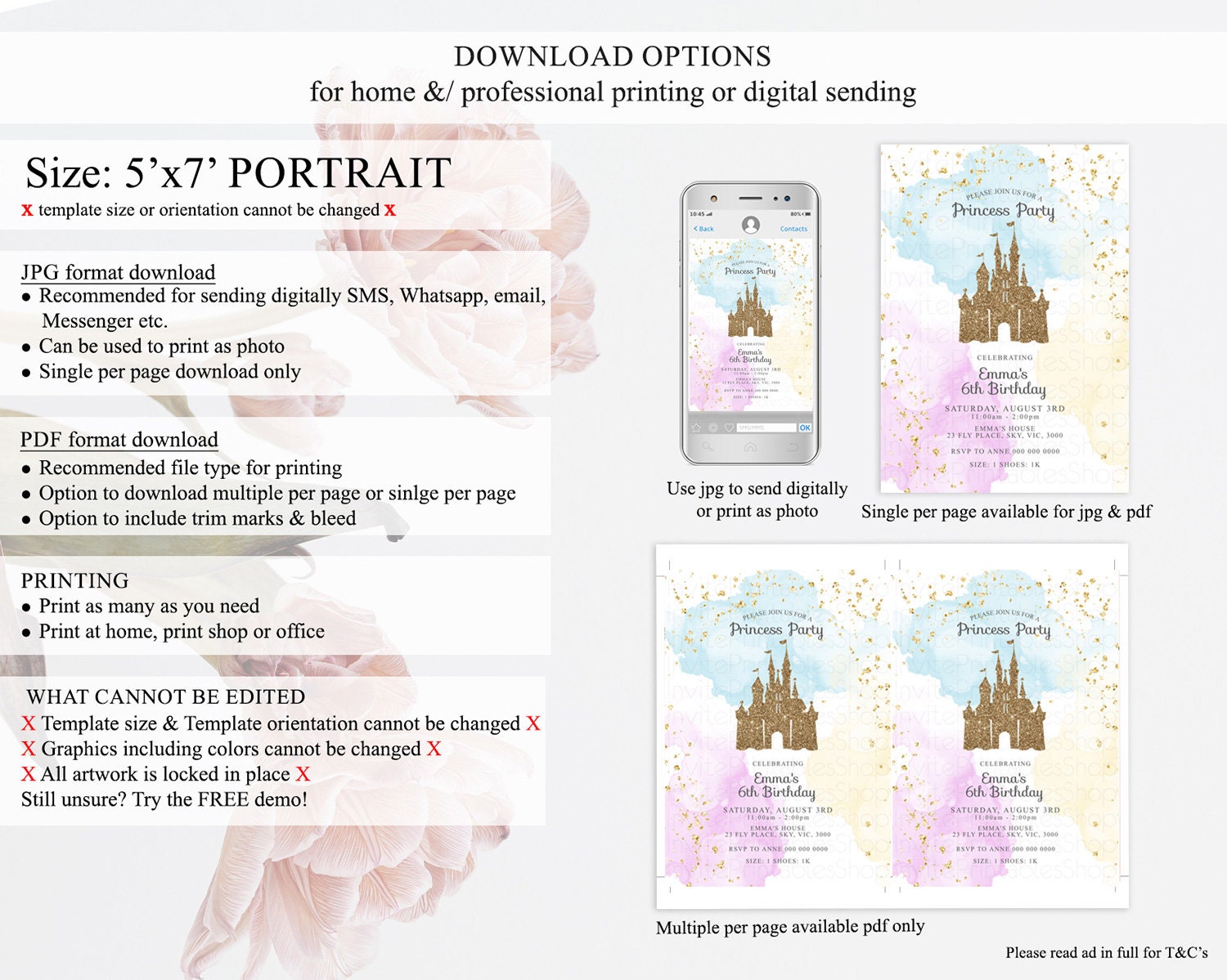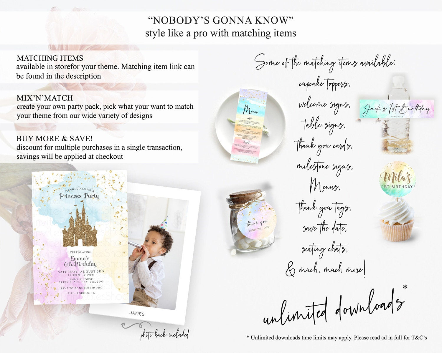 Princess Birthday Invitation Princess Invitation Pastel Invitation Royal Birthday Rainbow Color Enchanted Castle 1st First Birthday D10154