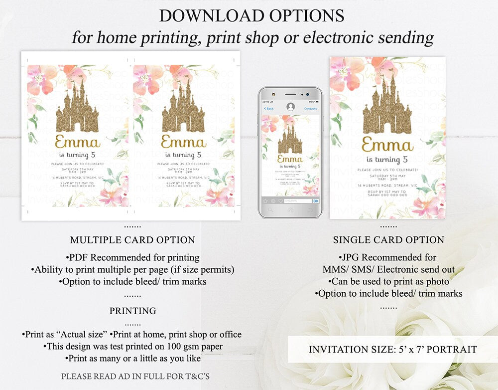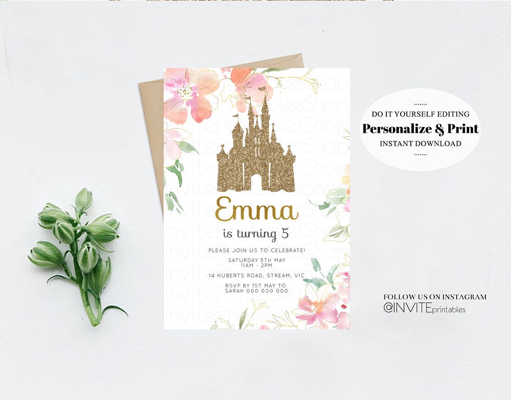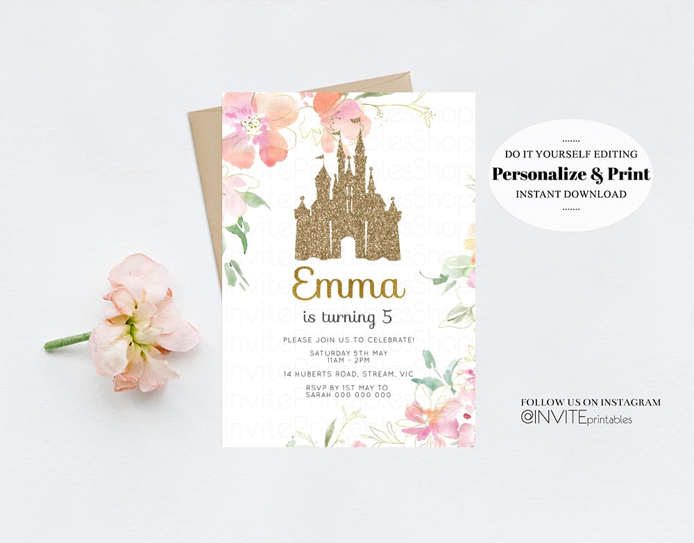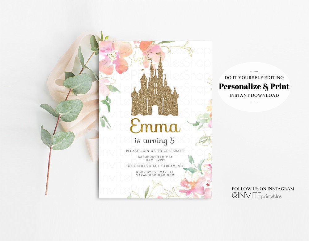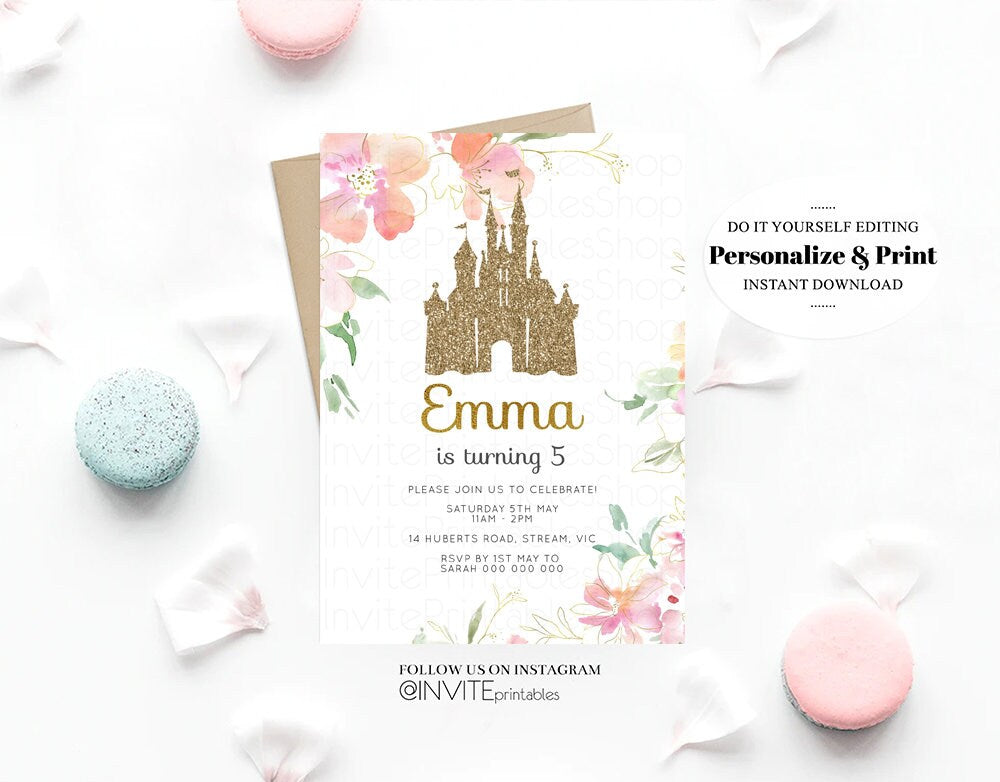 Princess Birthday Invitation Royal Castle Gold Glitter Enchanted Castle Floral Garden Pastel Pink Printable Editable Invite