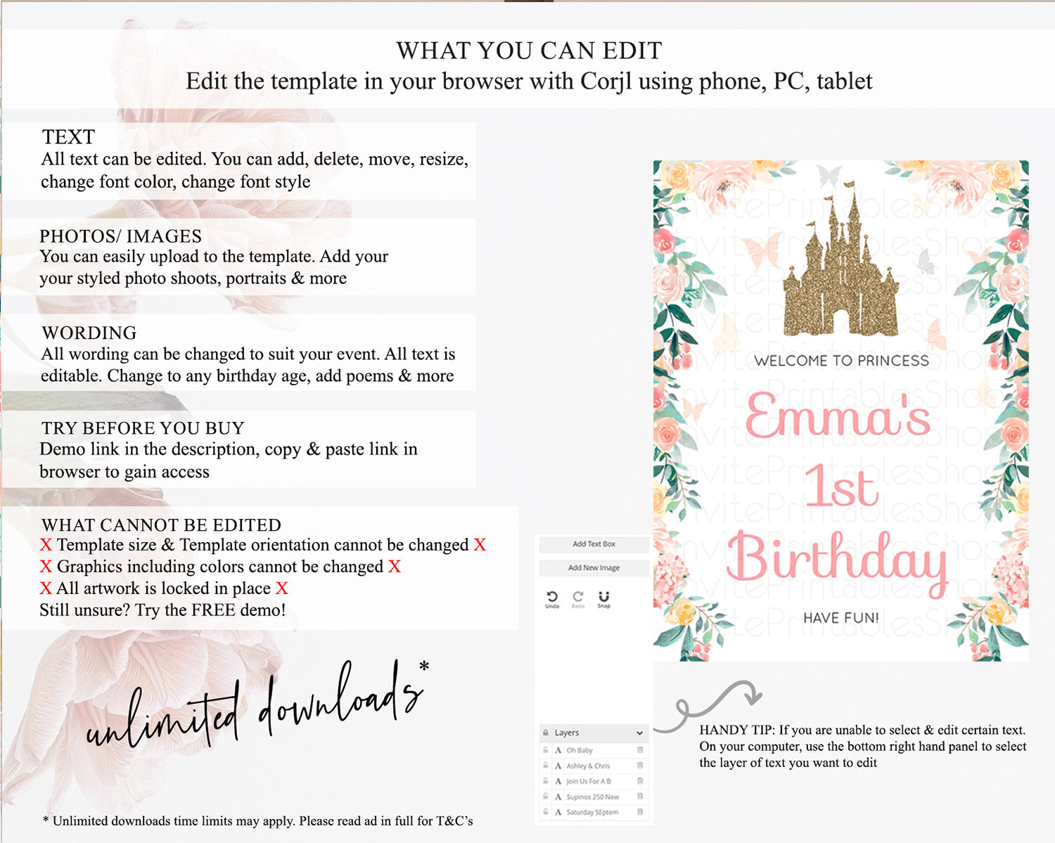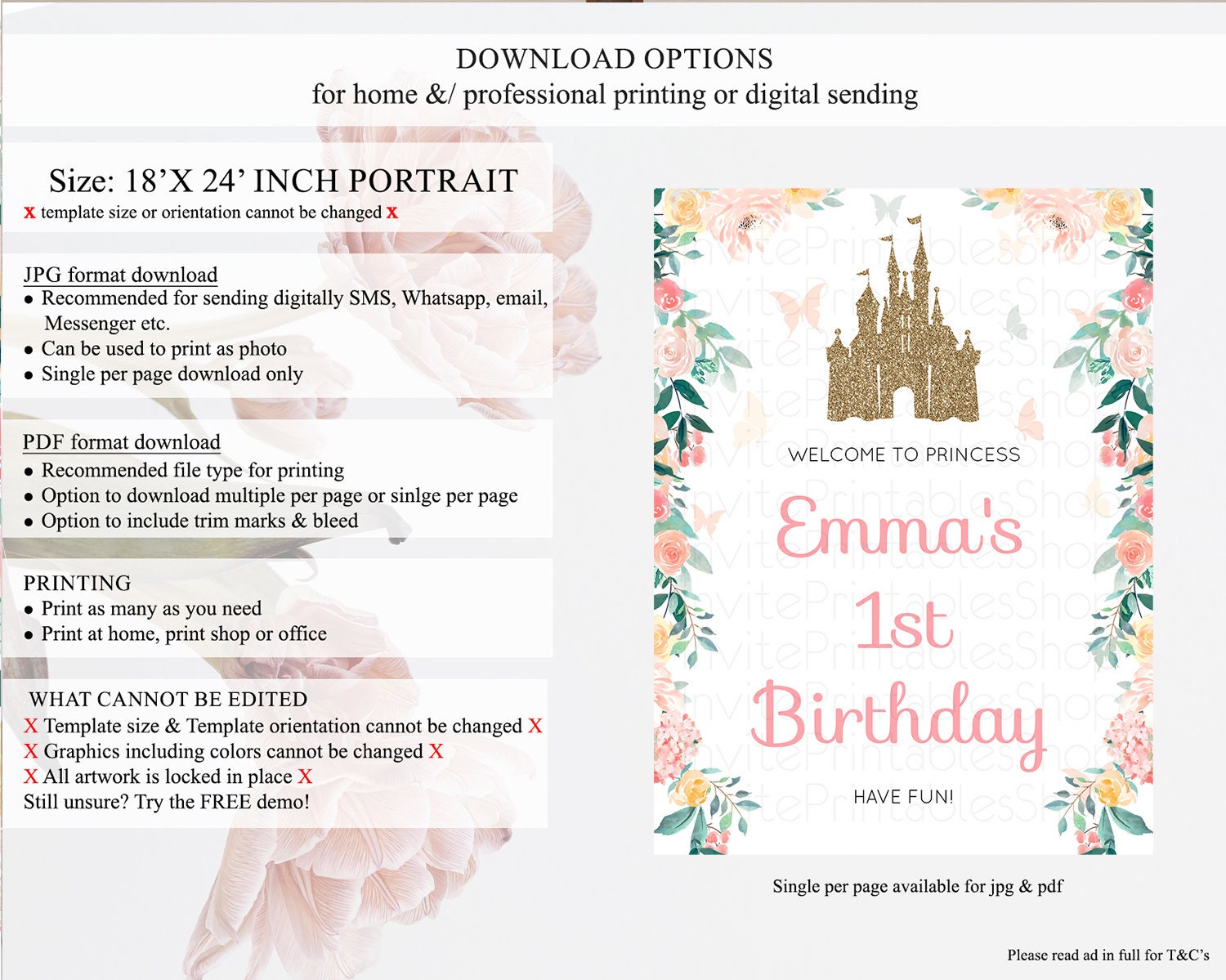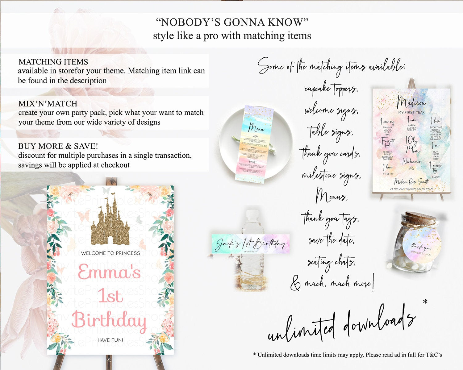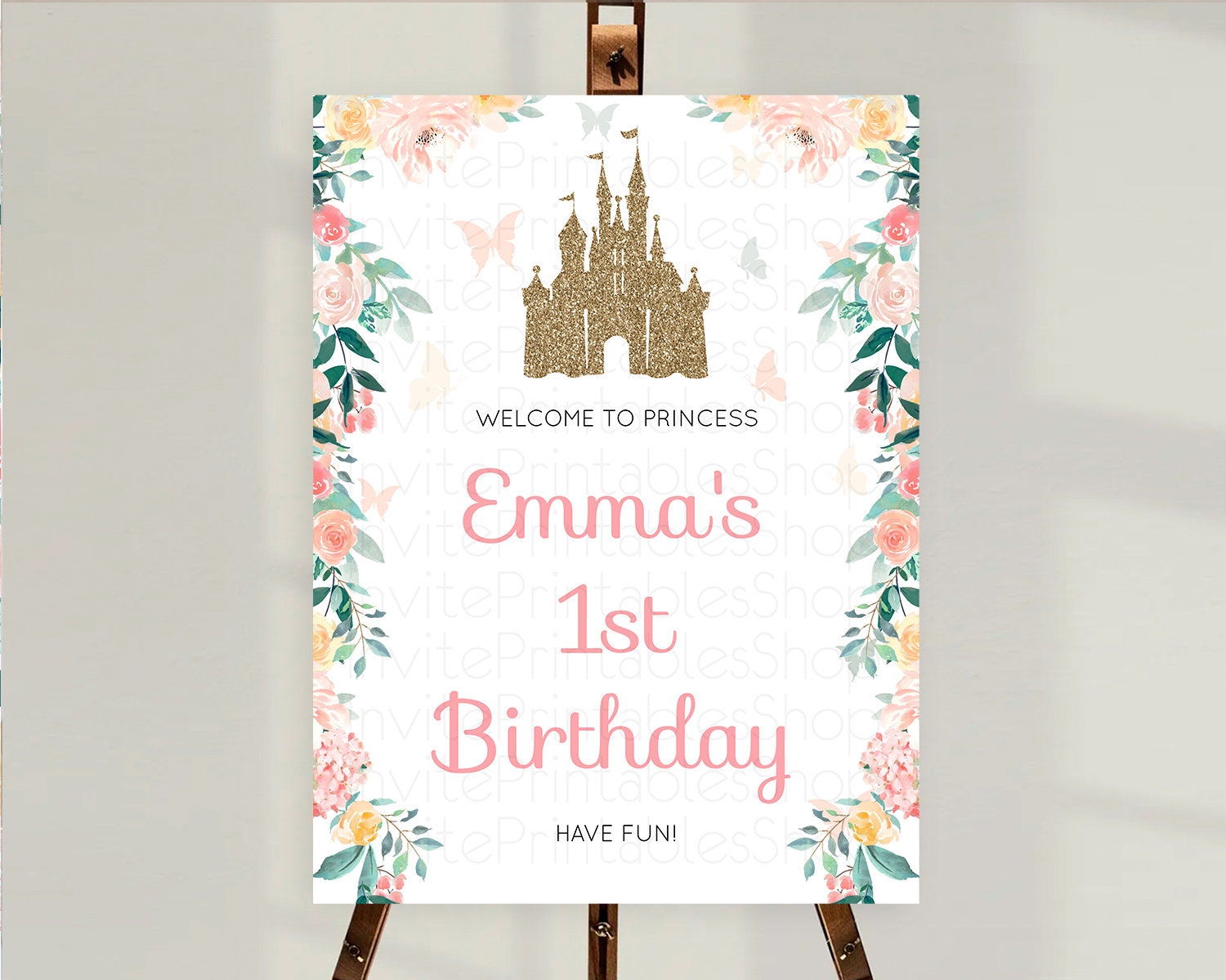 Princess Birthday Welcome Sign Castle Welcome Board Secret Garden Enchanted Castle Pastel Floral Garden First Birthday Welcome Sign D10429