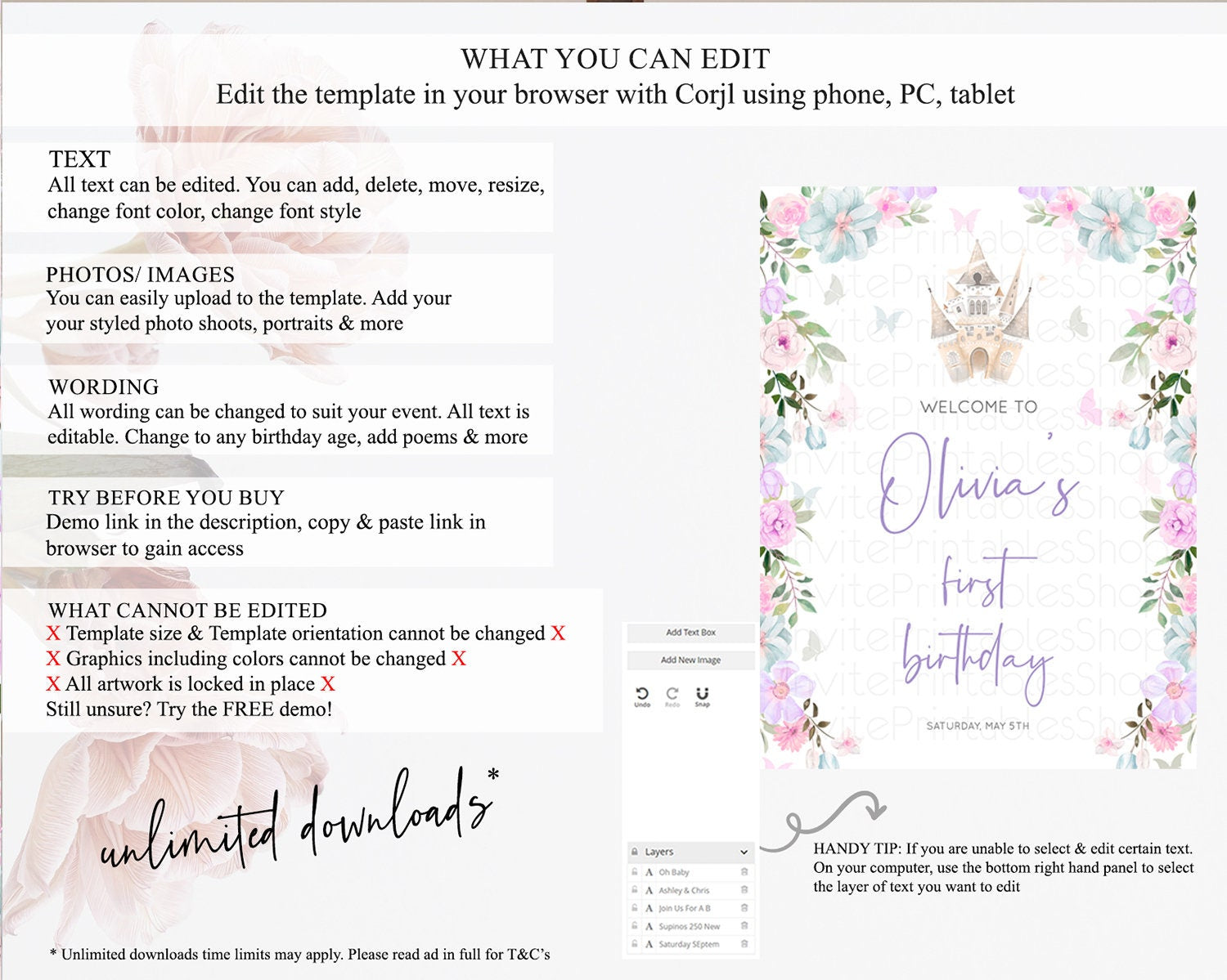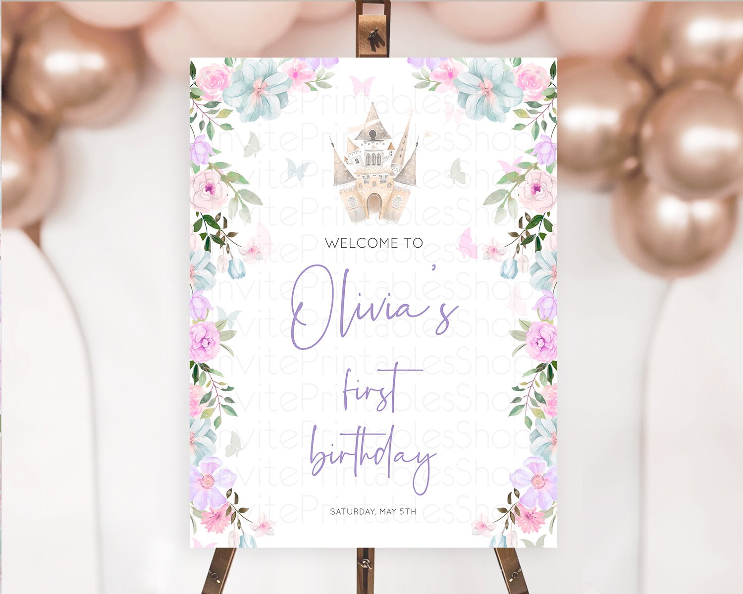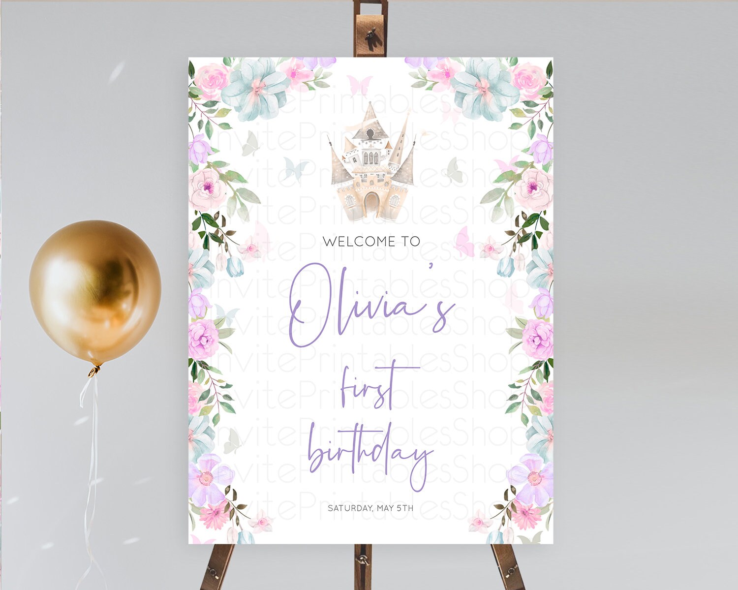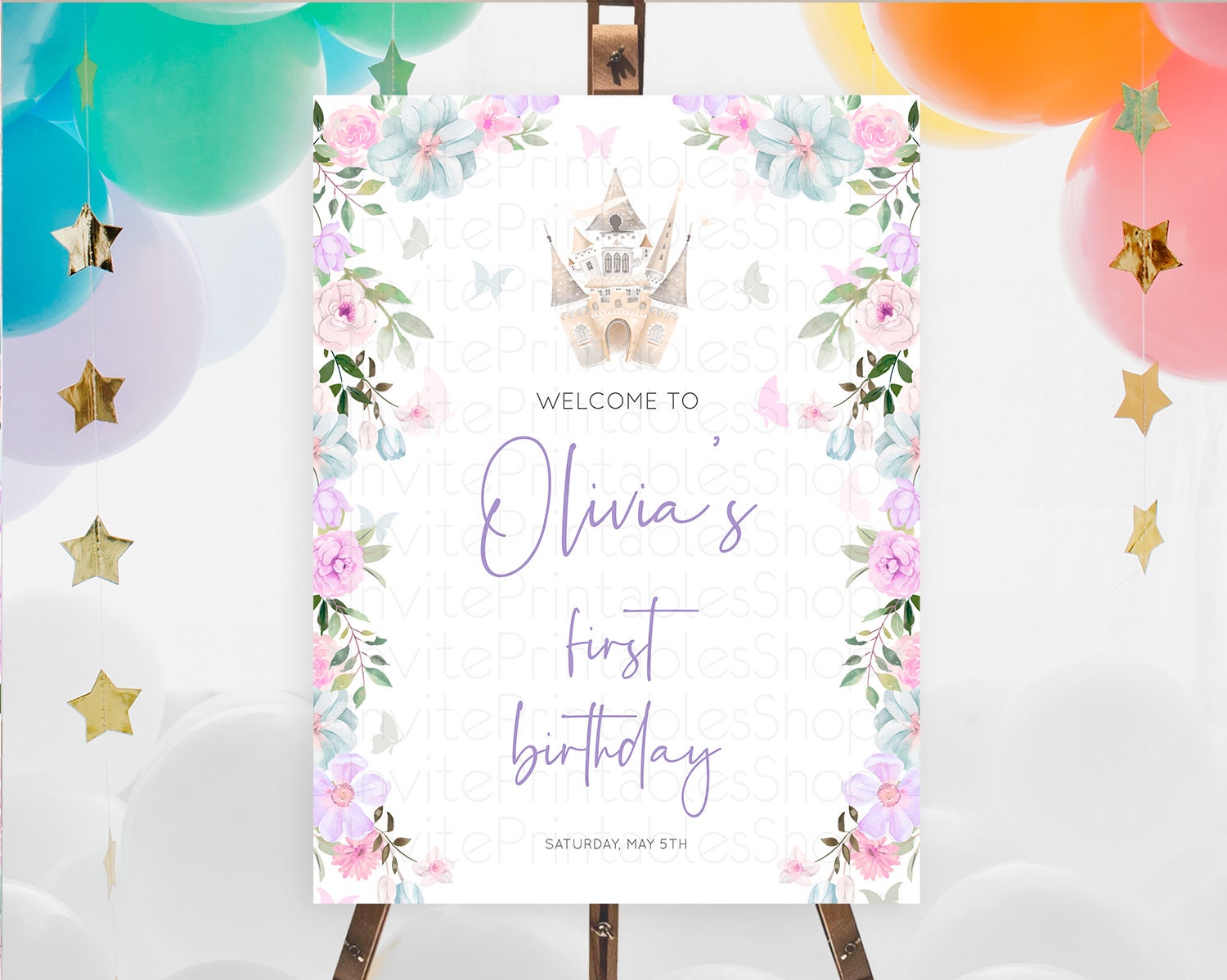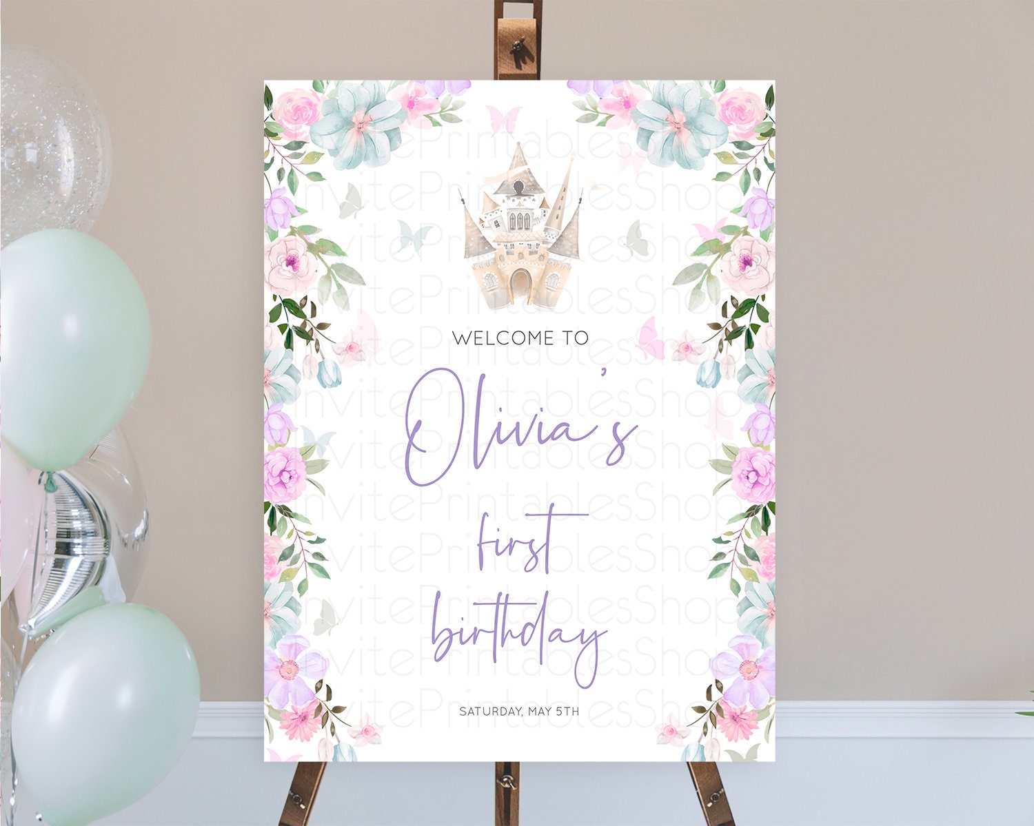 Princess Birthday Welcome Sign Castle Welcome Board Secret Garden Enchanted Castle Pastel Floral Garden First Birthday Welcome Sign D10471