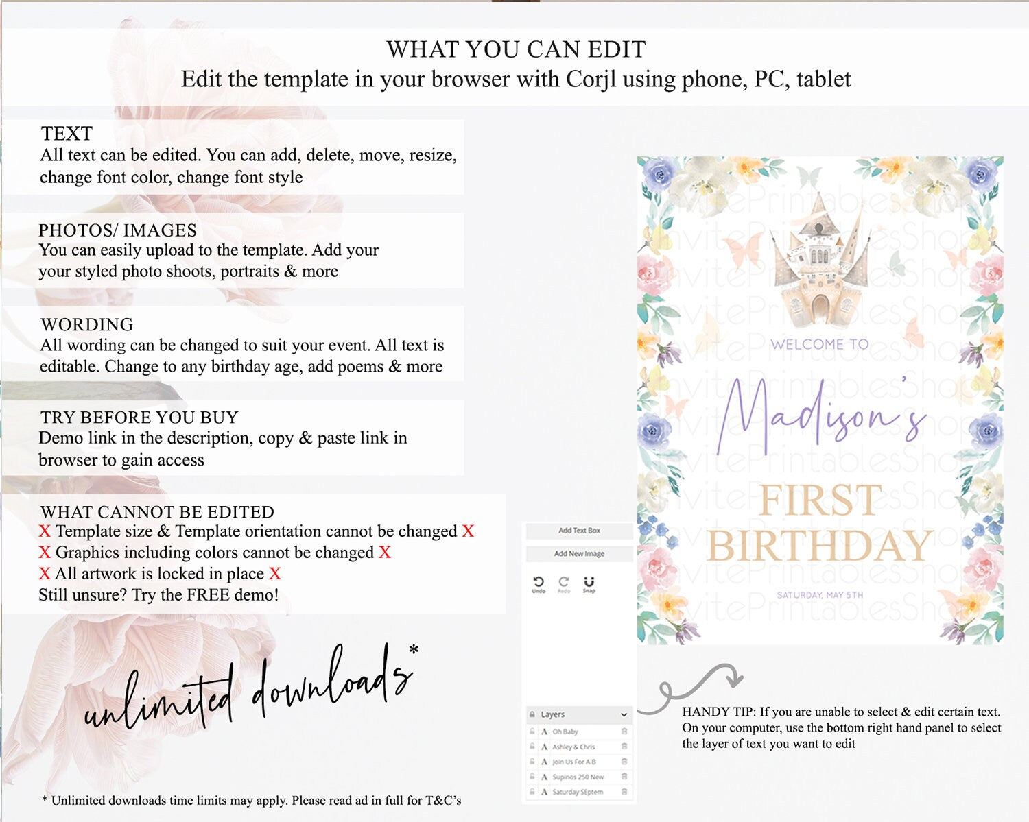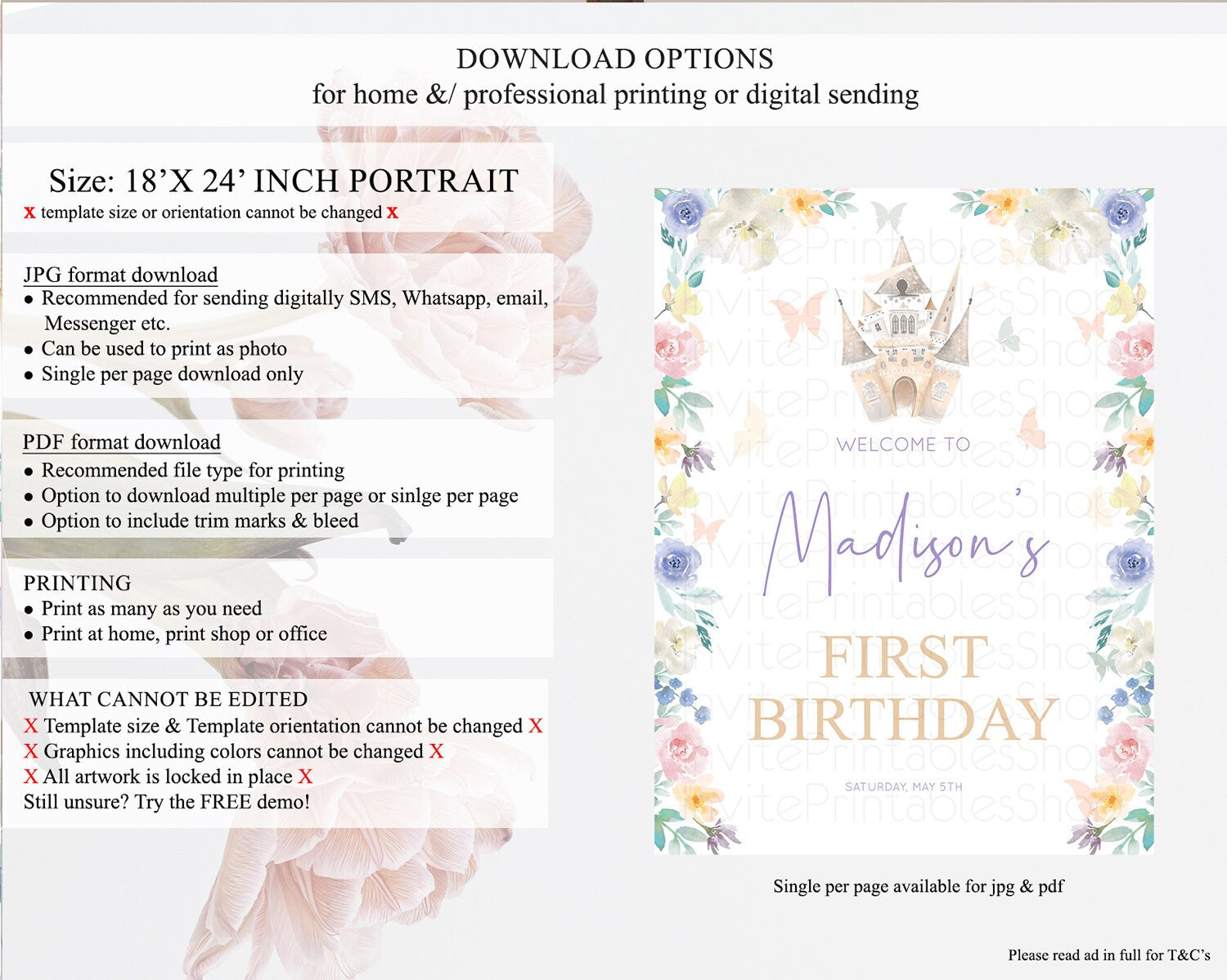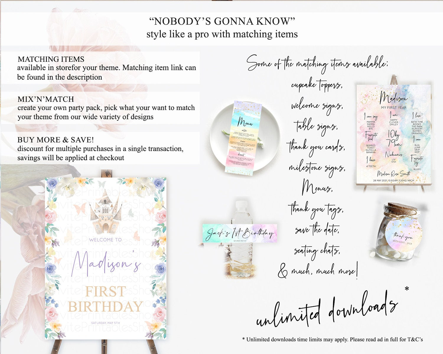 Princess Birthday Welcome Sign Castle Welcome Board Secret Garden Enchanted Castle Pastel Floral Garden First Birthday Welcome Sign D10709