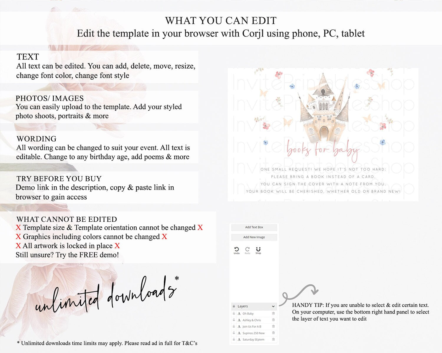Princess Books For Baby Card Castle Book Card Insert Secret Garden Enchanted Castle Pastel Floral Garden Baby Shower Poem Request D10364