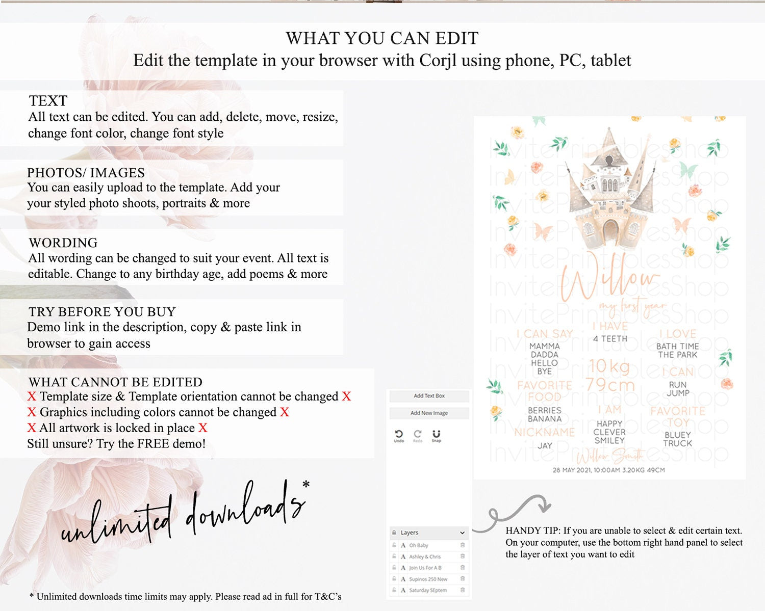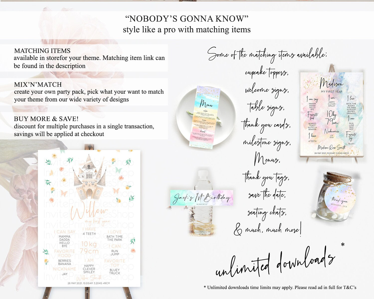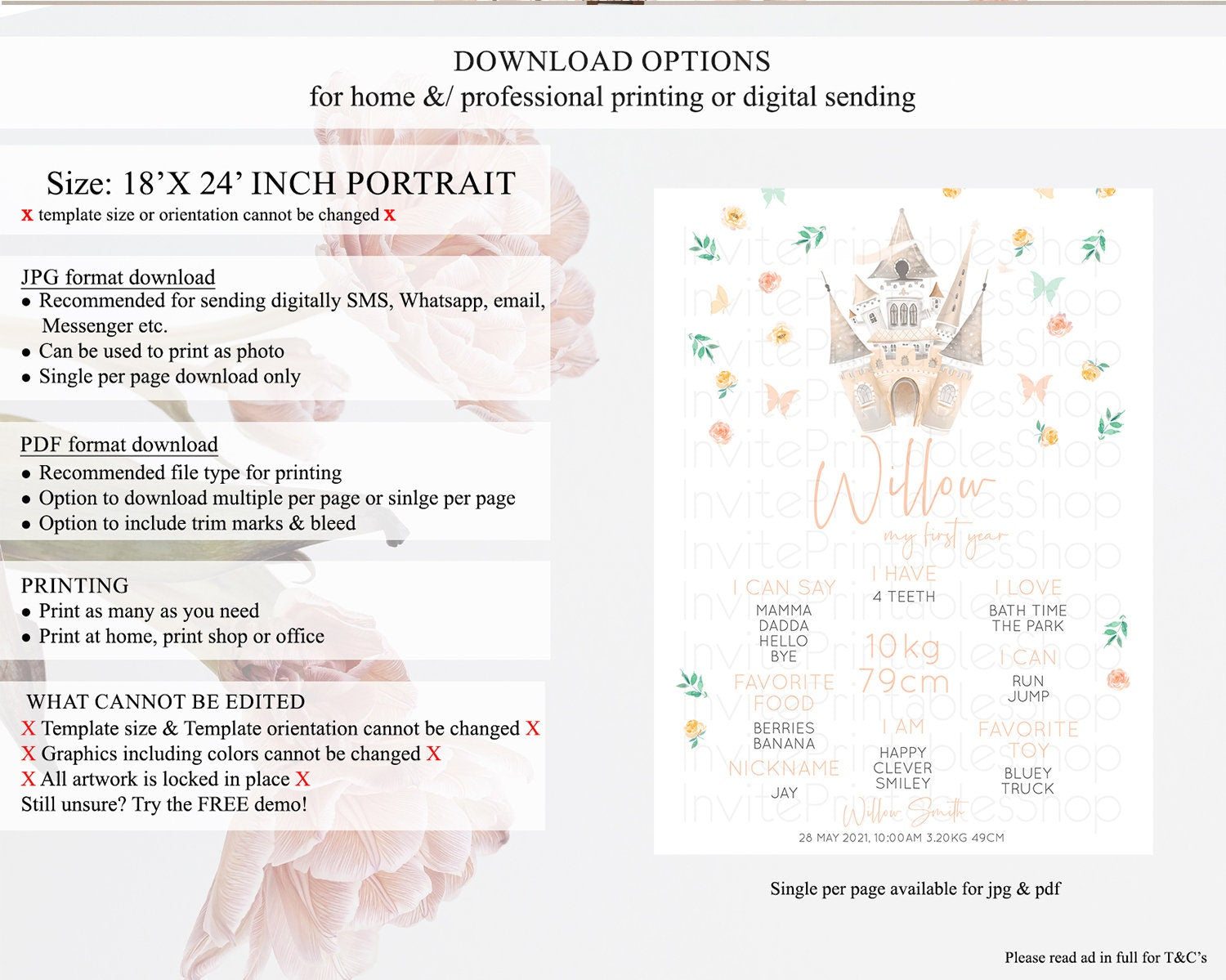 Princess First Birthday Milestone Poster Castle Milestone Board Secret Garden Enchanted Castle Pastel Floral Garden First Birthday D10363