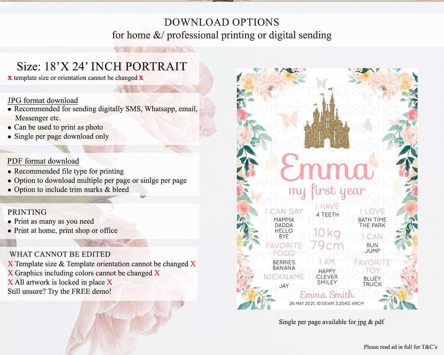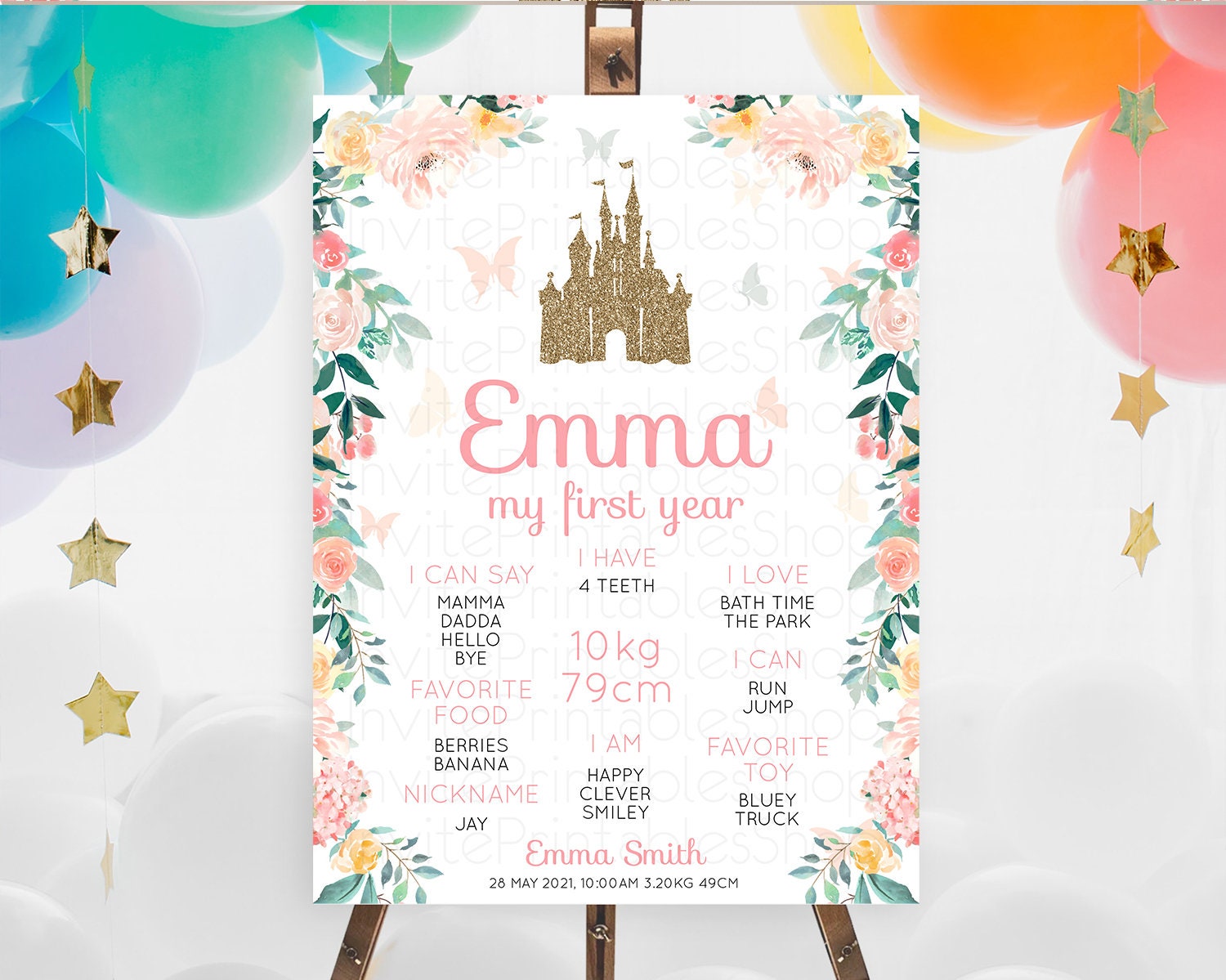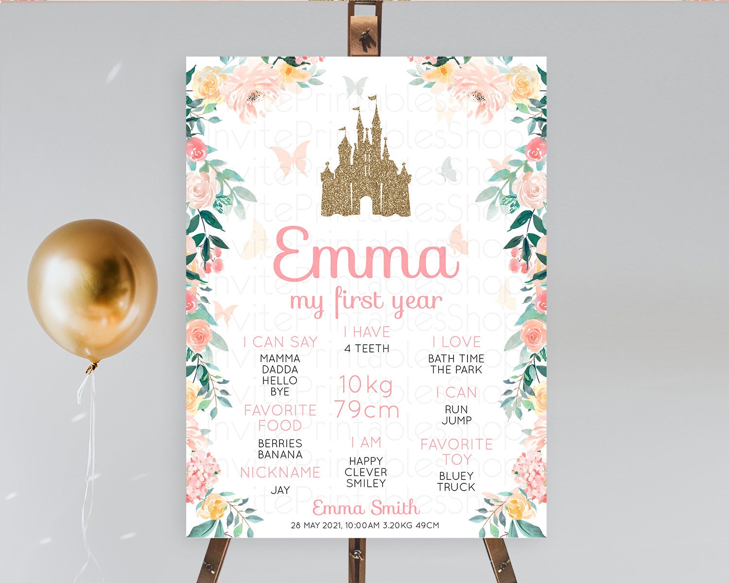 Princess First Birthday Milestone Poster Castle Milestone Board Secret Garden Enchanted Castle Pastel Floral Garden First Birthday D10429
