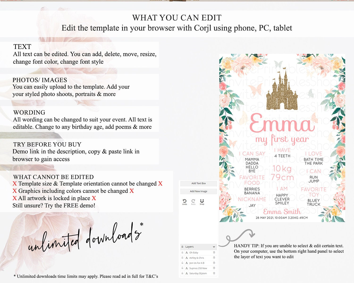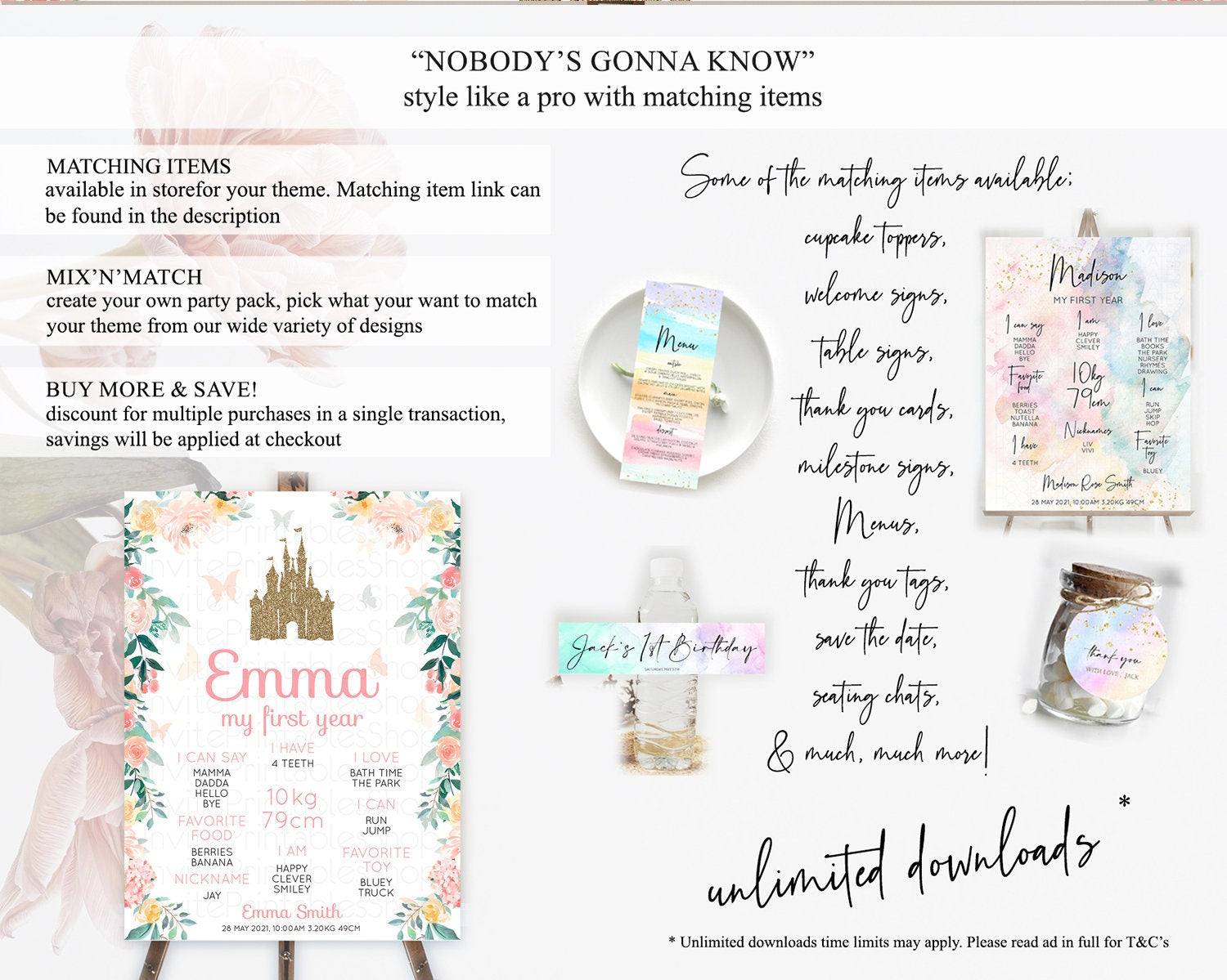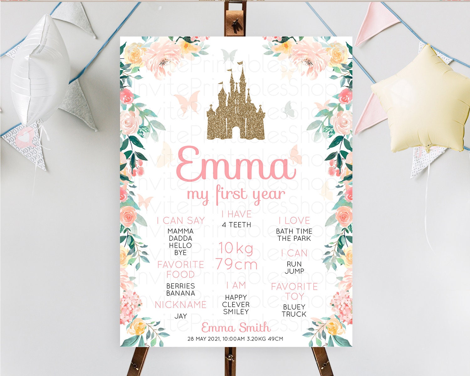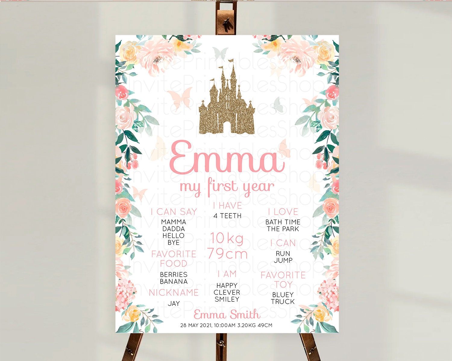 Princess First Birthday Milestone Poster Castle Milestone Board Secret Garden Enchanted Castle Pastel Floral Garden First Birthday D10429