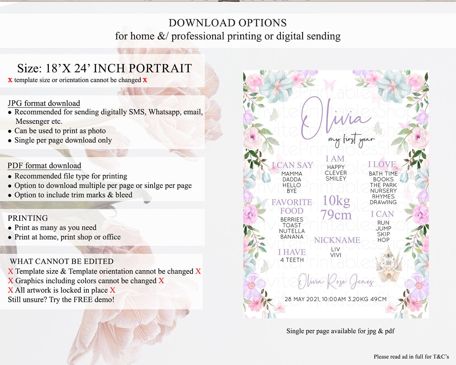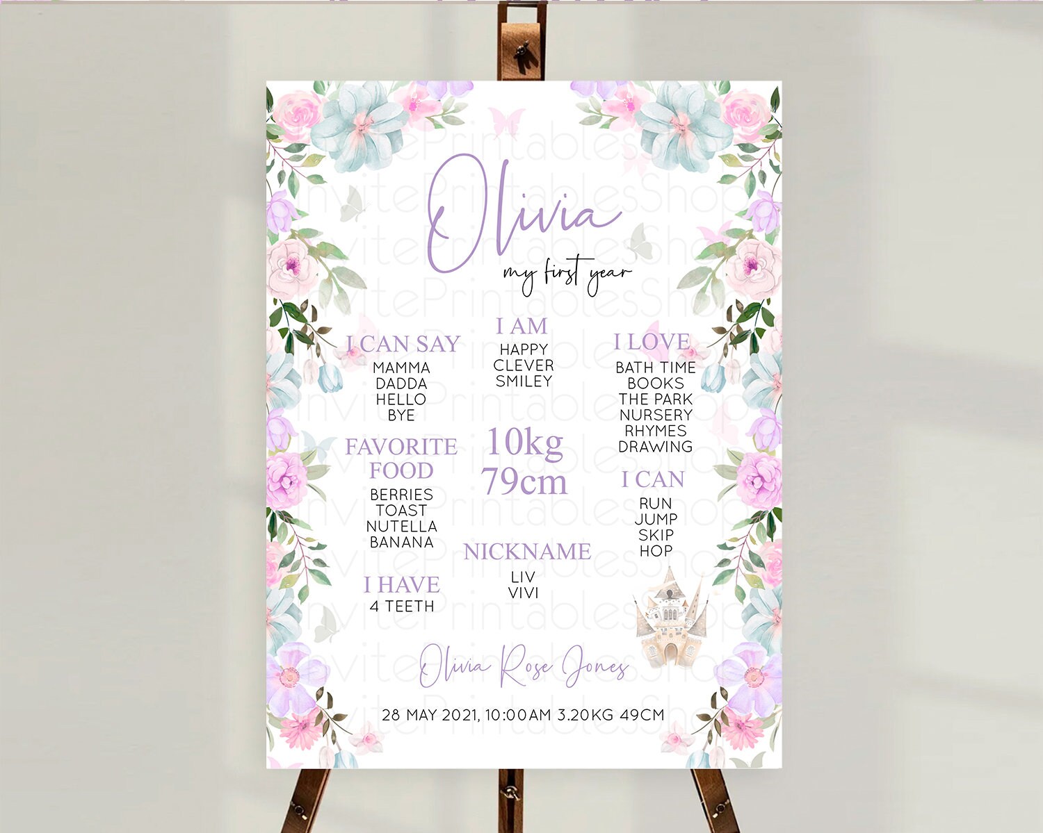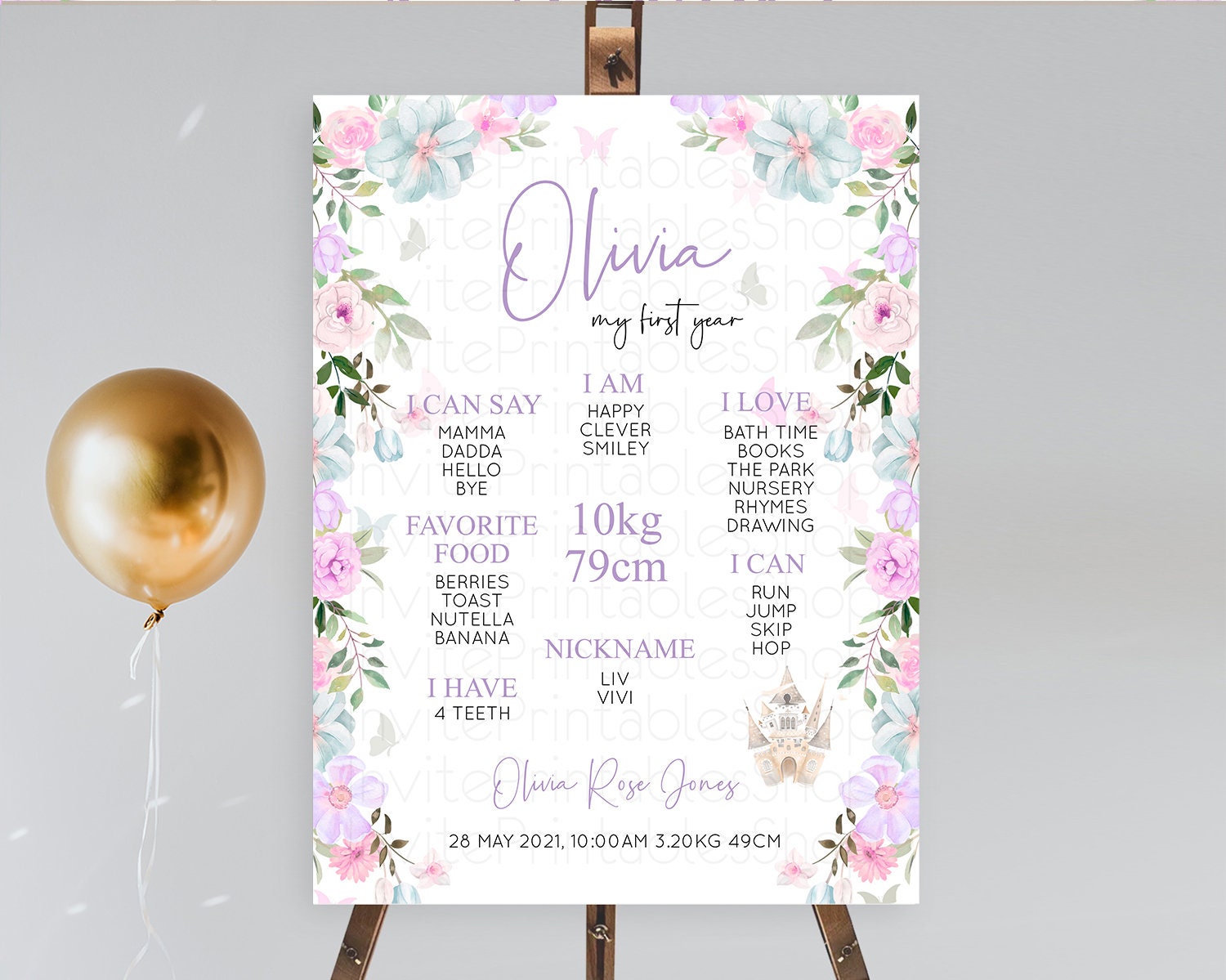Princess First Birthday Milestone Poster Castle Milestone Board Secret Garden Enchanted Castle Pastel Floral Garden First Birthday D10471