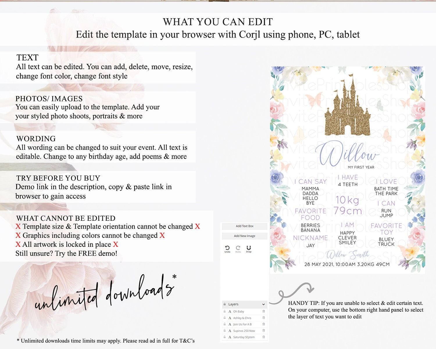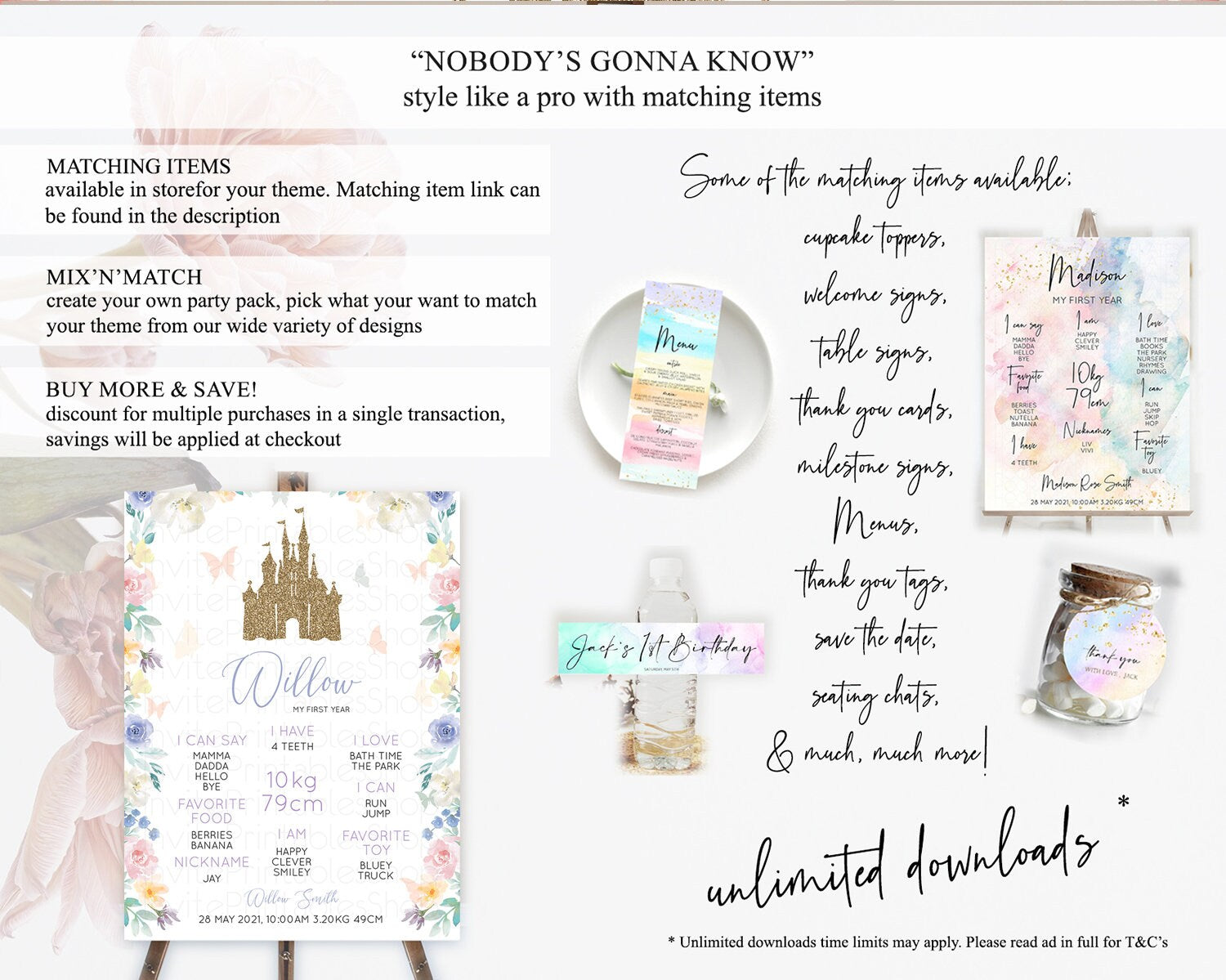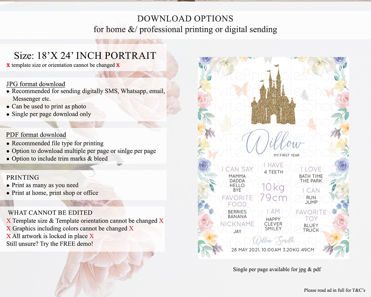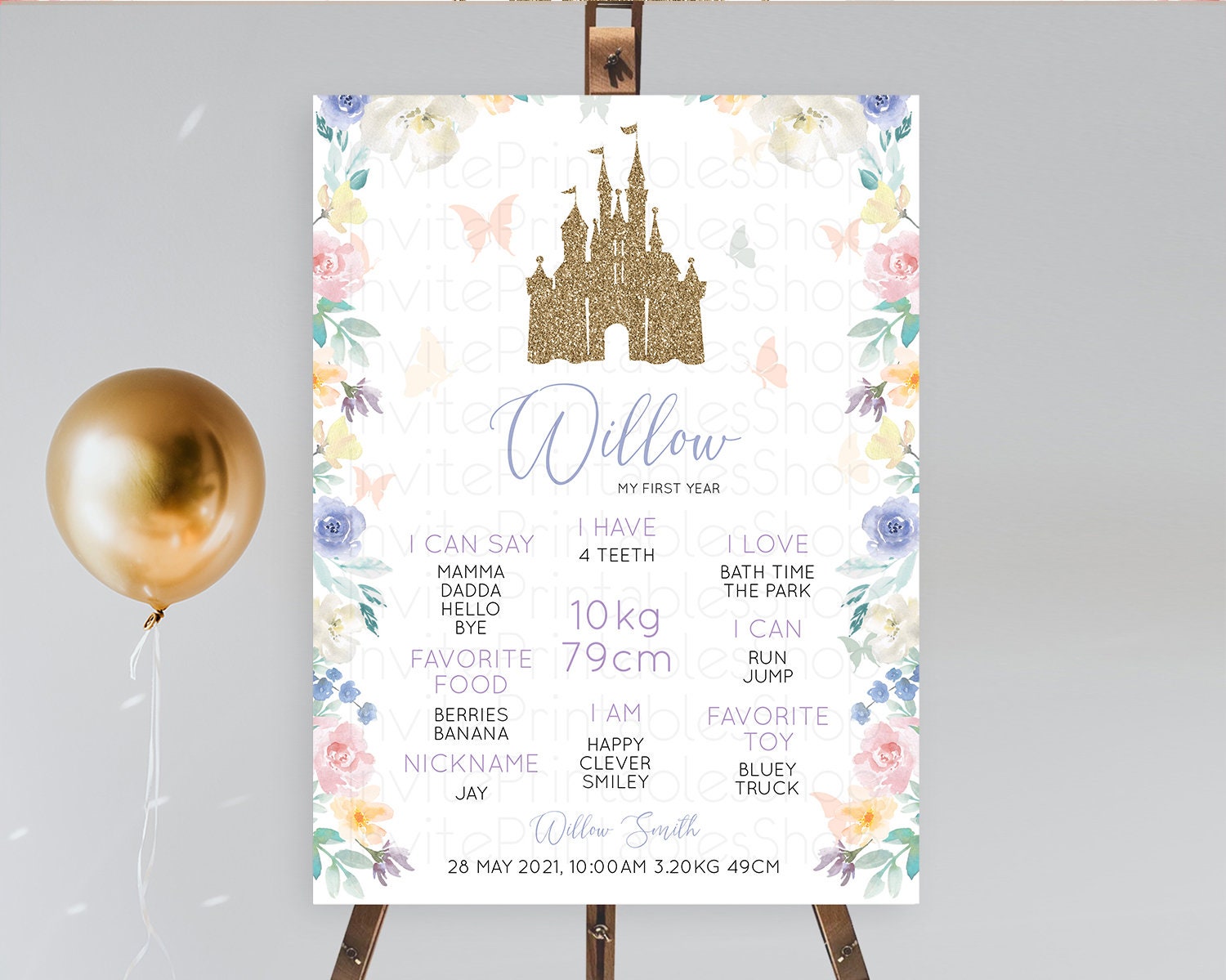 Princess First Birthday Milestone Poster Castle Milestone Board Secret Garden Enchanted Castle Pastel Floral Garden First Birthday D10931