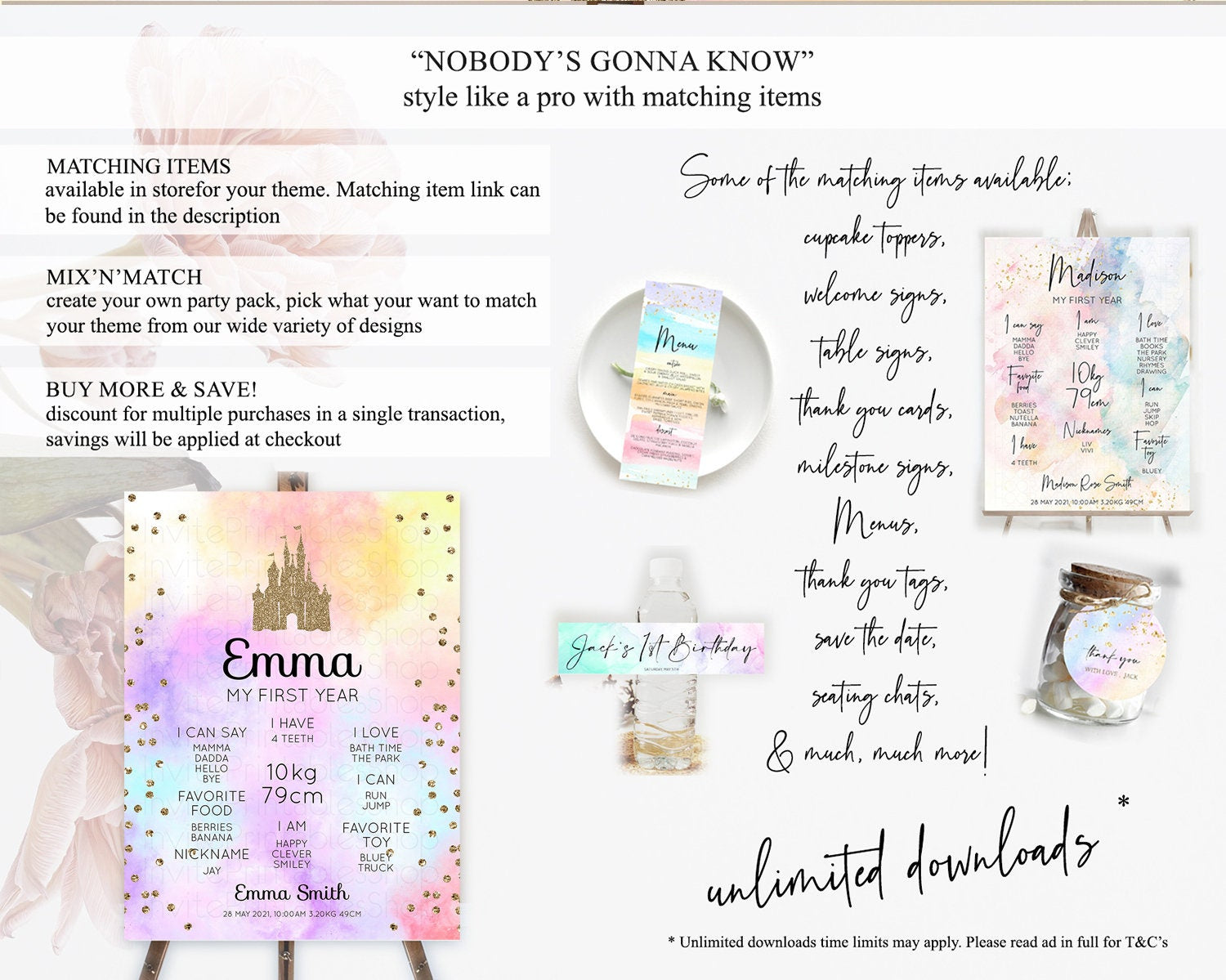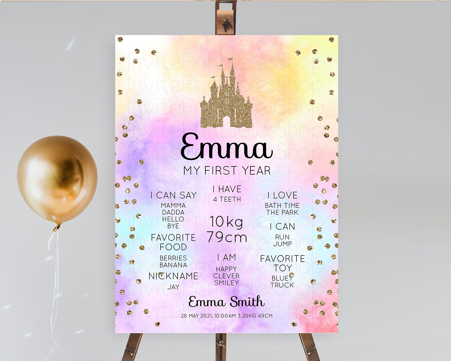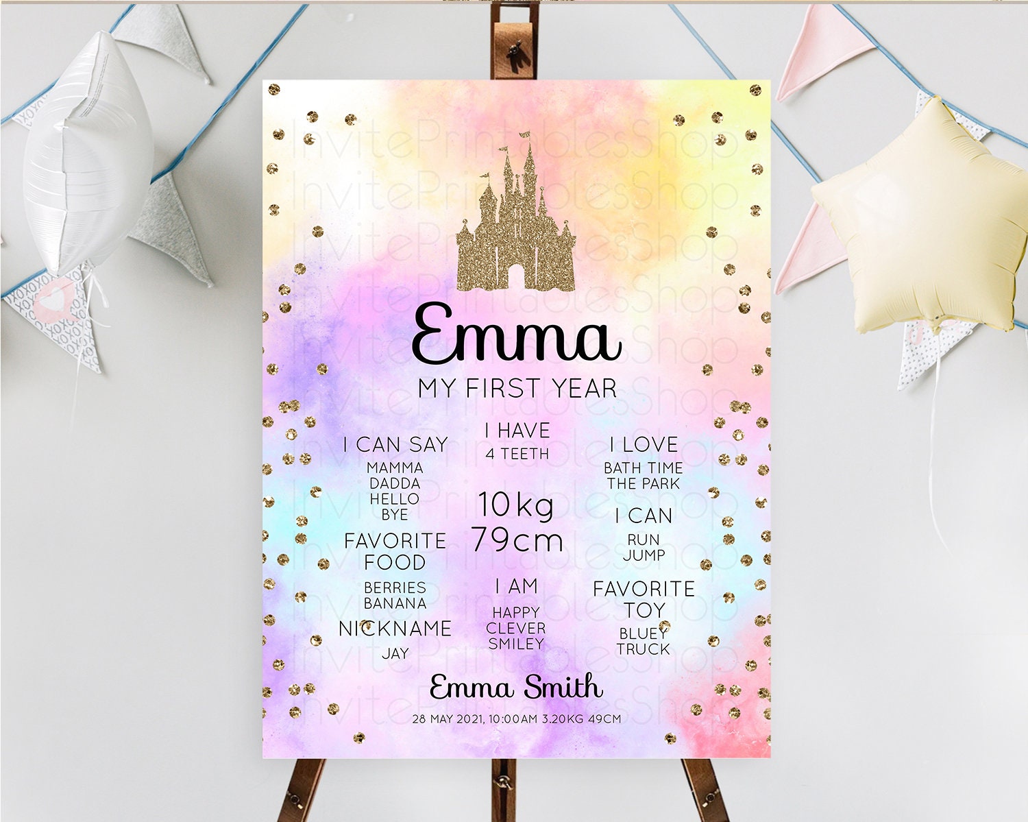 Princess First Birthday Milestone Poster Pastel Princess Milestone Board Pastel Rainbow Colorful Enchanted Castle 1st Birthday Sign D10148