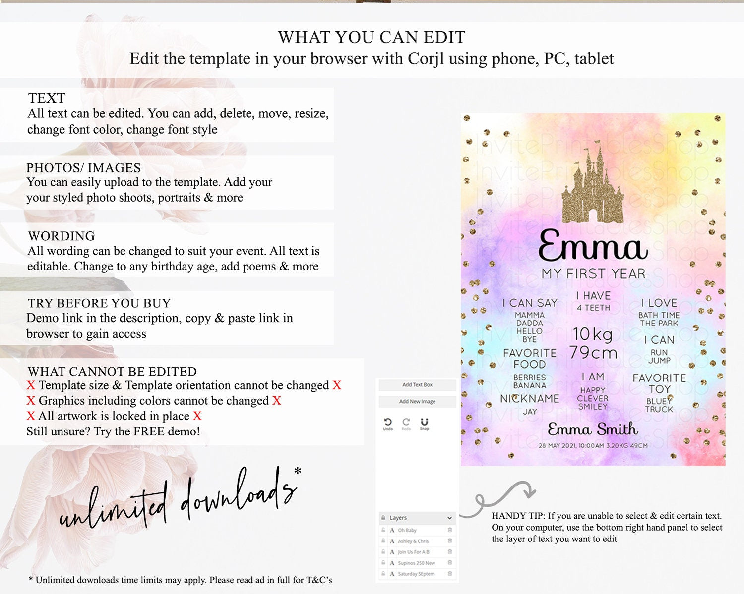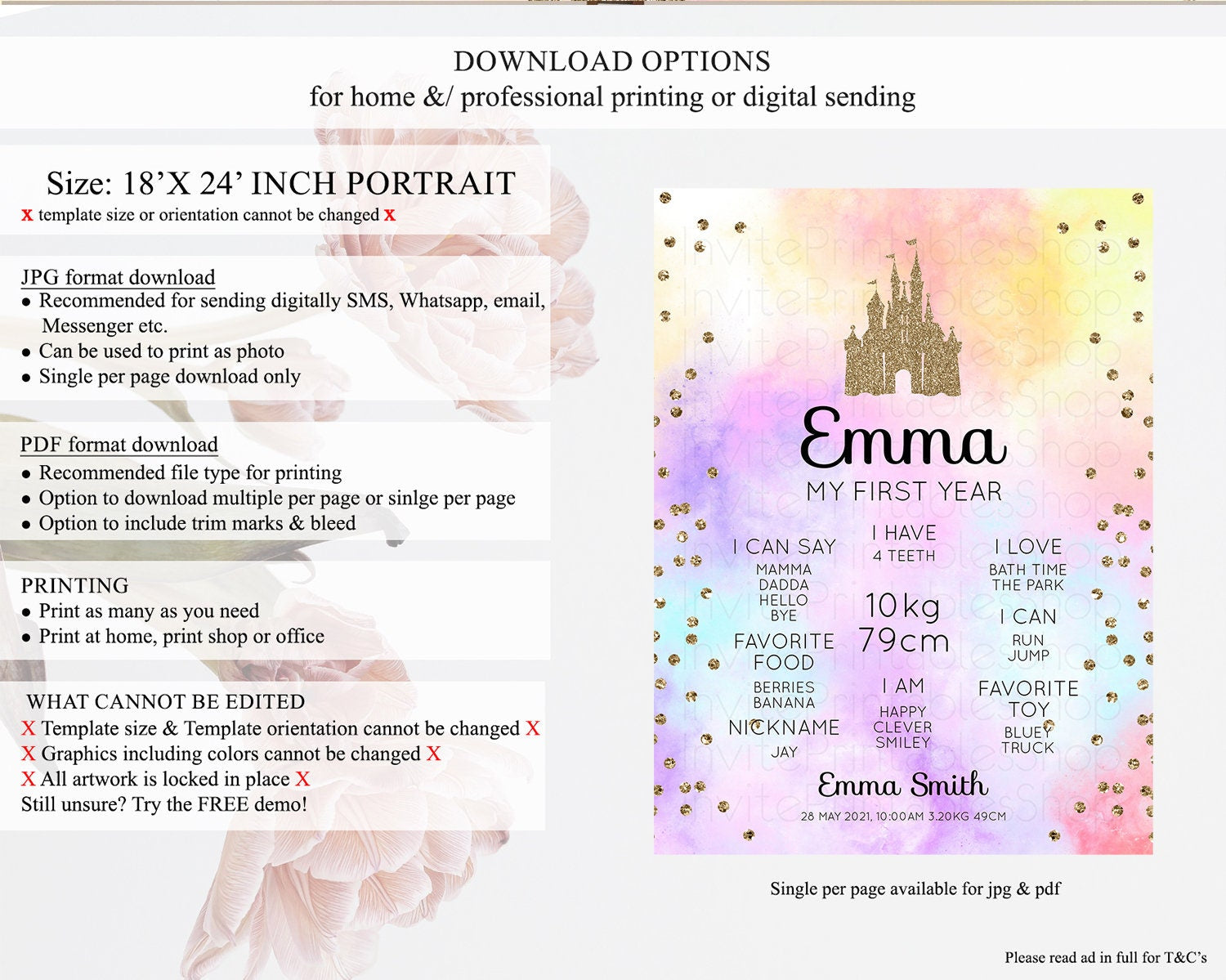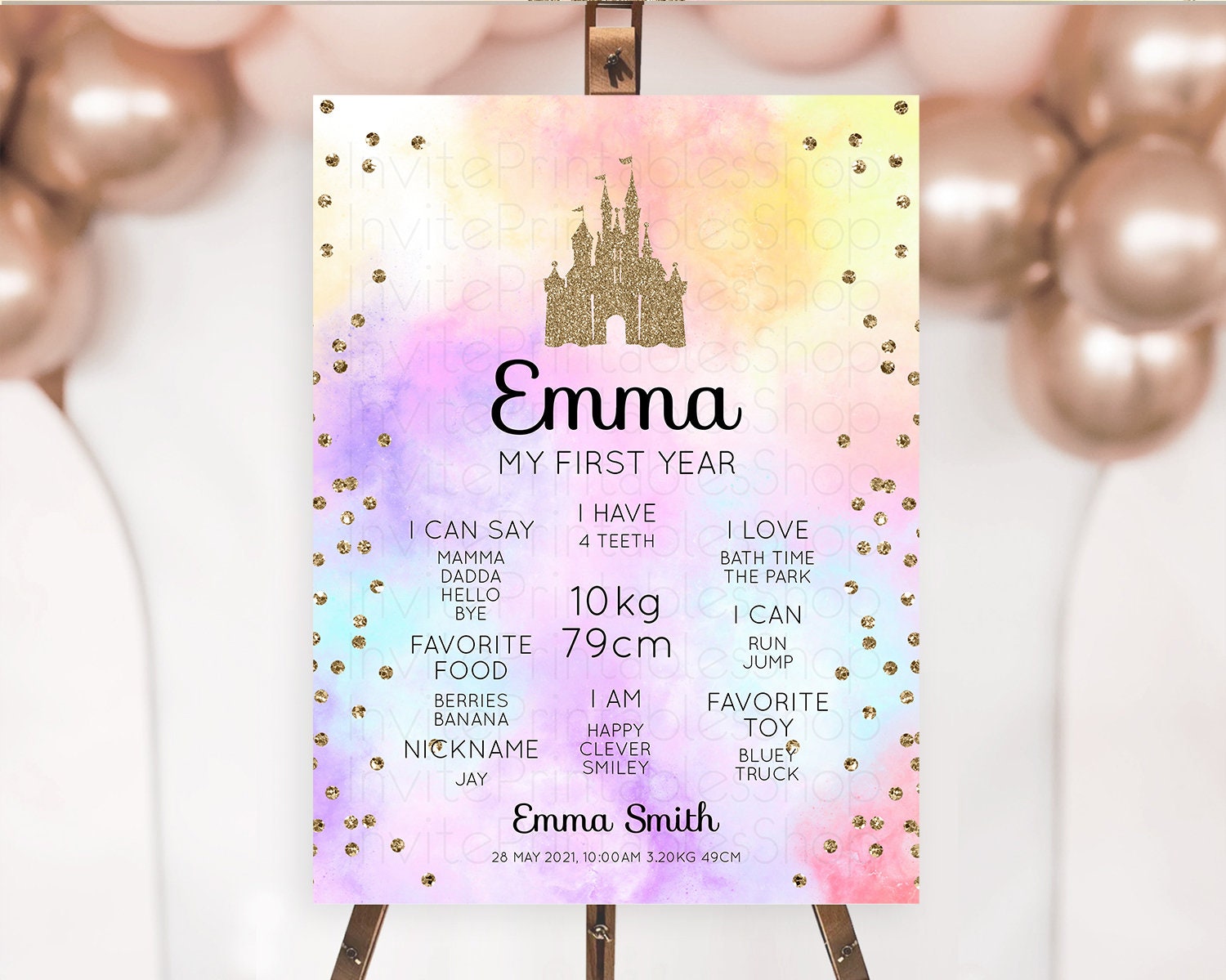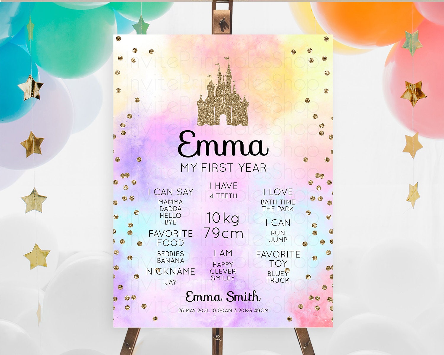 Princess First Birthday Milestone Poster Pastel Princess Milestone Board Pastel Rainbow Colorful Enchanted Castle 1st Birthday Sign D10148