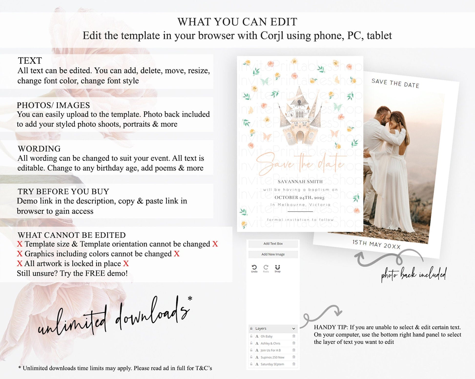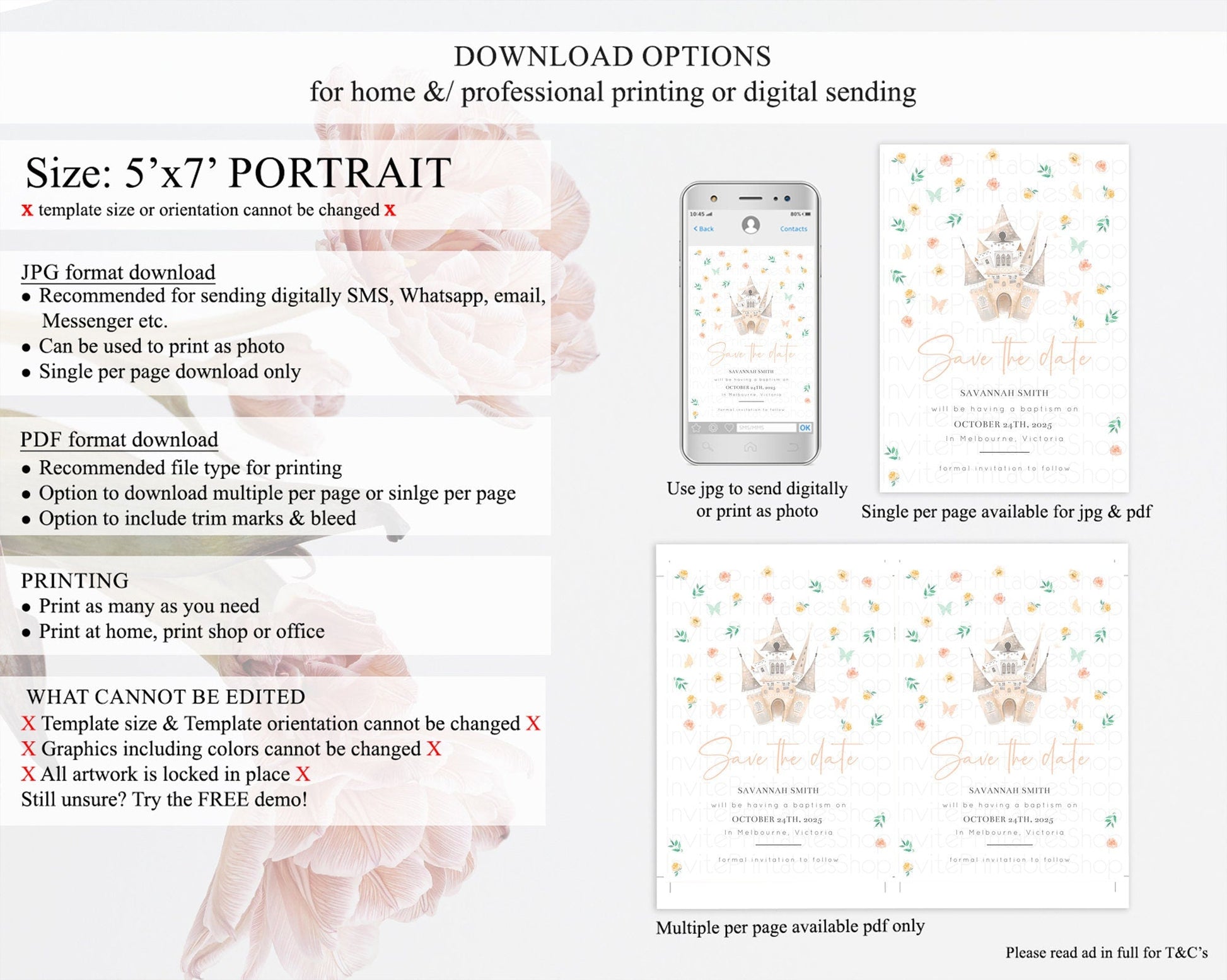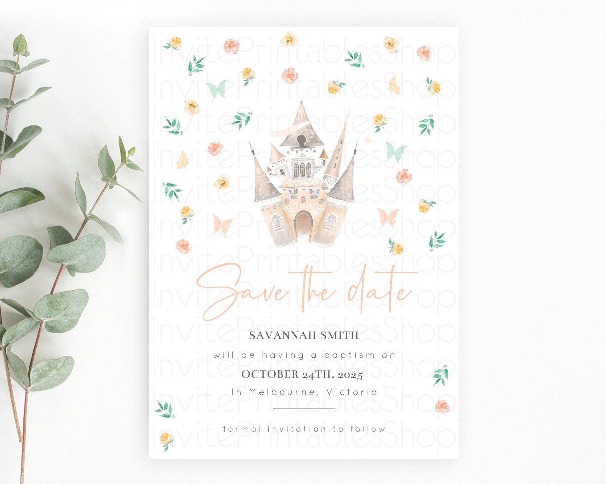 Princess Save The Date Template Secret Garden Enchanted Castle Pastel Floral Royal Party For 1st Birthday Baptism Baby Shower D10363