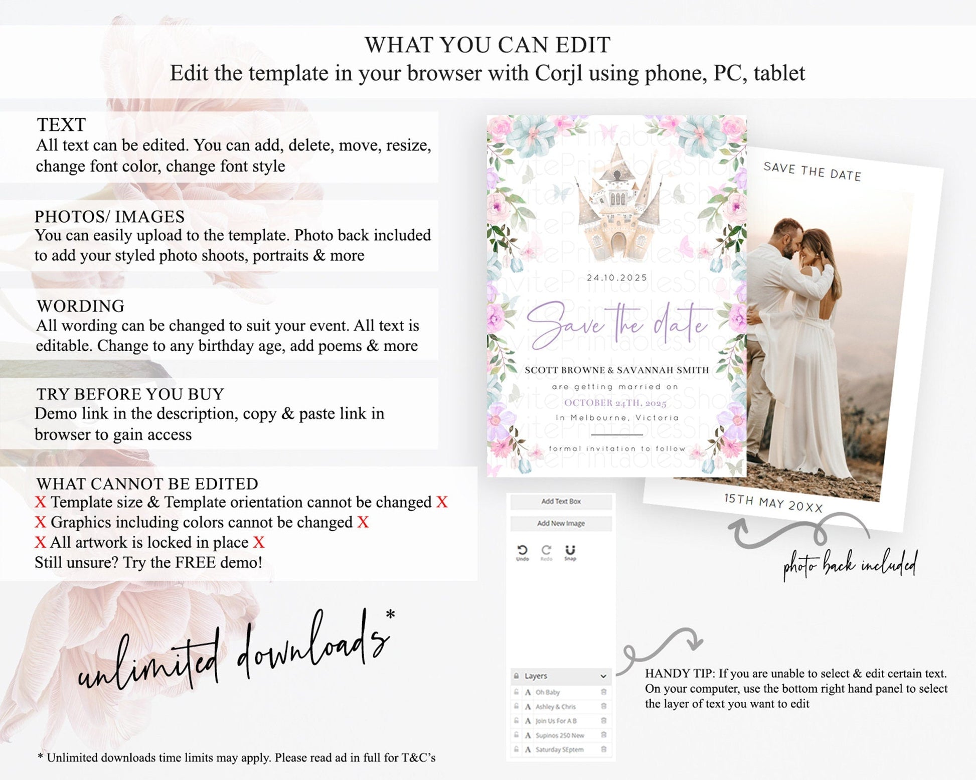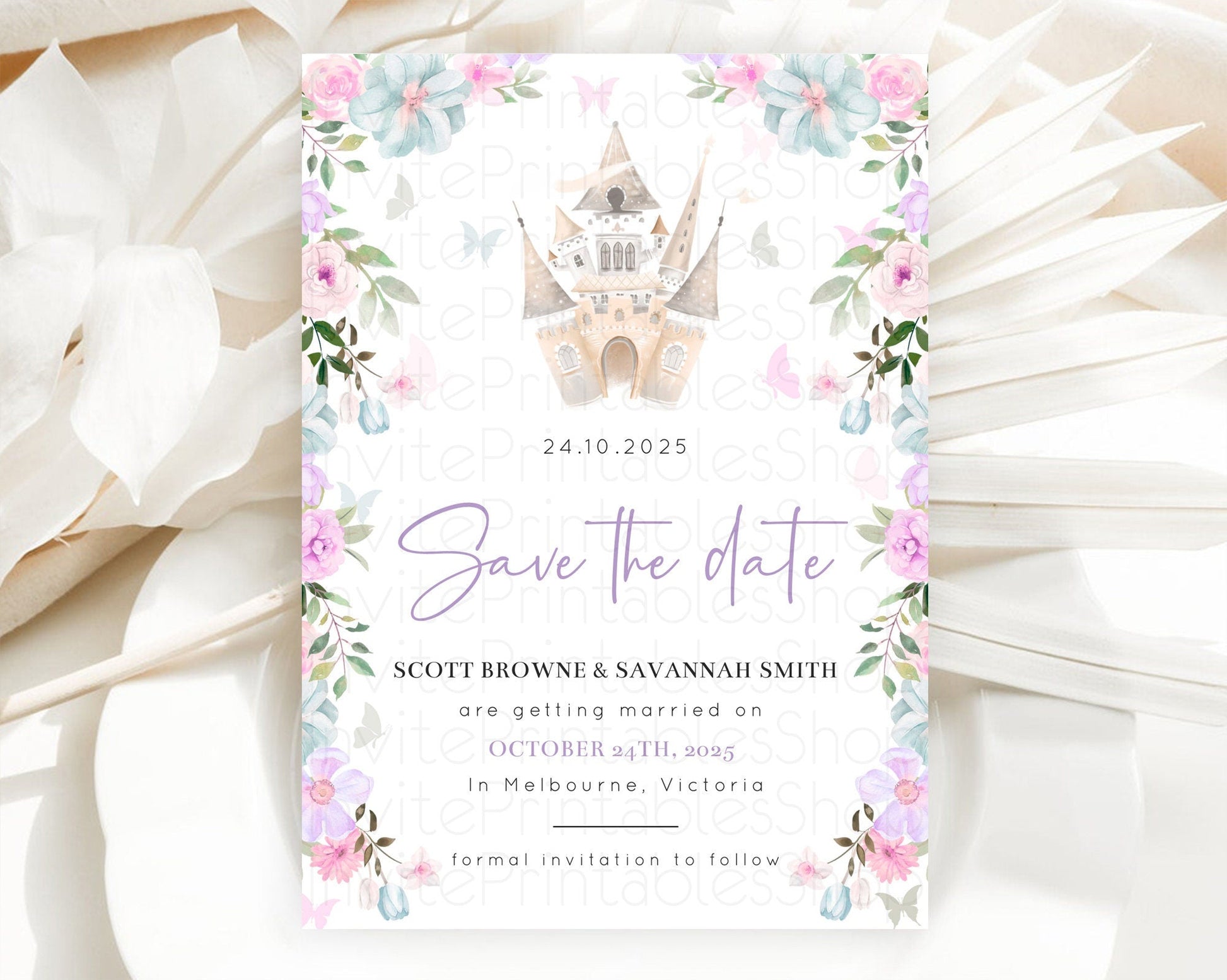 Princess Save The Date Template Secret Garden Enchanted Castle Pastel Floral Royal Party For 1st Birthday Baptism Baby Shower D10471