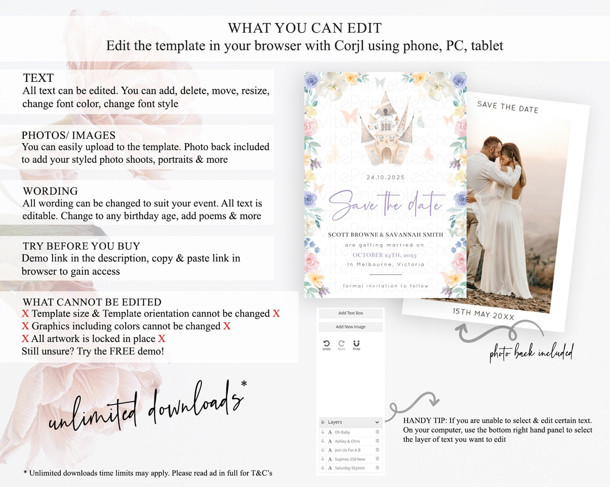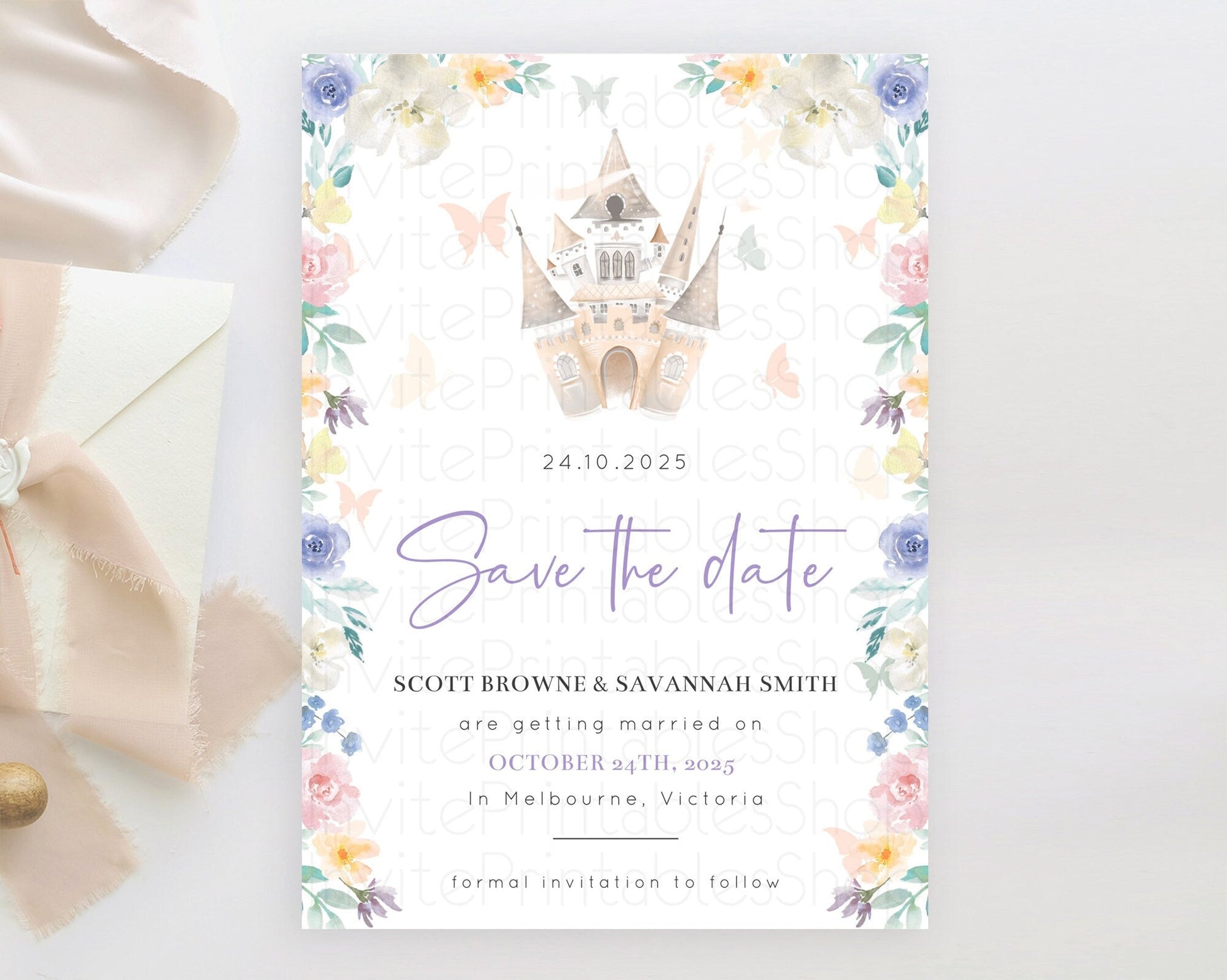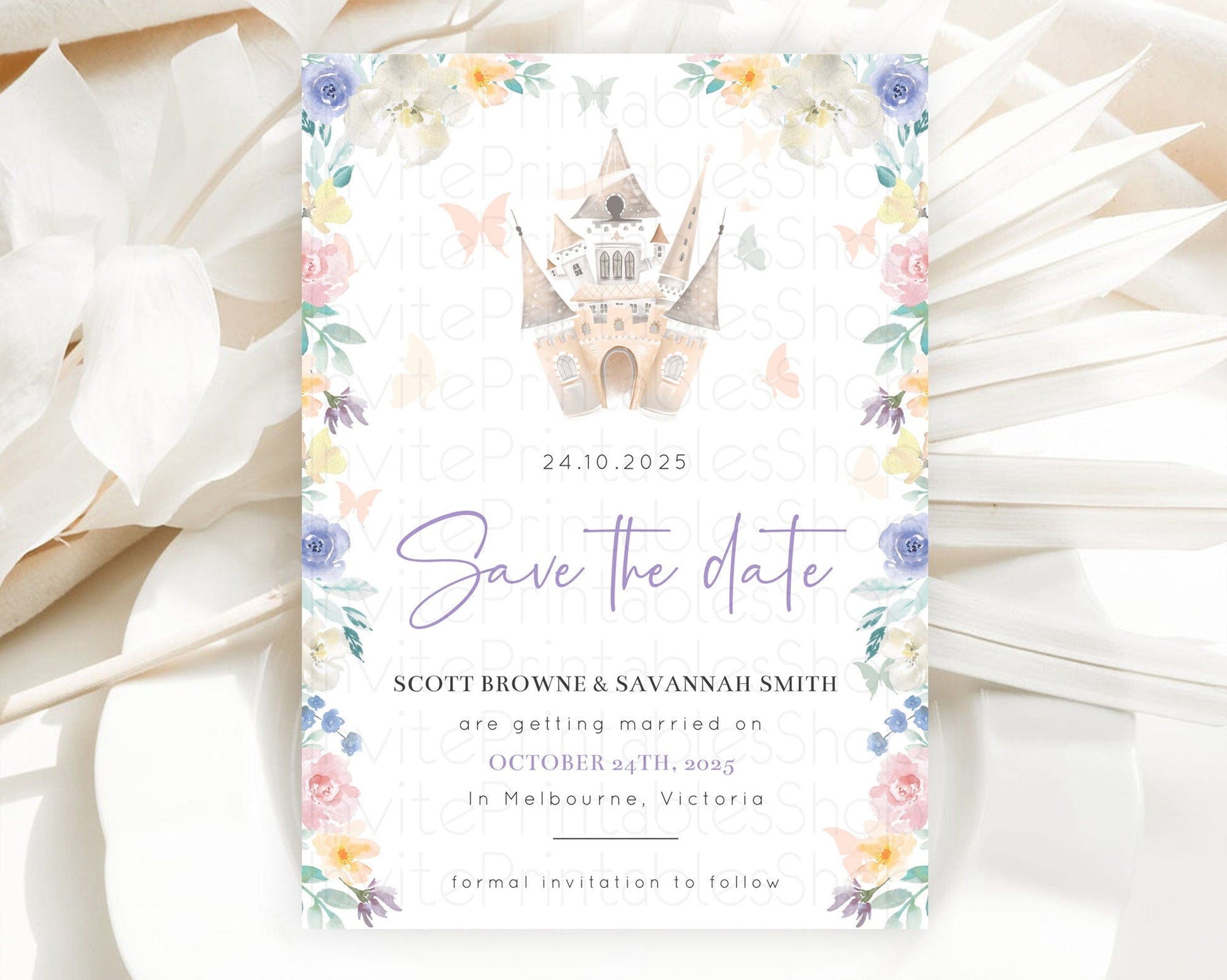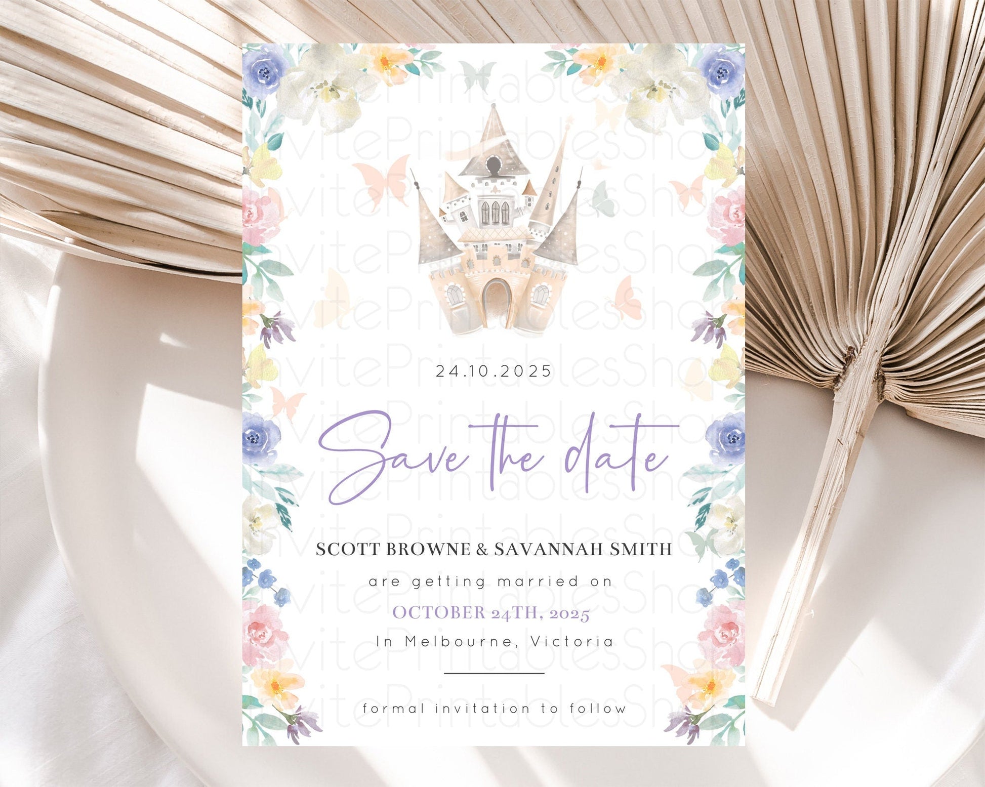 Princess Save The Date Template Secret Garden Enchanted Castle Pastel Floral Royal Party For 1st Birthday Baptism Baby Shower D10709