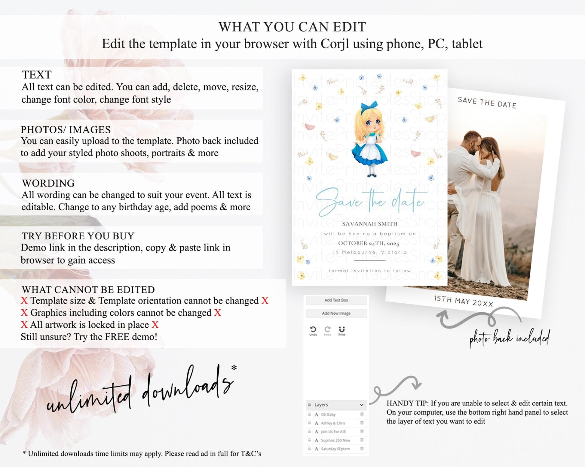 • Template size & orientation cannot be changed. Please use the demo link to confirm this product suits your needs.