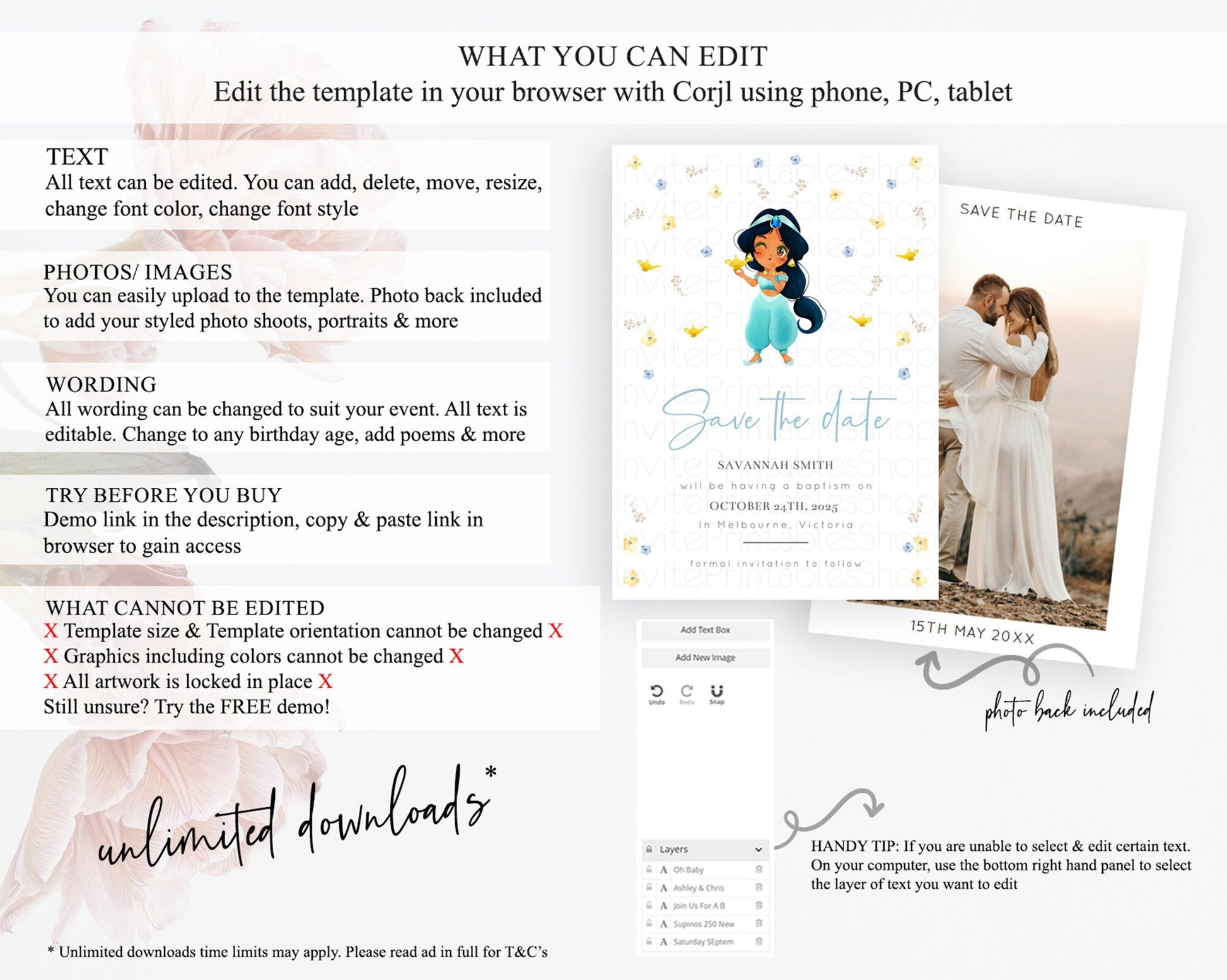 • Template size & orientation cannot be changed. Please use the demo link to confirm this product suits your needs.