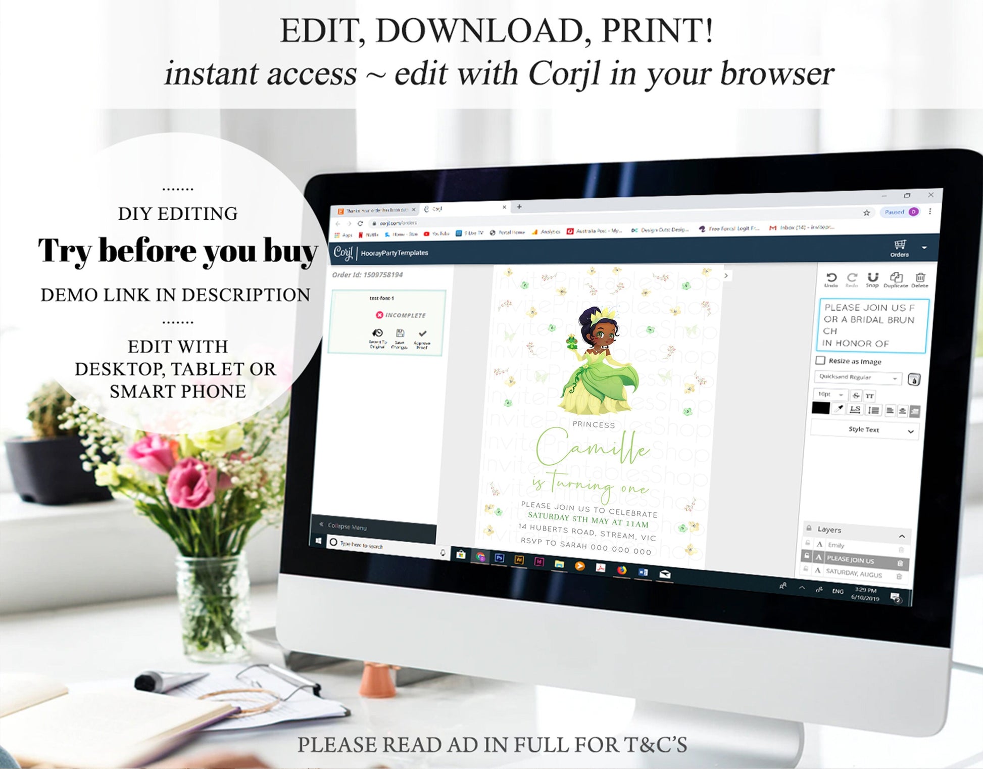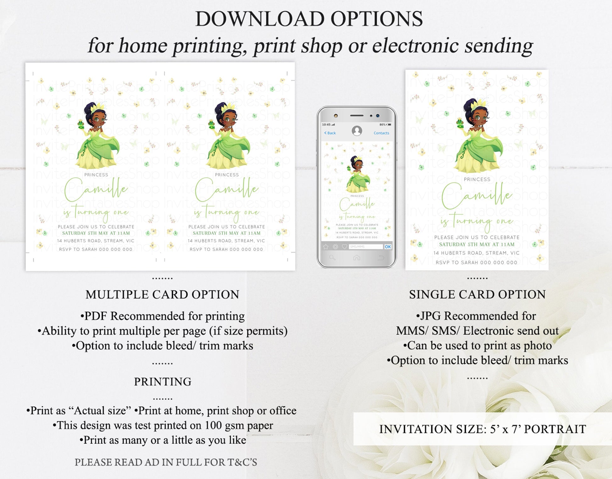•Try before you buy! • DEMO LINK- https://www.corjl.com/d/23OE08 PLEASE READ AD IN FULL!! •Digital file. No physical item will be shipped •Do it yourself Editing. Edit online with Corjl or Edit with your mobile ITEM DETAILS Invitation size: 5’x7’ File type: PDF, JPEG Resolution: 300DPI PDF FILE OPTIONS: •Recommended for printing •Ability to print multiple per page (if size permits) •Option to include bleed/ trim marks JPG FILE OPTIONS: •Recommended for MMS/ SMS/ Electronic send out •Can be used to print as photo •Option to include bleed/ trim marks EDITING • Do it yourself editing • Mobile editing is available • Google chrome is the recommend browser for Corjl. Please download here for FREE: https://www.google.com/chrome/ • Using other browsers may not show all of Corjl's editing features • Editing on a desktop/ laptop computer is recommended to access all of Corjl features • Mobile editing is available, please use a desktop/ laptop computer to access all of Corjl features DOWNLOADS & EXPIRY •Maximum 3 downloads on the same edit •Link expires 30 days after purchase DOWNLOAD NOTICE •Once you have reached your download limits &/ “approve proof” in Corjl. You will not be able to request further downloads on your design. Further download requests are not permitted WHAT IS EDITABLE •Text - colours, fonts, size, move, delete & rotation. •Please see demo link for what you can and can’t do WHAT YOU CAN’T EDIT •Template size •Template orientation •Graphics CAN NOT BE deleted, moved, or changed in colour •Please see demo link for what you can and can’t do HOW TO 1. Choose design template & checkout on Etsy. 2. Email will be sent from Corjl. Follow link to access template 3. Edit, save & print INSTRUCTIONS •Instructions on how to edit your design have been written by Corjl and will be available with your purchase. PRINTING •Colours can vary depending on the monitor, printer & cardstock •Can be printed at home •Home printing will require you to select the high quality print settings, select appropriate paper thickness & click "Actual size" prior to you printing •This design was test printed on 100 gsm paper •Can be printed at local print shop. Please check printing requirements & any printing restrictions prior to purchase PERSONAL USE ONLY. This item cannot be shared, re-sold, or used commercially for profit. REFUND POLICY •We are unable to provide a refund/ exchange on commenced & completed work, instant downloads or self-editing link templates. Please use the demo link to work out if this product is right for you. Copyright © 2018 by InvitePrintablesShop PTY LTD All rights reserved. This file or any portion thereof may not be reproduced or resold without the express written permission of the publisher (including edits to the design). Our files are provided as high-resolution PDFs – the end result is dependent upon the printer and paper used. If using a professional printing company, InvitePrintablesShop are not responsible for their specific printing requirements, paper or colour quality. Any changes required to the template are not included with your purchase – the files come as described in the listing only and cannot be changed. Thank you for visiting Invite Printables Shop:)