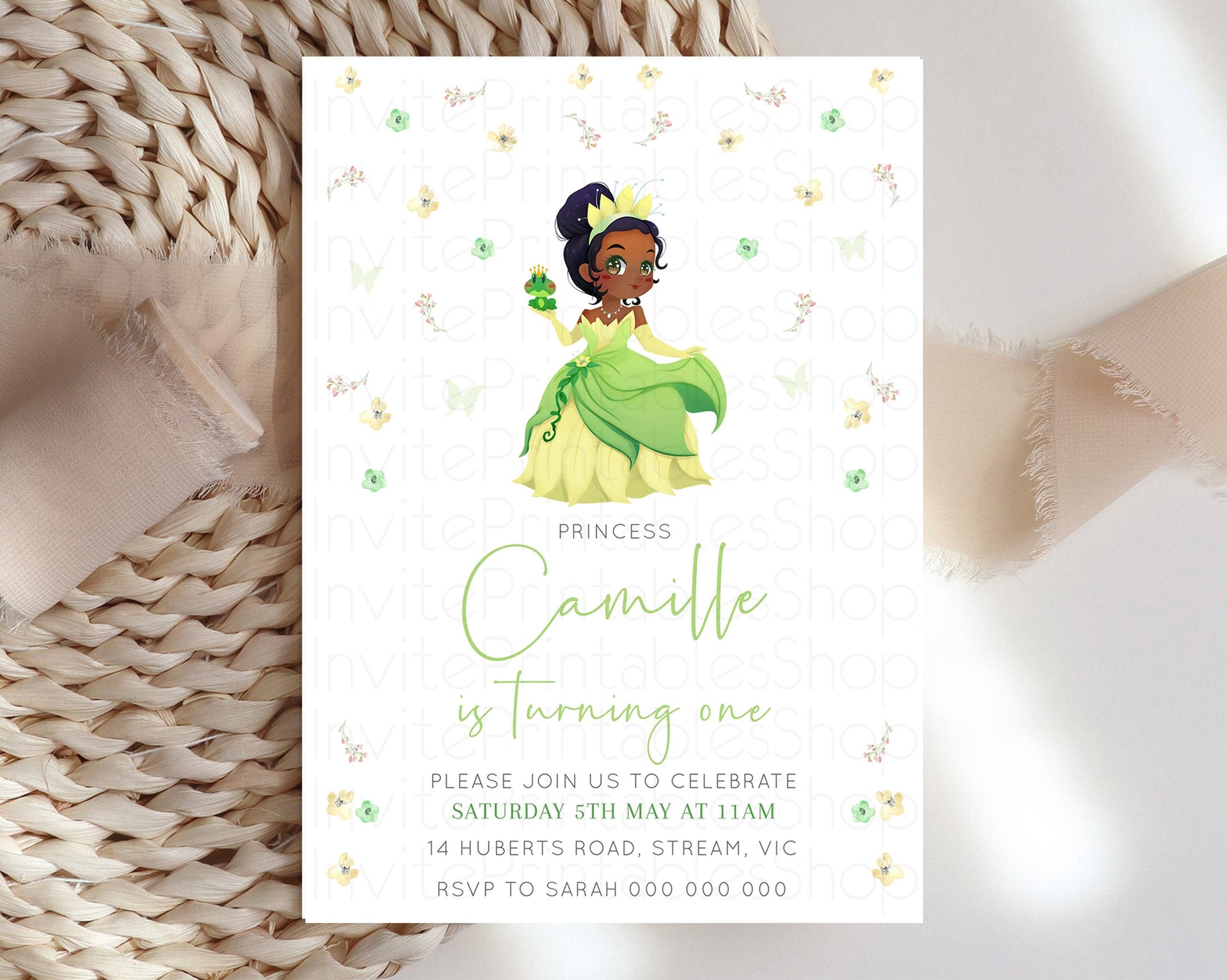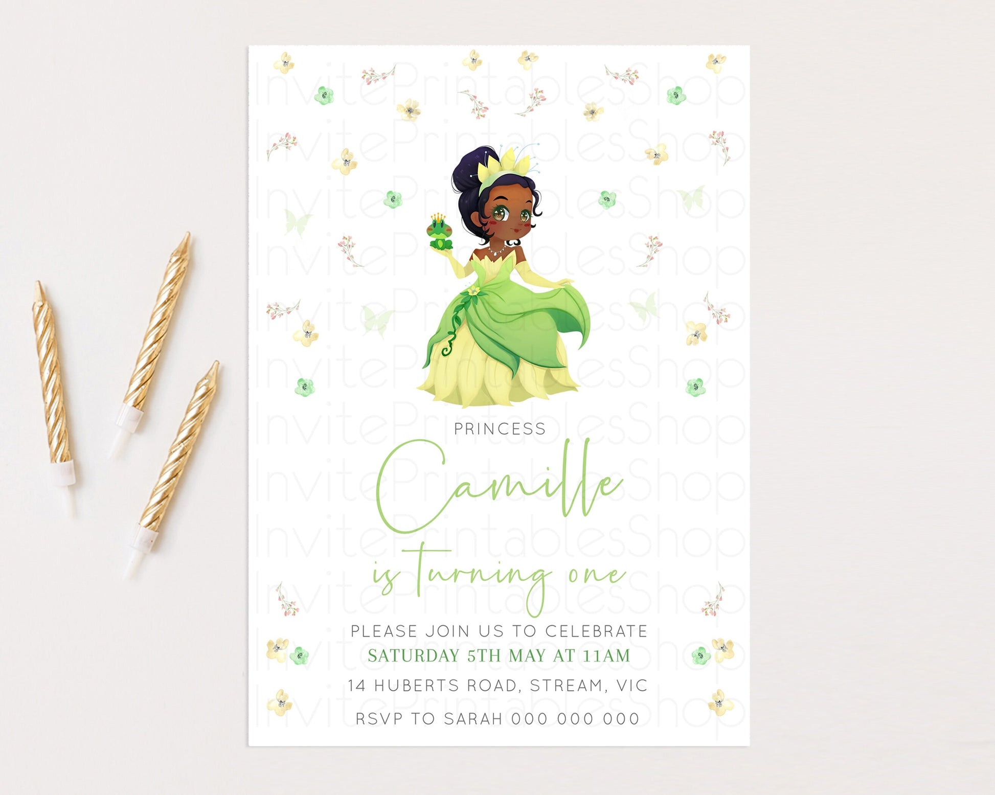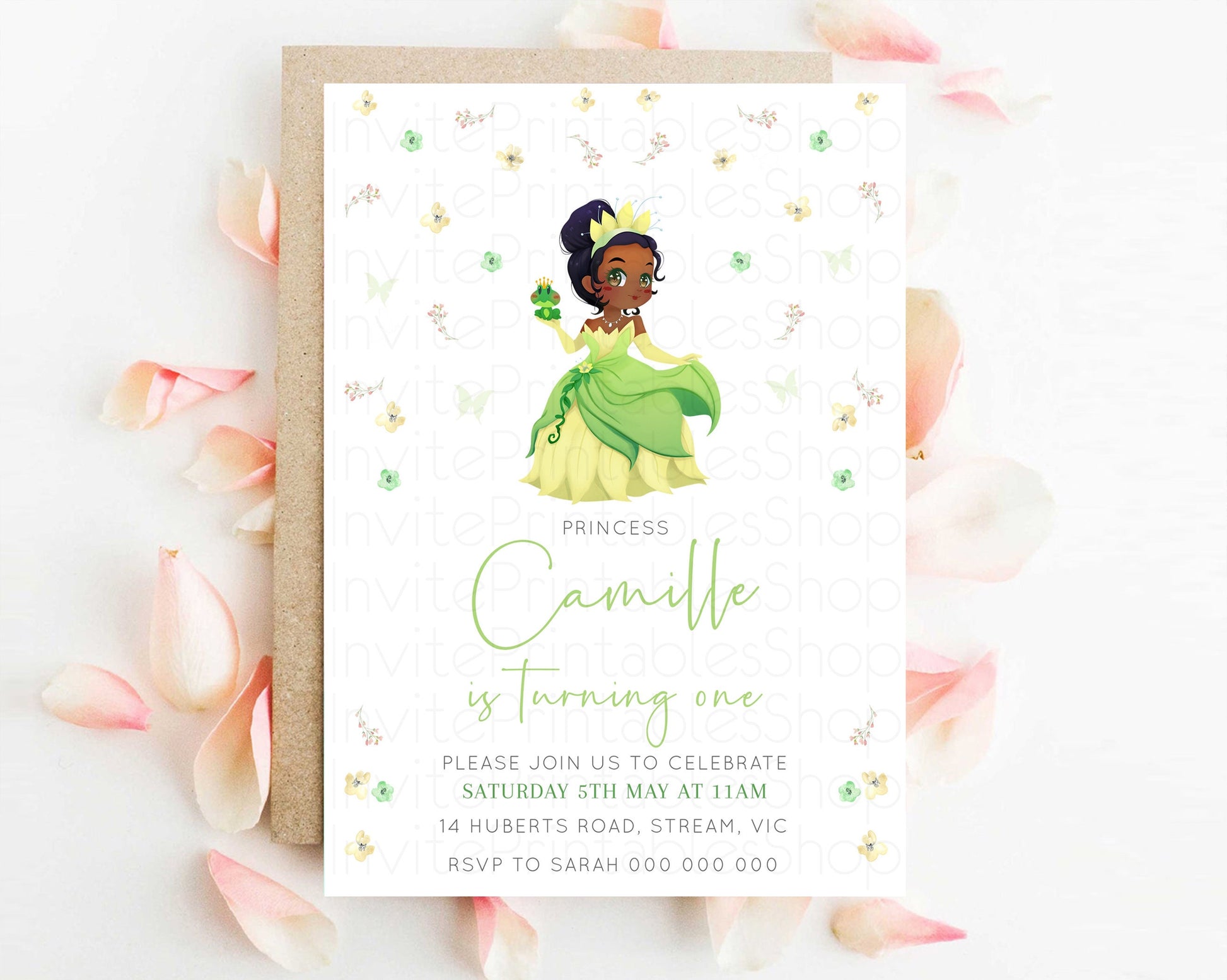 Princess Tiana Birthday Invitation Enchanted Castle Rose Garden Pastel Flowers Confetti Floral Sprinkles Colorful 1st 2nd 3rd Birthday