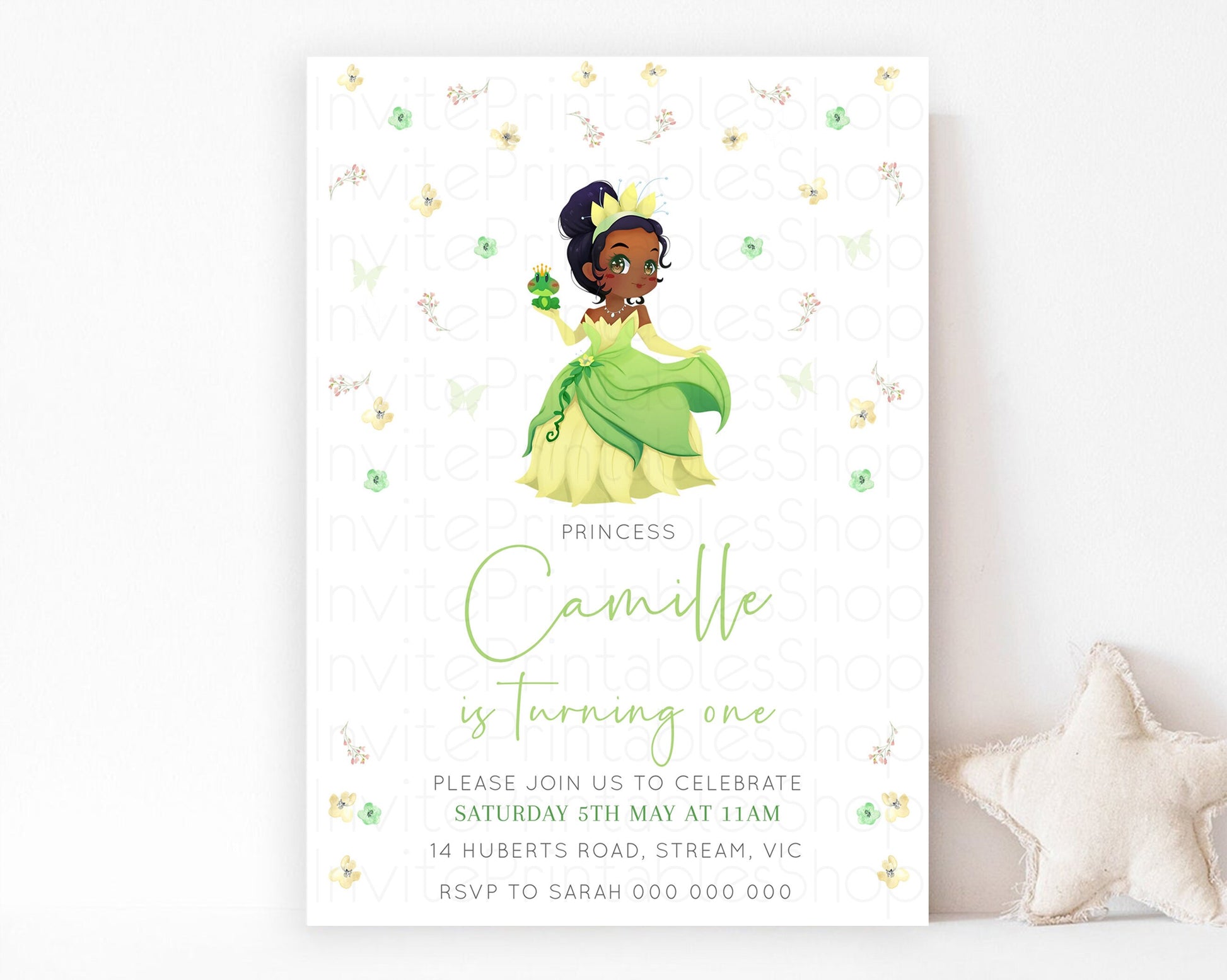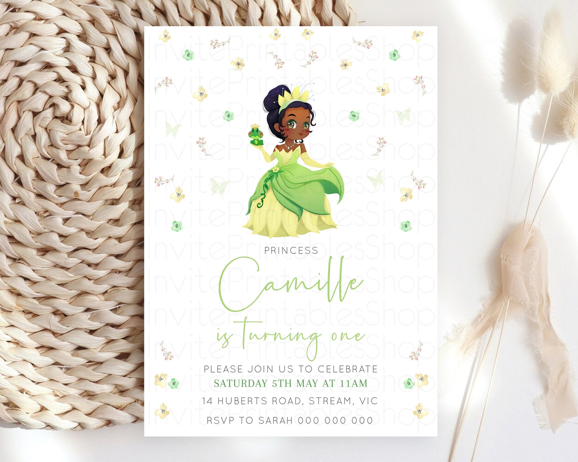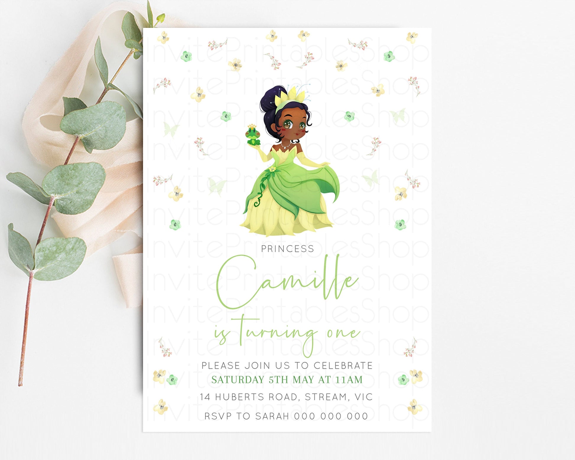 Princess Tiana Birthday Invitation Enchanted Castle Rose Garden Pastel Flowers Confetti Floral Sprinkles Colorful 1st 2nd 3rd Birthday