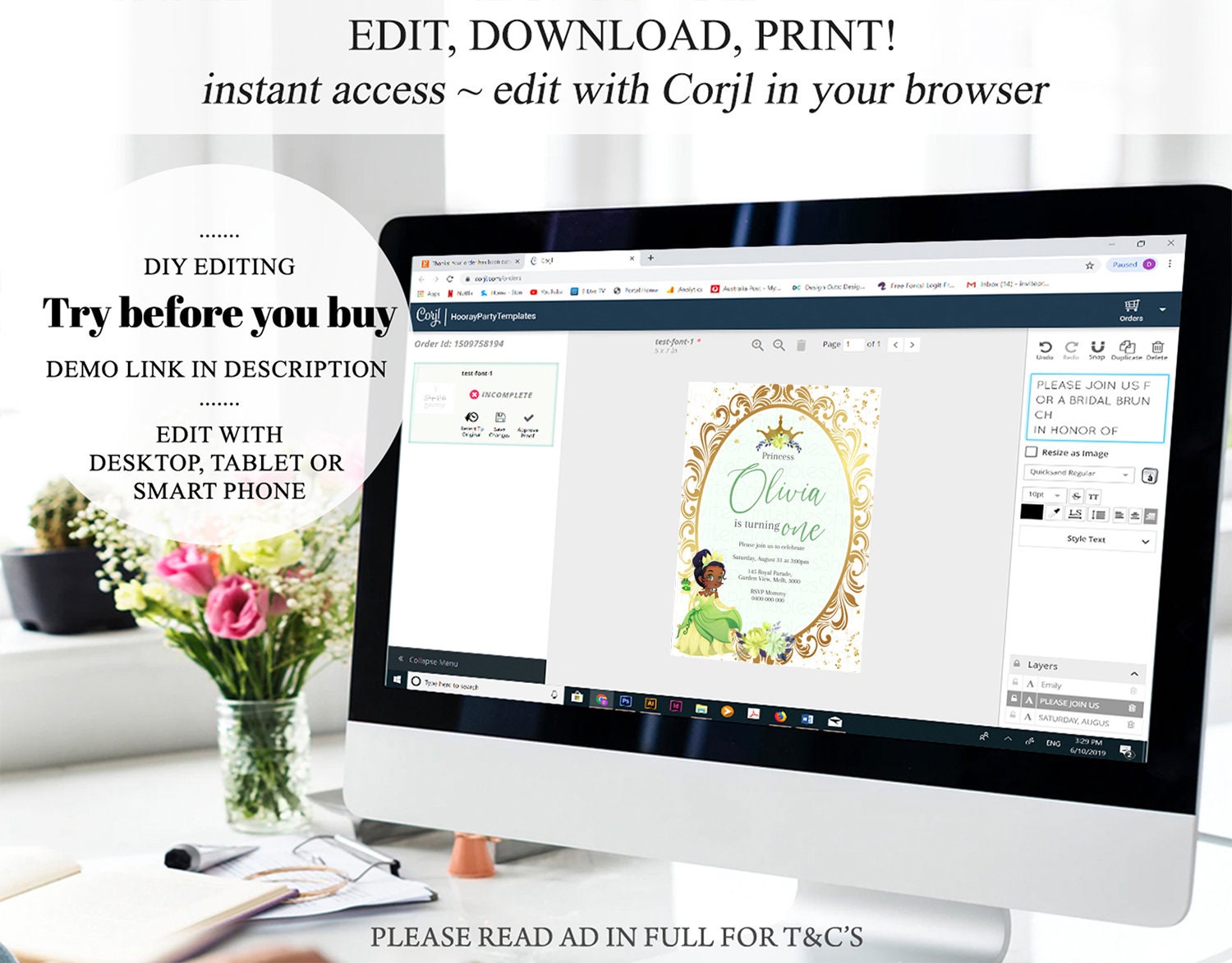 •Try before you buy! • DEMO LINK- https://www.corjl.com/d/28P7NA PLEASE READ AD IN FULL!! •Digital file. No physical item will be shipped •Do it yourself Editing. Edit online with Corjl or Edit with your mobile ITEM DETAILS Invitation size: 5’x7’ File type: PDF, JPEG Resolution: 300DPI PDF FILE OPTIONS: •Recommended for printing •Ability to print multiple per page (if size permits) •Option to include bleed/ trim marks JPG FILE OPTIONS: •Recommended for MMS/ SMS/ Electronic send out •Can be used to print as photo •Option to include bleed/ trim marks EDITING • Do it yourself editing • Mobile editing is available • Google chrome is the recommend browser for Corjl. Please download here for FREE: https://www.google.com/chrome/ • Using other browsers may not show all of Corjl's editing features • Editing on a desktop/ laptop computer is recommended to access all of Corjl features • Mobile editing is available, please use a desktop/ laptop computer to access all of Corjl features DOWNLOADS & EXPIRY •Maximum 3 downloads on the same edit •Link expires 30 days after purchase DOWNLOAD NOTICE •Once you have reached your download limits &/ “approve proof” in Corjl. You will not be able to request further downloads on your design. Further download requests are not permitted WHAT IS EDITABLE •Text - colours, fonts, size, move, delete & rotation. •Please see demo link for what you can and can’t do WHAT YOU CAN’T EDIT •Template size •Template orientation •Graphics CAN NOT BE deleted, moved, or changed in colour •Please see demo link for what you can and can’t do HOW TO 1. Choose design template & checkout on Etsy. 2. Email will be sent from Corjl. Follow link to access template 3. Edit, save & print INSTRUCTIONS •Instructions on how to edit your design have been written by Corjl and will be available with your purchase. PRINTING •Colours can vary depending on the monitor, printer & cardstock •Can be printed at home •Home printing will require you to select the high quality print settings, select appropriate paper thickness & click "Actual size" prior to you printing •This design was test printed on 100 gsm paper •Can be printed at local print shop. Please check printing requirements & any printing restrictions prior to purchase PERSONAL USE ONLY. This item cannot be shared, re-sold, or used commercially for profit. REFUND POLICY •We are unable to provide a refund/ exchange on commenced & completed work, instant downloads or self-editing link templates. Please use the demo link to work out if this product is right for you. Copyright © 2018 by InvitePrintablesShop PTY LTD All rights reserved. This file or any portion thereof may not be reproduced or resold without the express written permission of the publisher (including edits to the design). Our files are provided as high-resolution PDFs – the end result is dependent upon the printer and paper used. If using a professional printing company, InvitePrintablesShop are not responsible for their specific printing requirements, paper or colour quality. Any changes required to the template are not included with your purchase – the files come as described in the listing only and cannot be changed. Thank you for visiting Invite Printables Shop:)