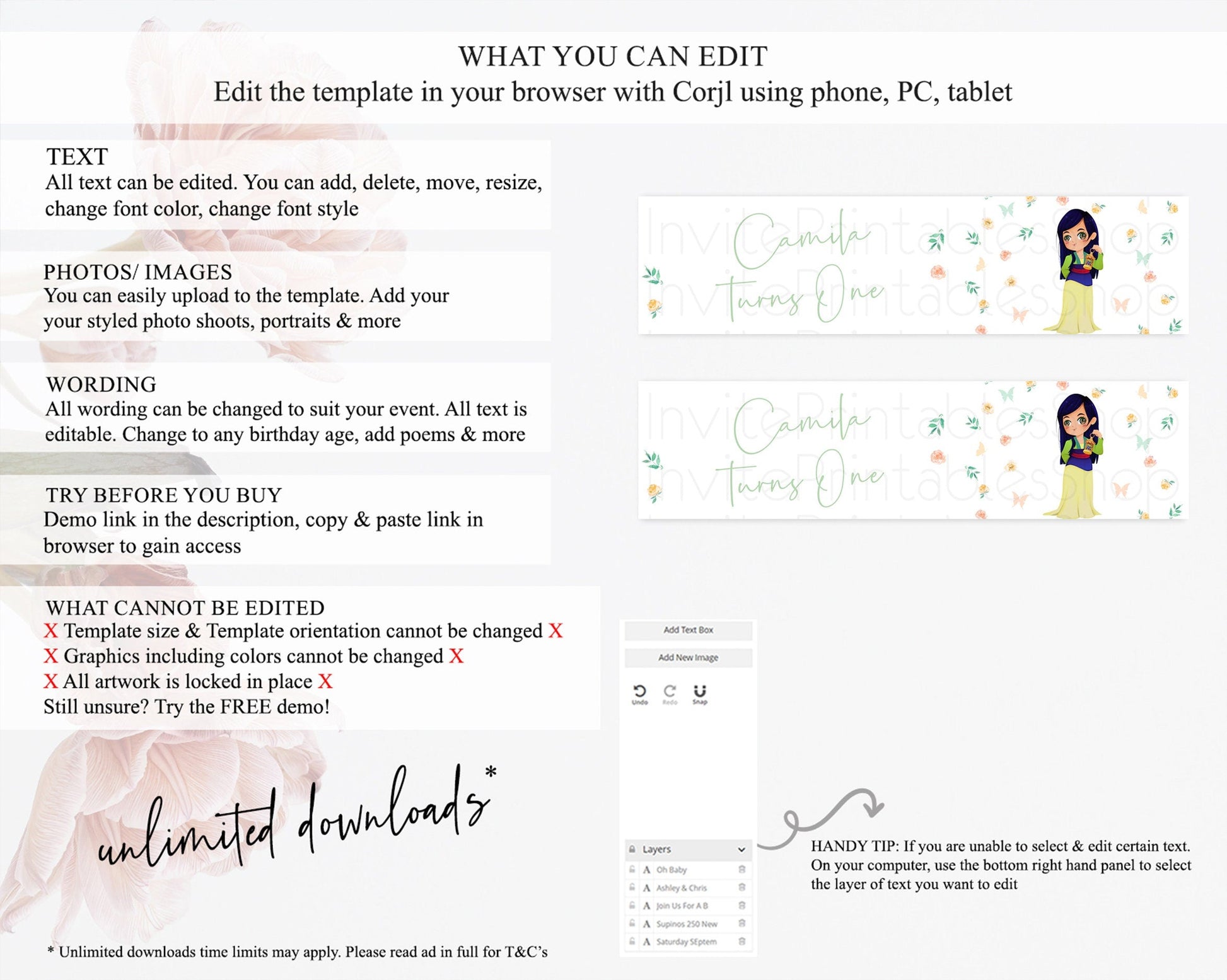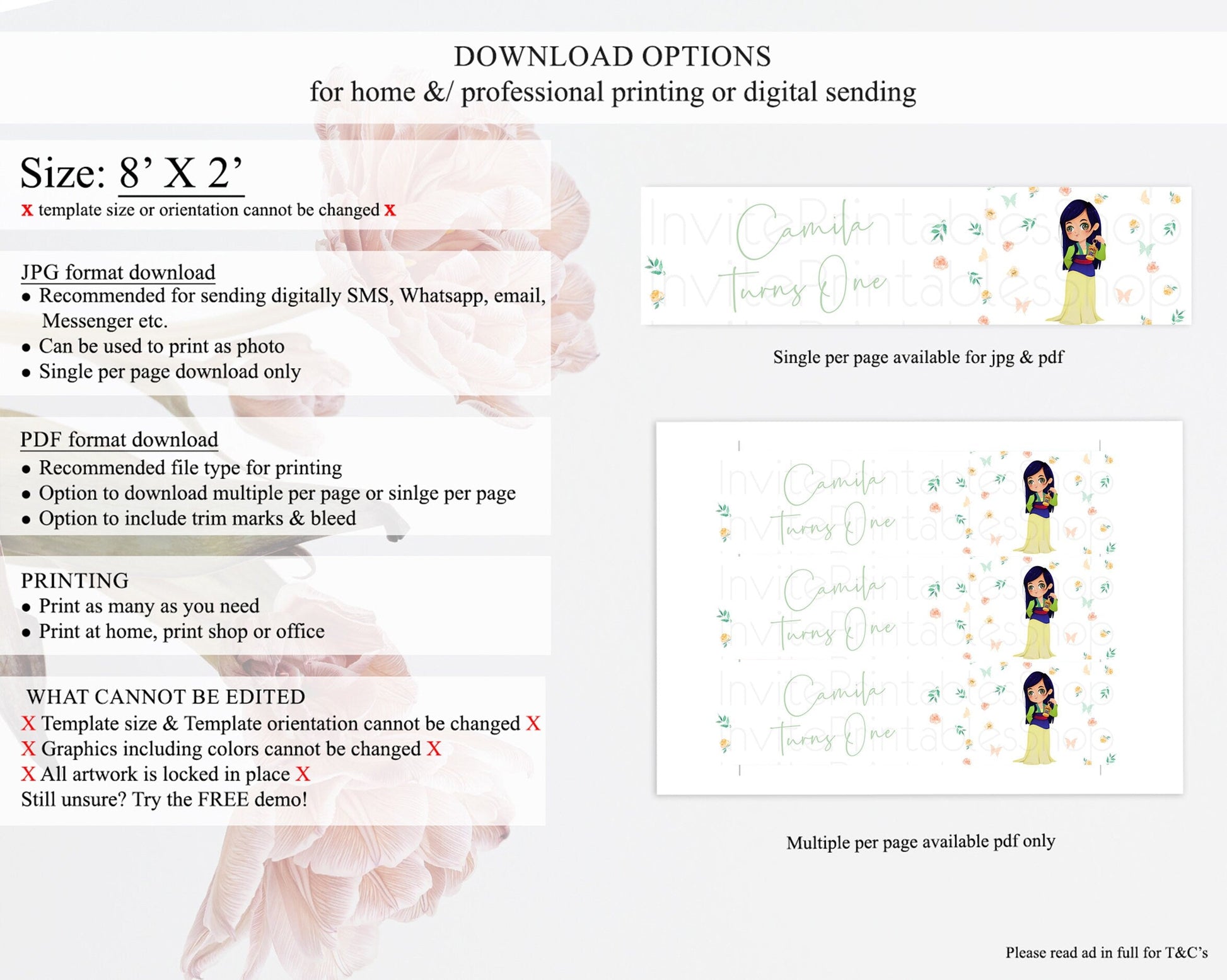 • Template size & orientation cannot be changed. Please use the demo link to confirm this product suits your needs.