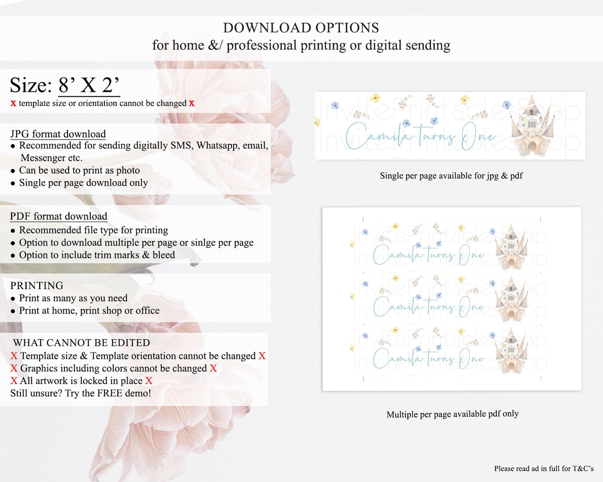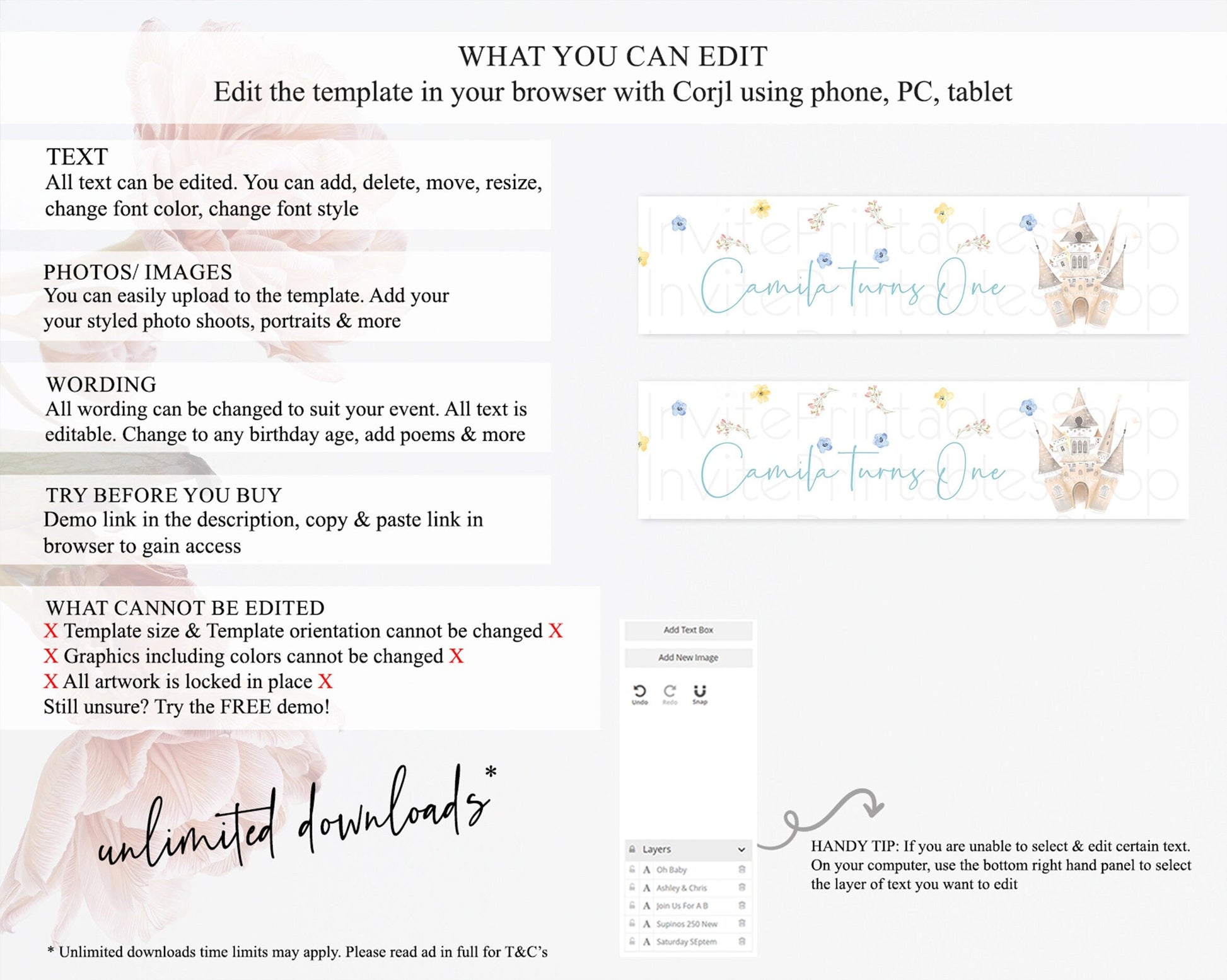 Princess Water Label Template Secret Garden Enchanted Castle Pastel Floral Royal Party Decor For 1st Birthday Baptism Baby Shower D10365