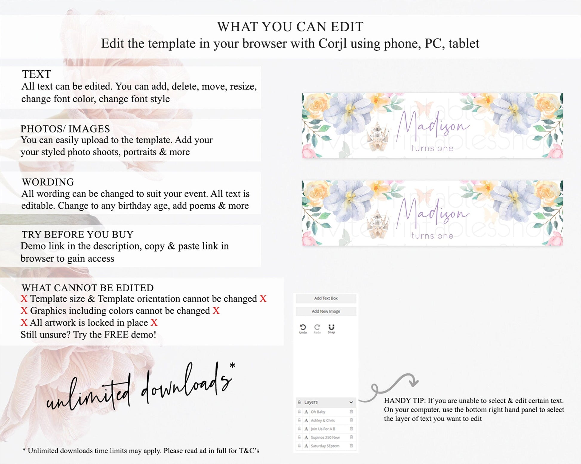 • Template size & orientation cannot be changed. Please use the demo link to confirm this product suits your needs.