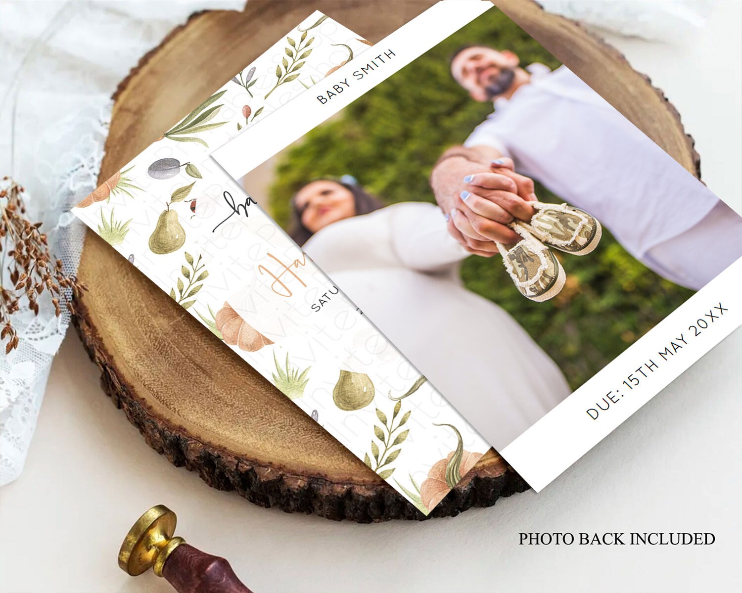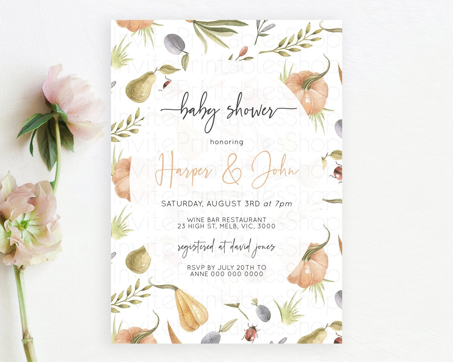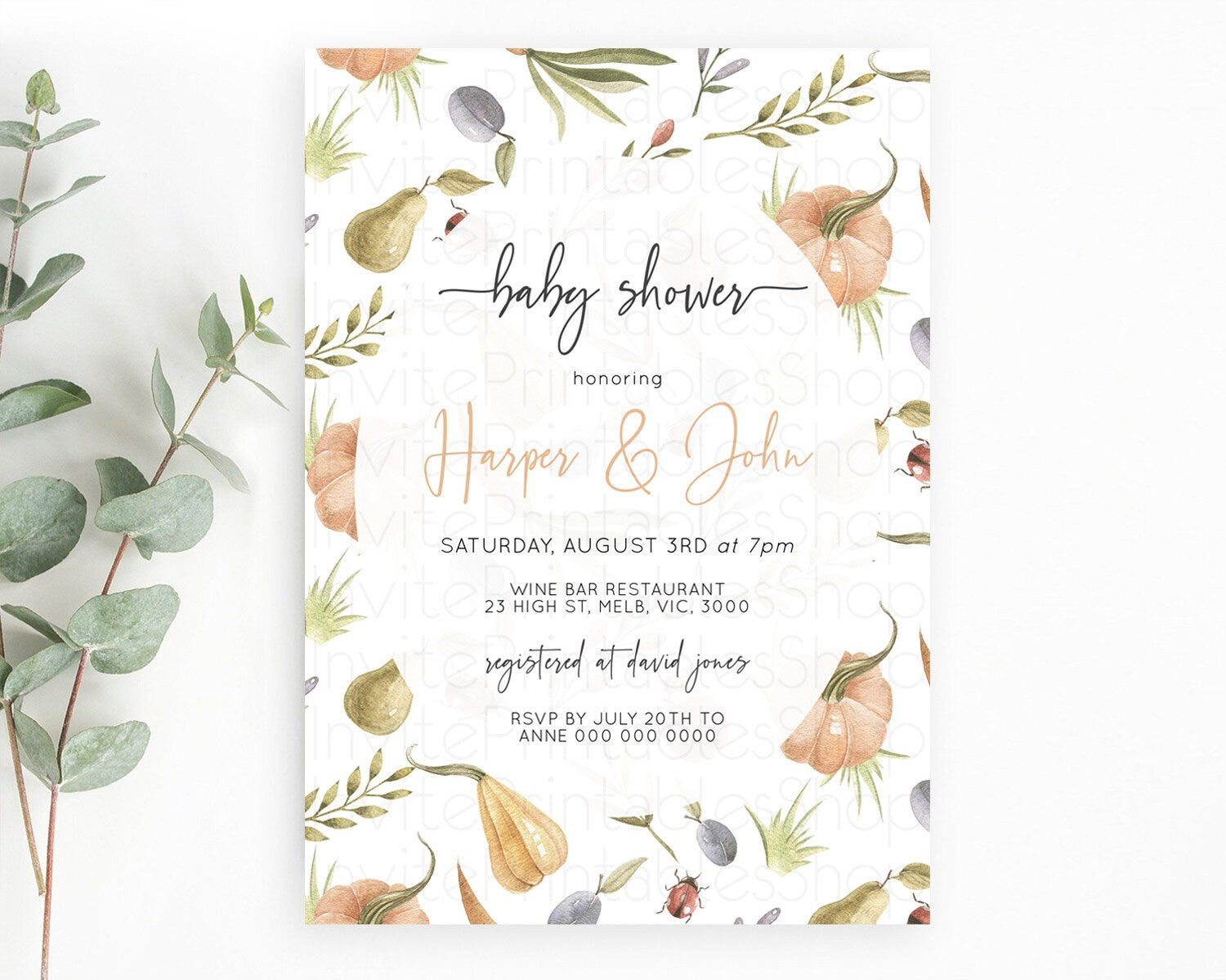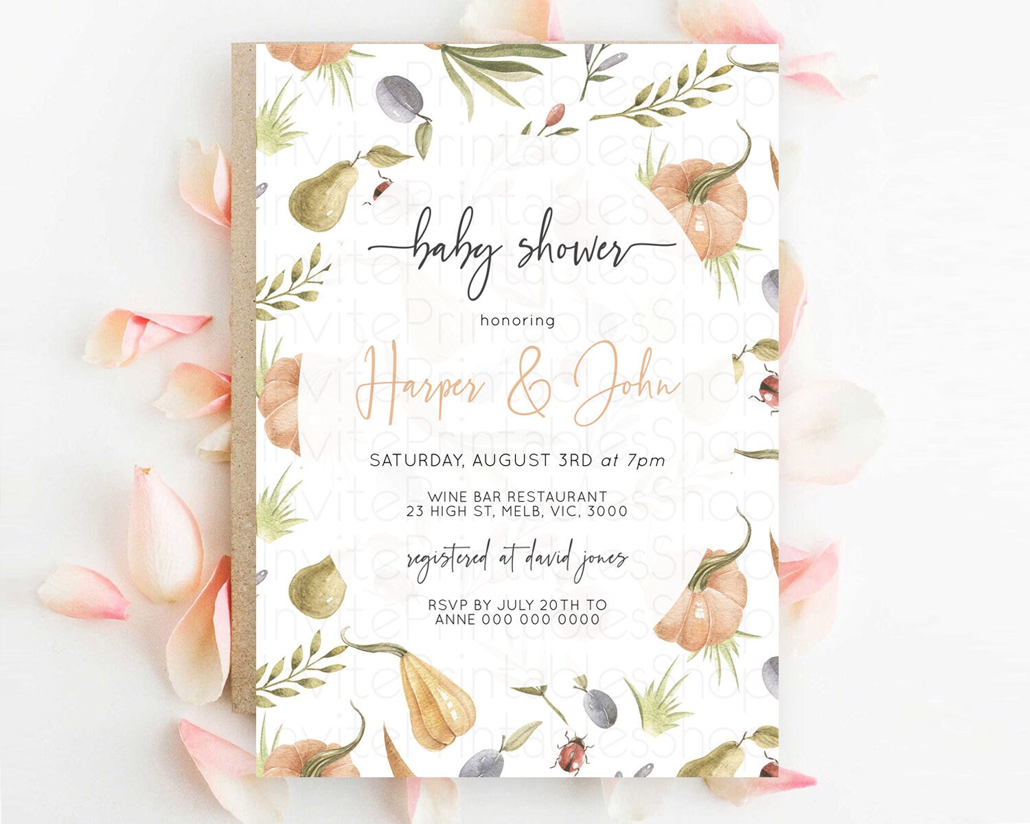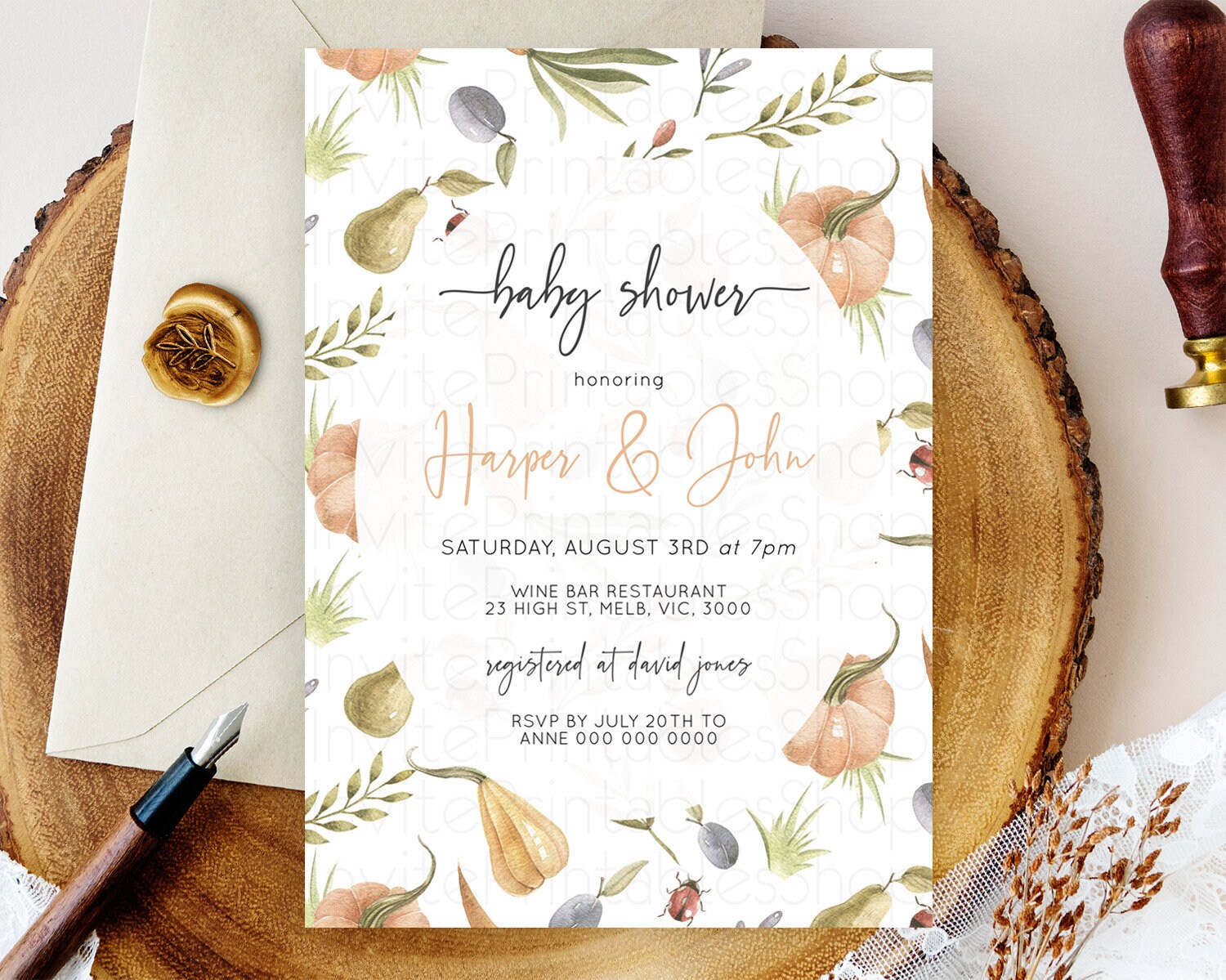 Pumpkin Baby Shower Invitation Pear Invitation Ladybug Invitation Plum Invitation Country Watercolor Baby Shower Invitation D10543