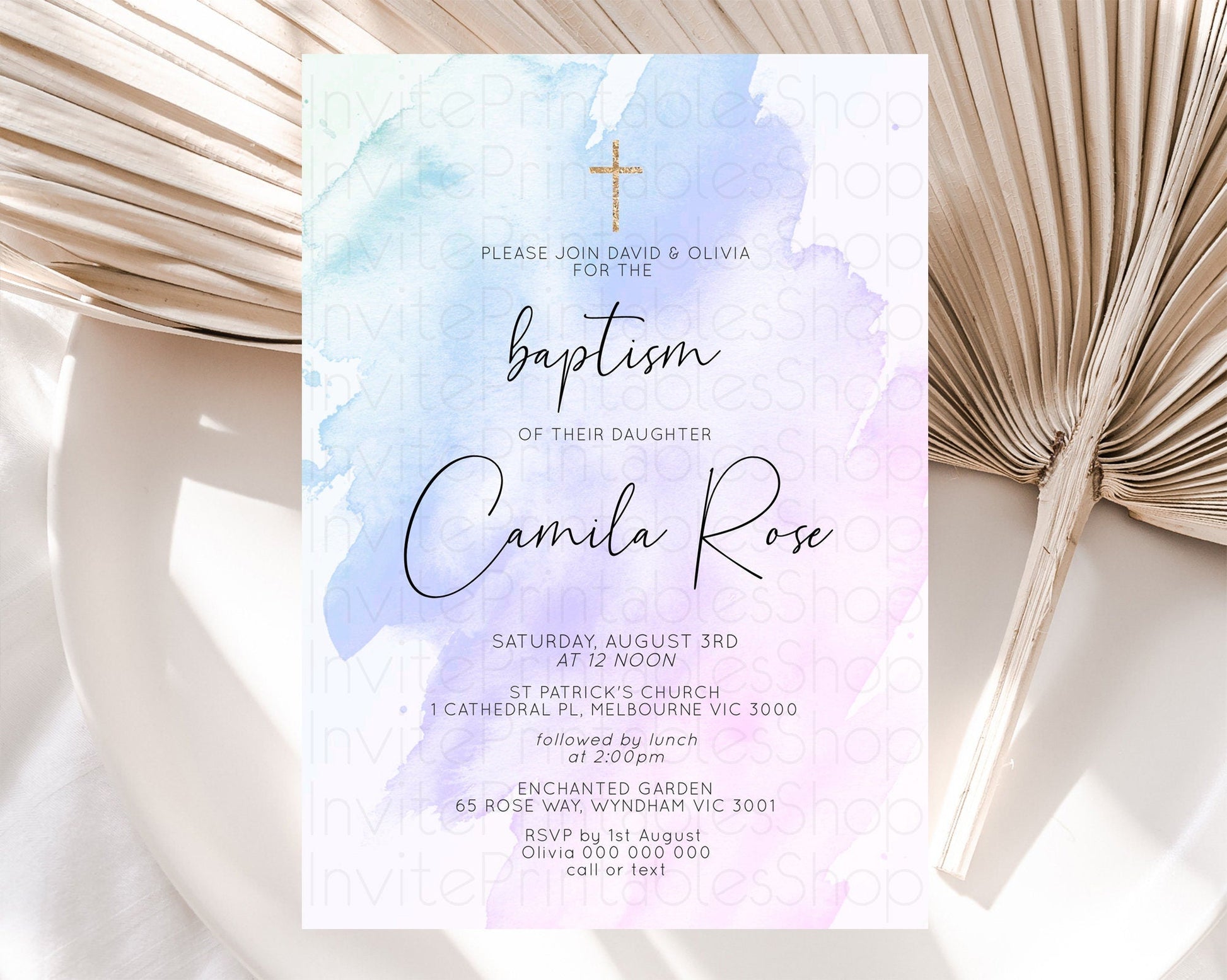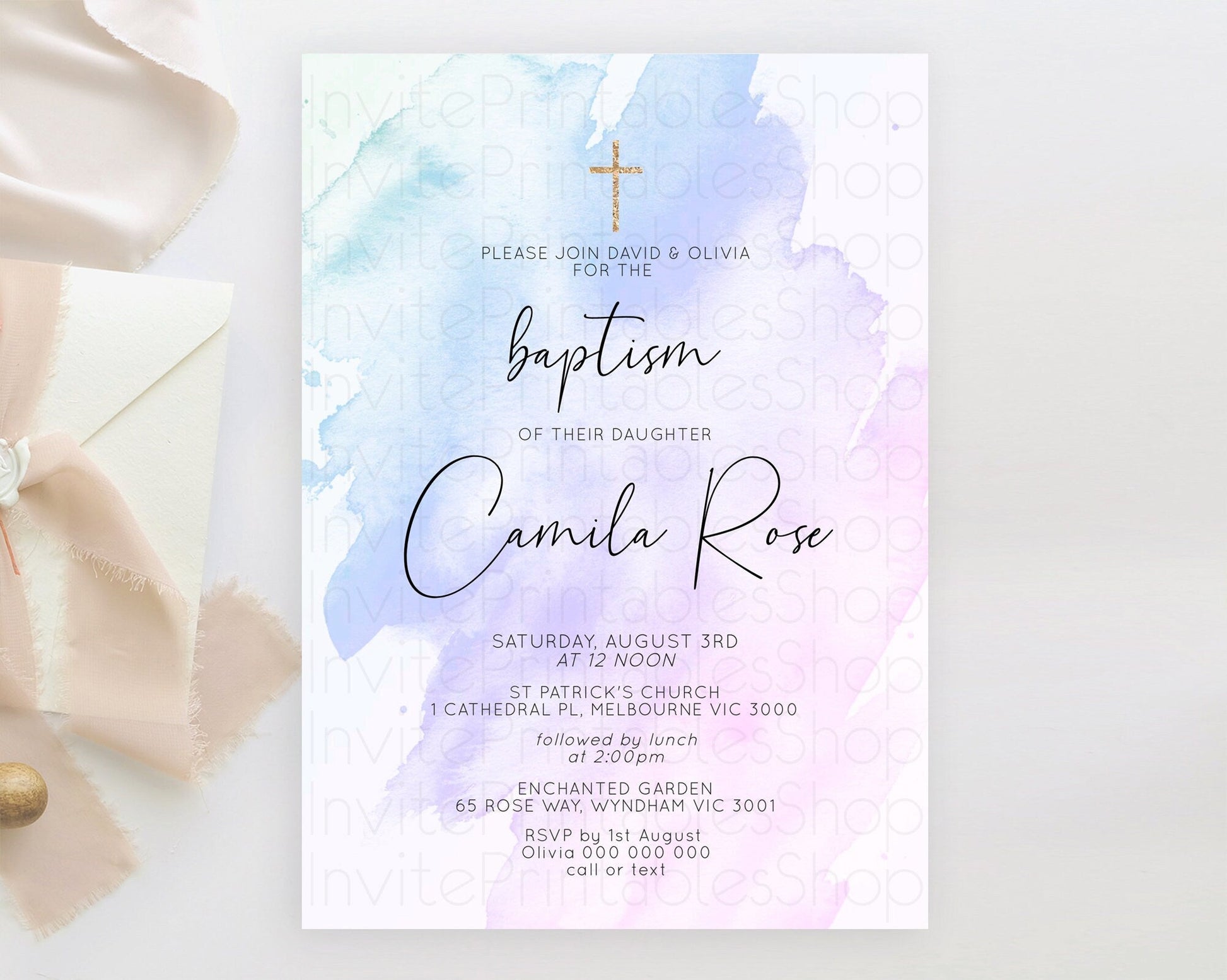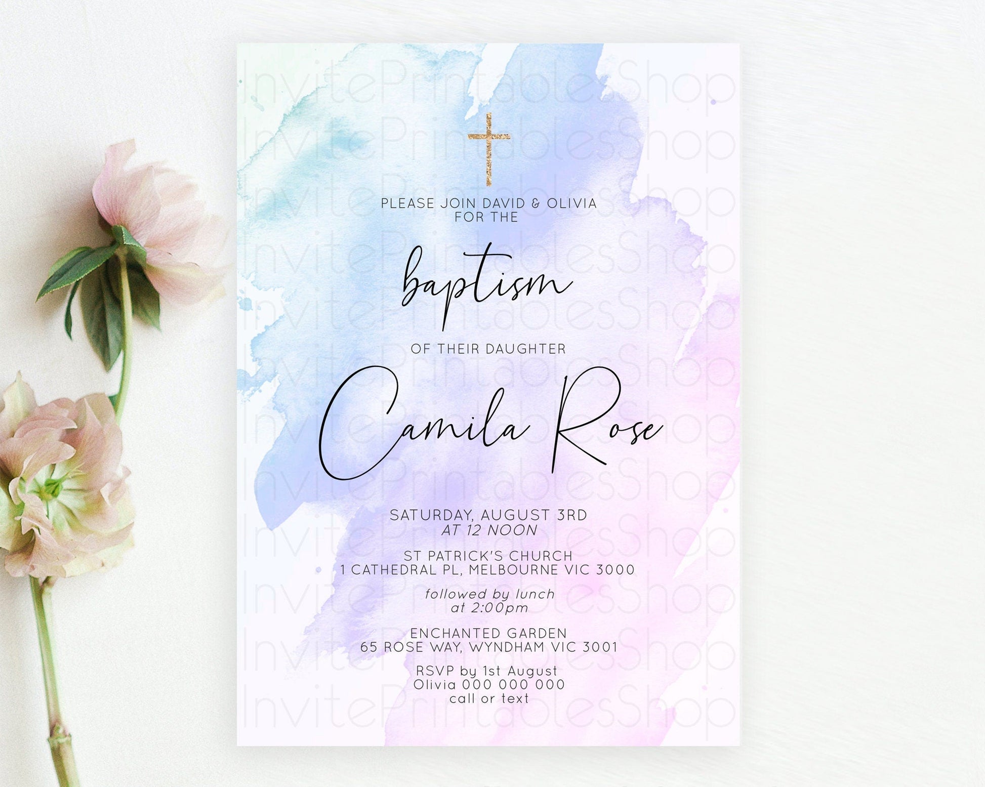 Purple Baptism Invitation Purple Watercolor Baptism Birthday Invitation Pastel Purple Watercolor Christening Invite Purple Splash D10165
