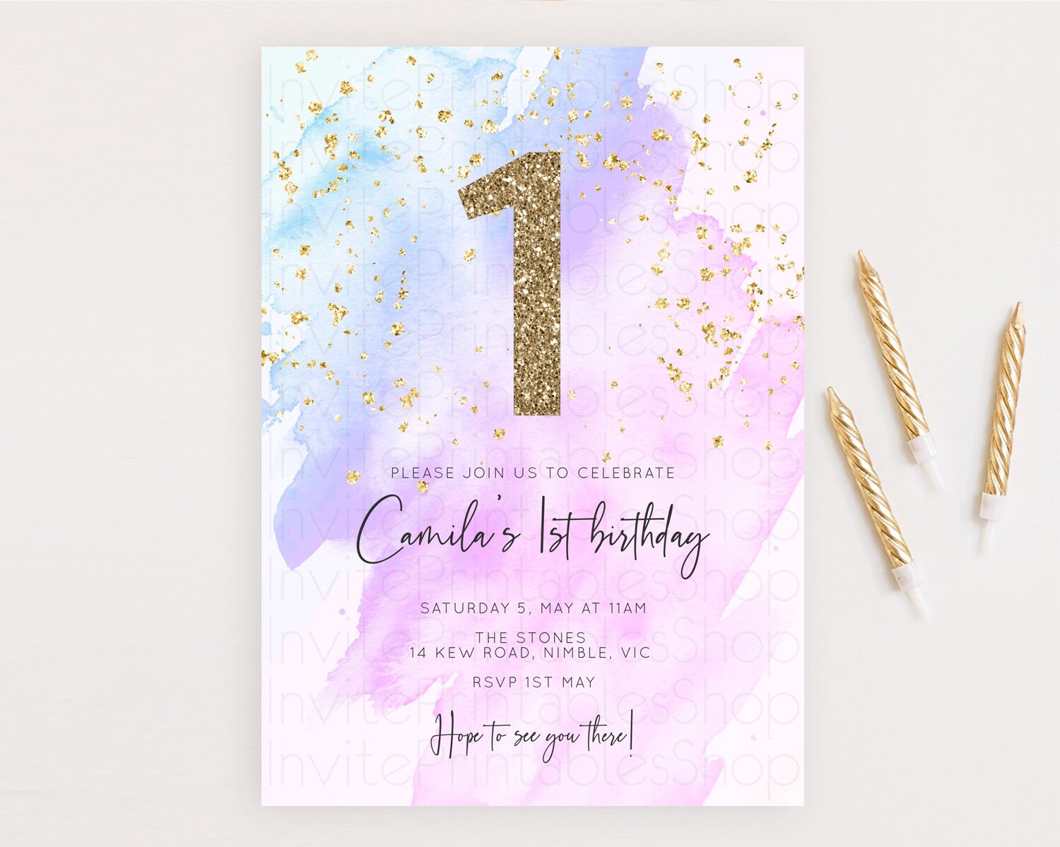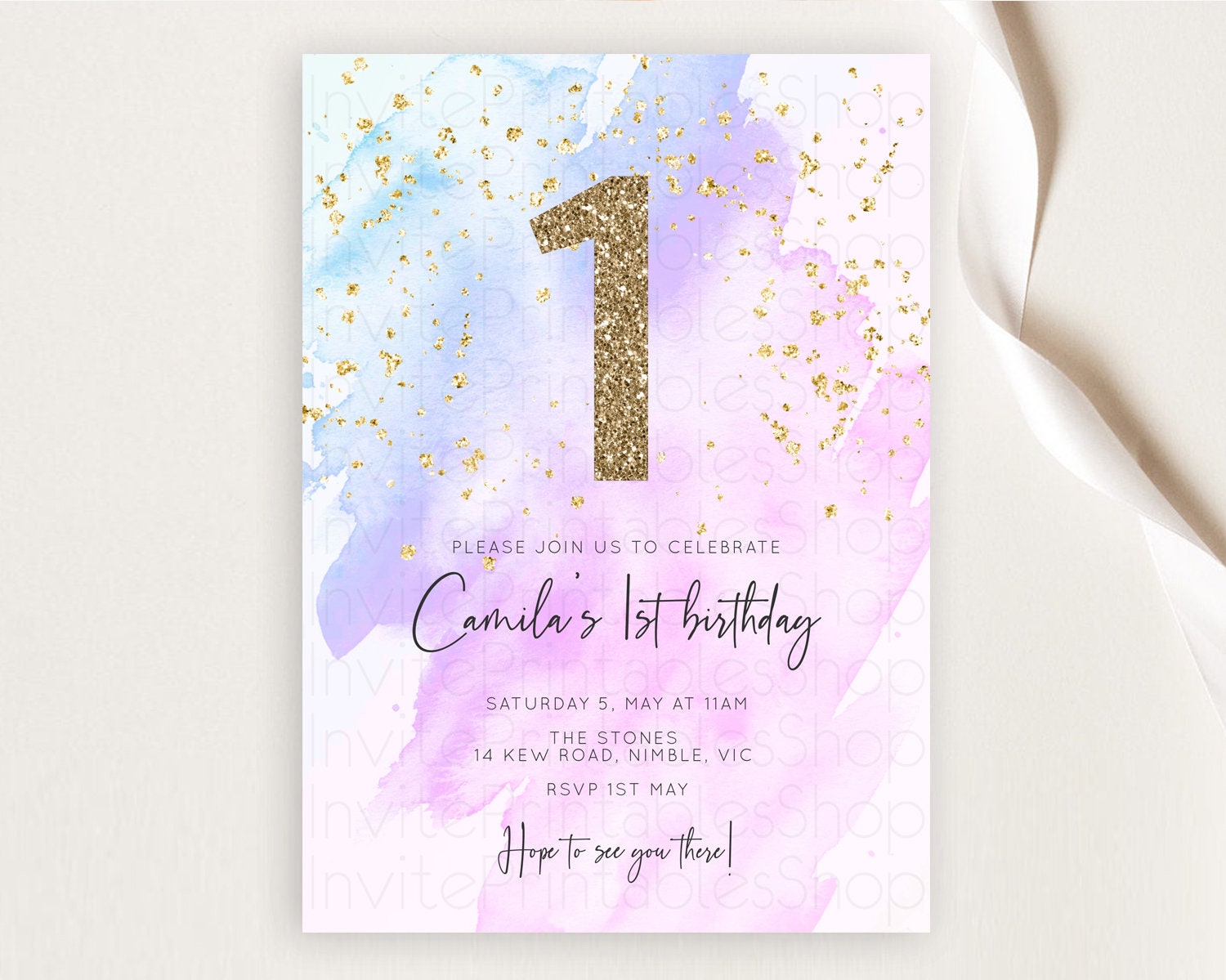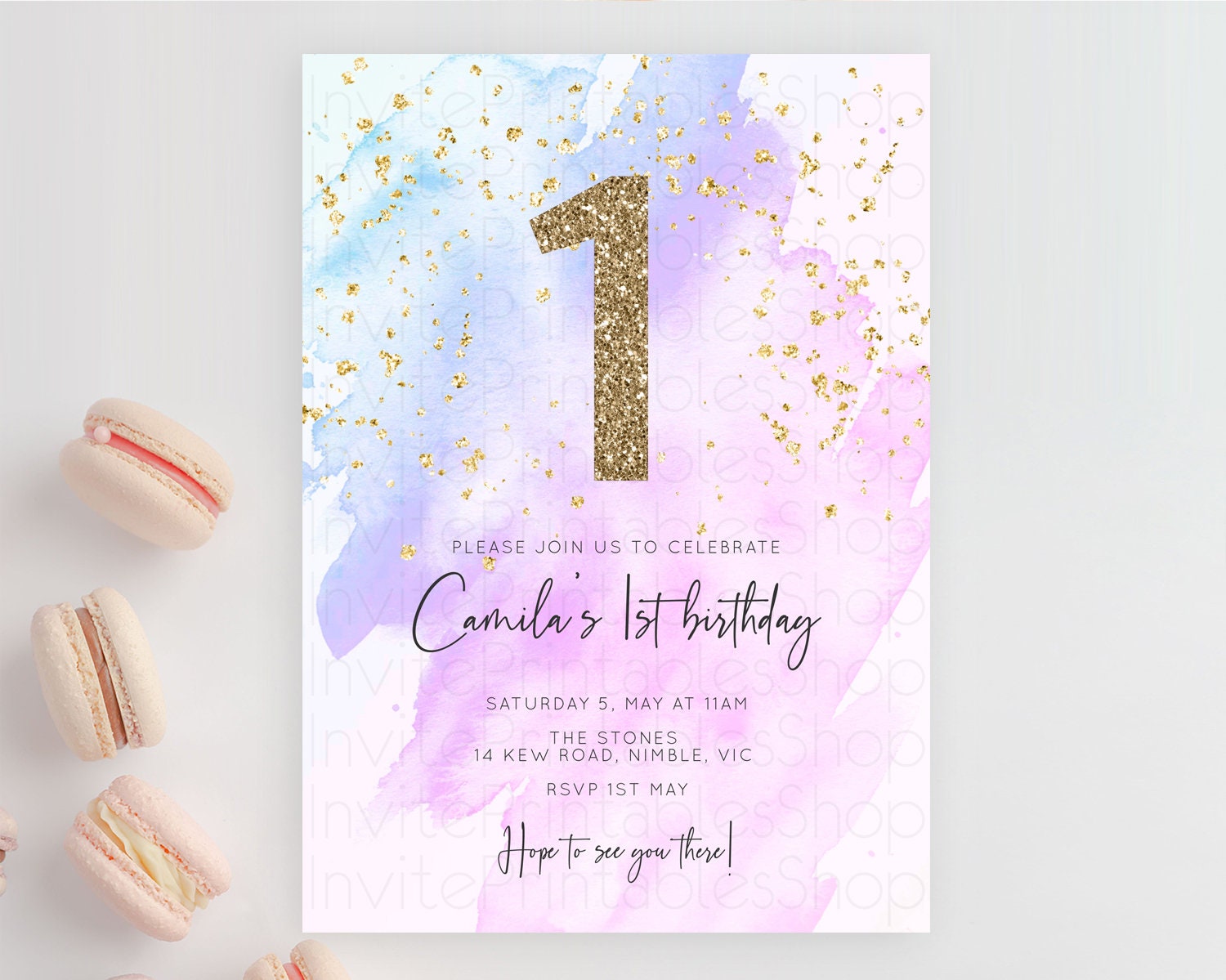 Purple Birthday Invitation Purple Watercolor Invite Pastel Purple Watercolor Invitation Purple Splash Gold Invitation First Birthday D10169