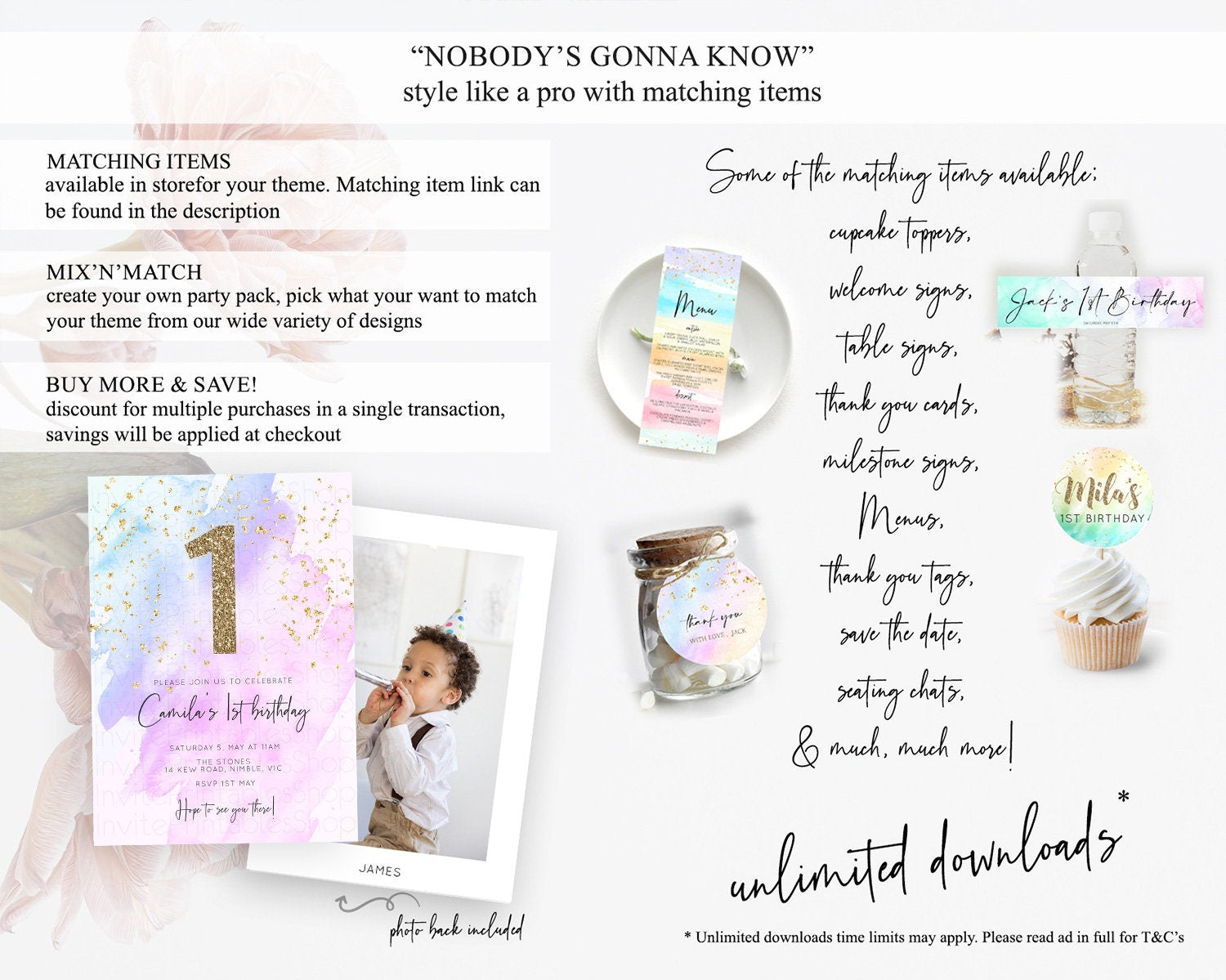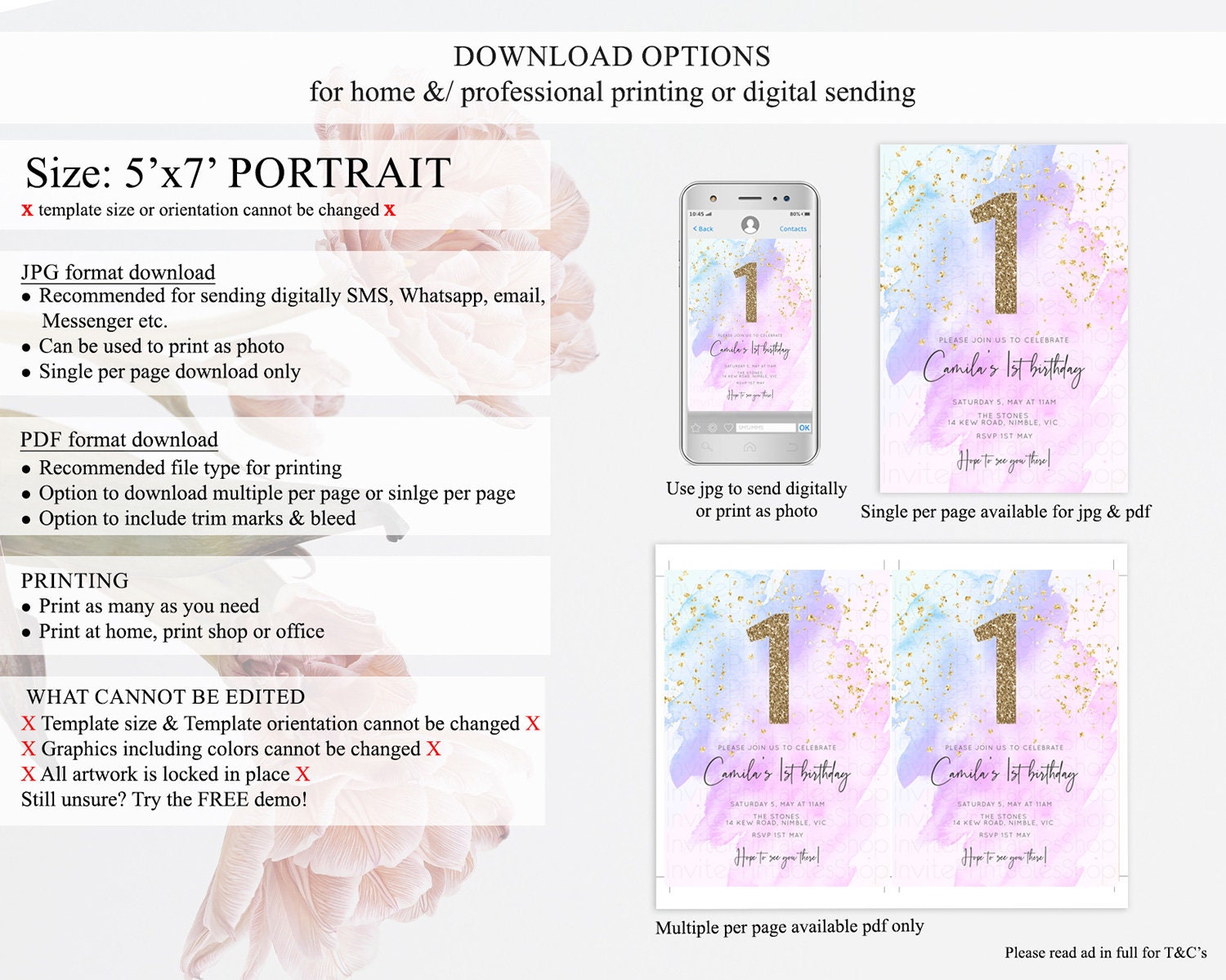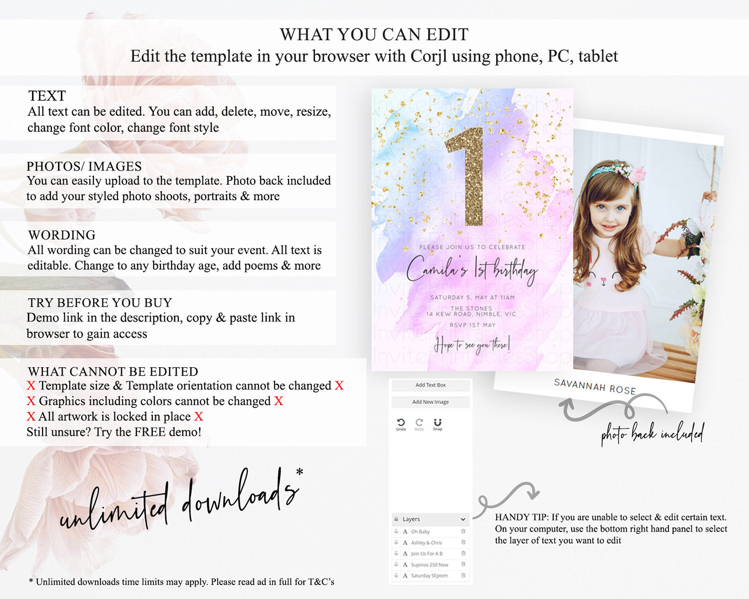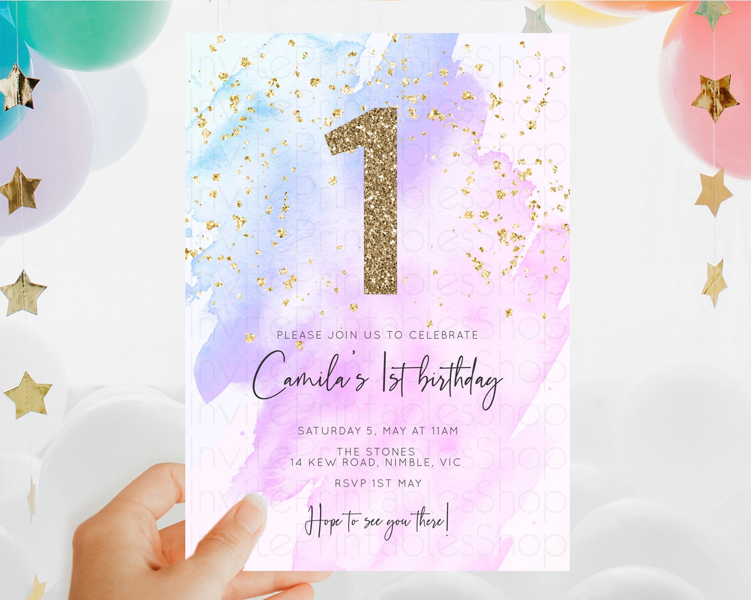 Purple Birthday Invitation Purple Watercolor Invite Pastel Purple Watercolor Invitation Purple Splash Gold Invitation First Birthday D10169