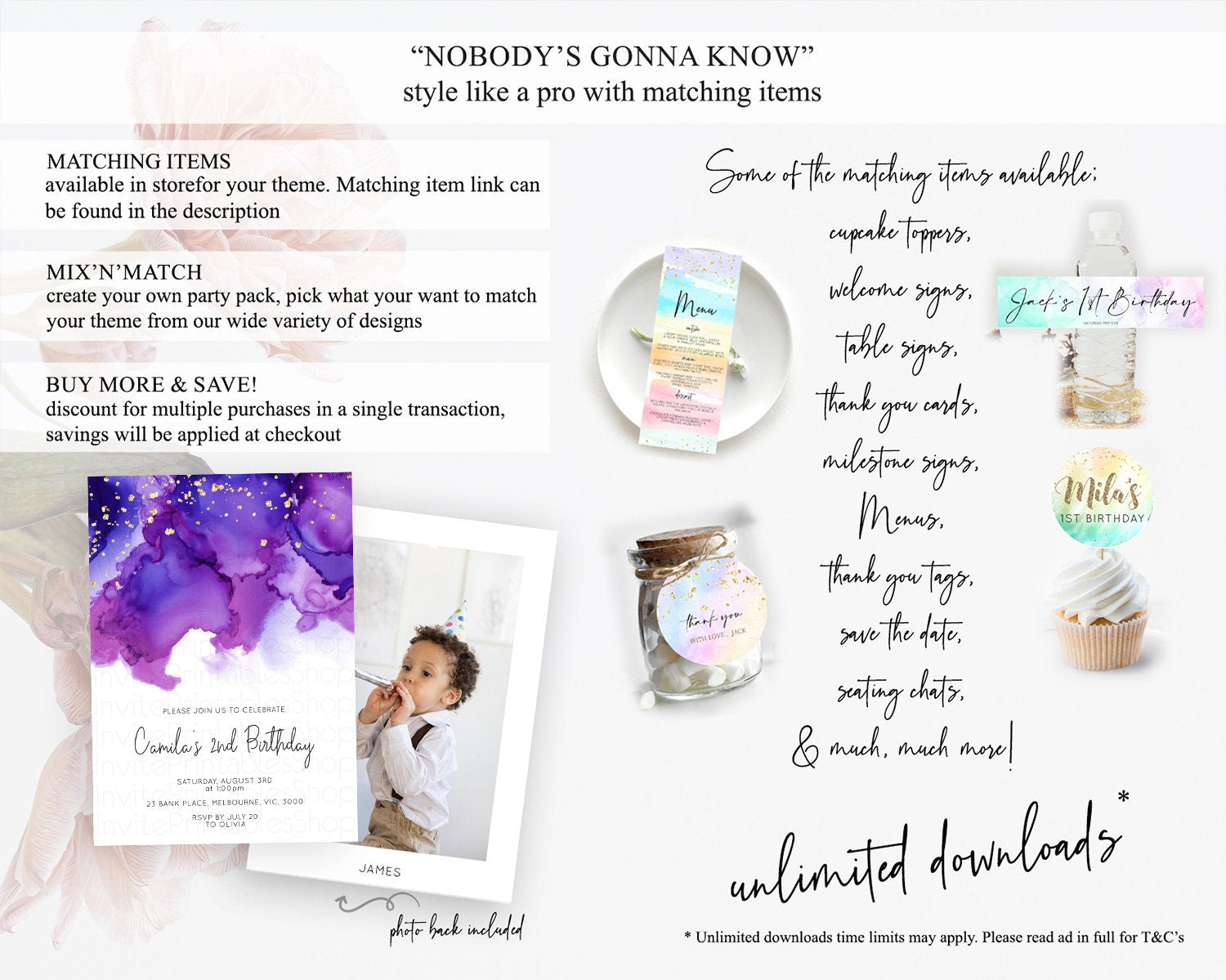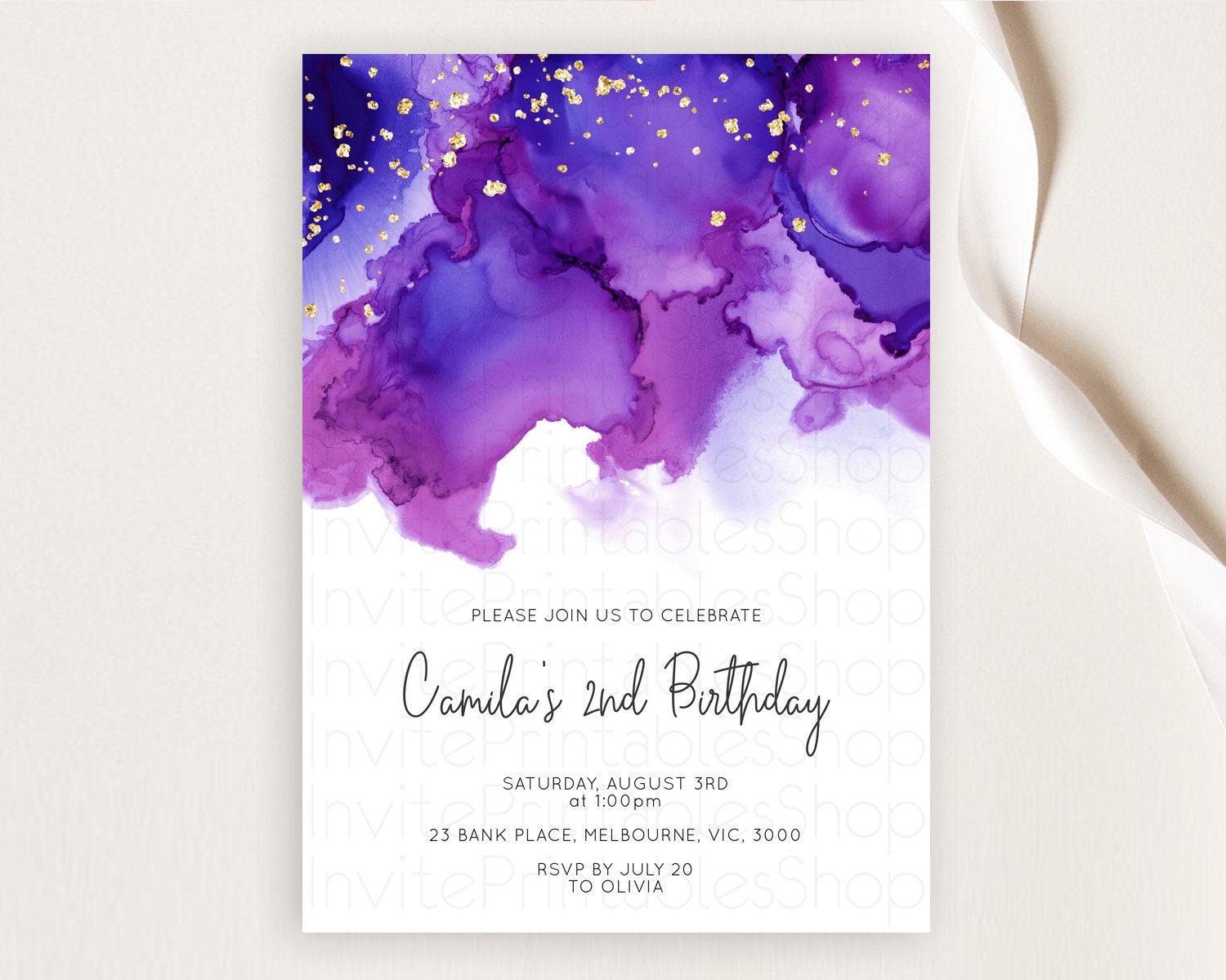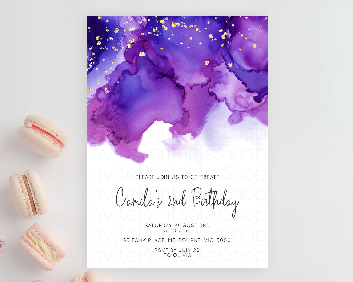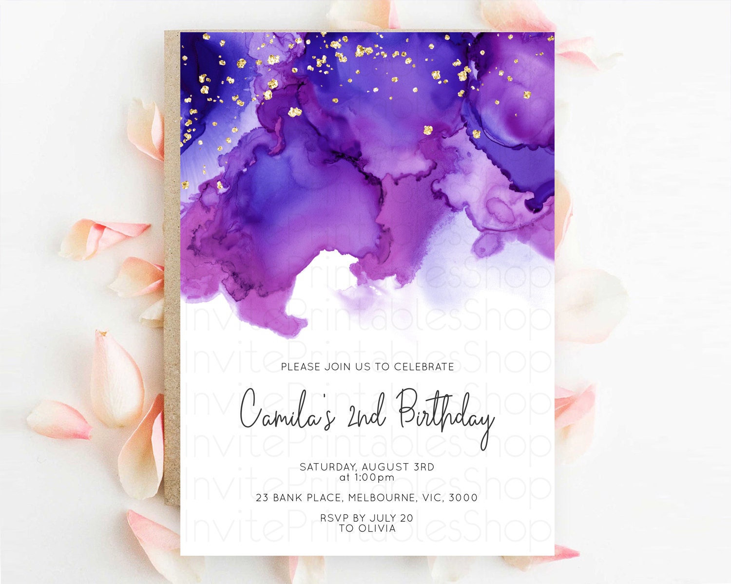 Purple Birthday Invitation Purple Watercolor Invite Pastel Purple Watercolor Invitation Purple Splash Gold Invitation First Birthday D11068