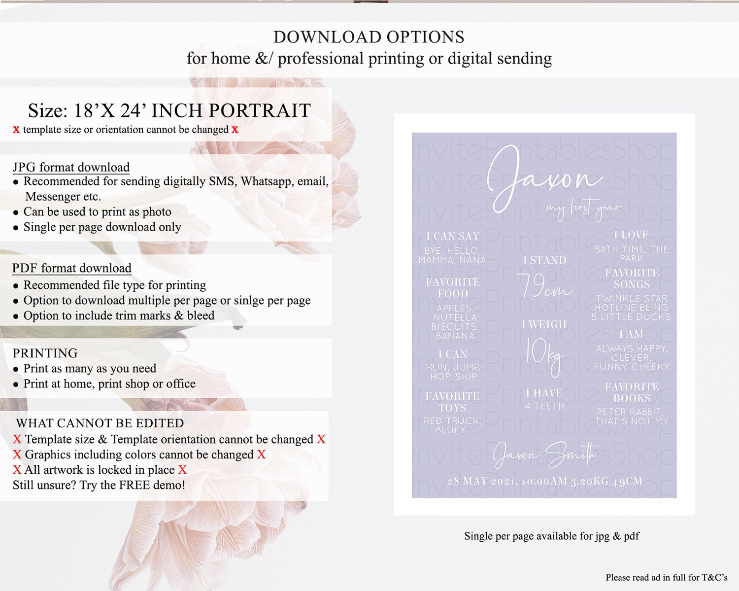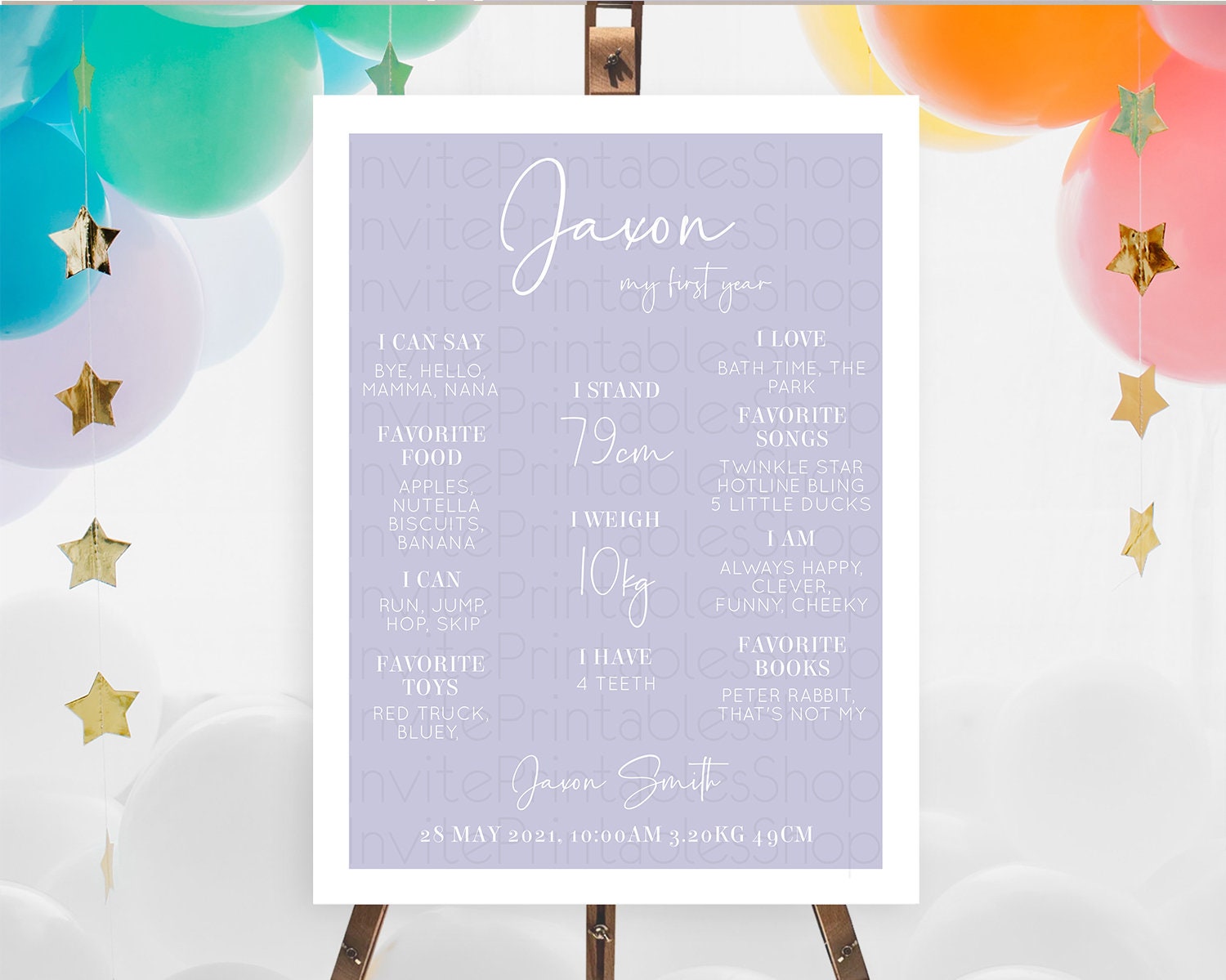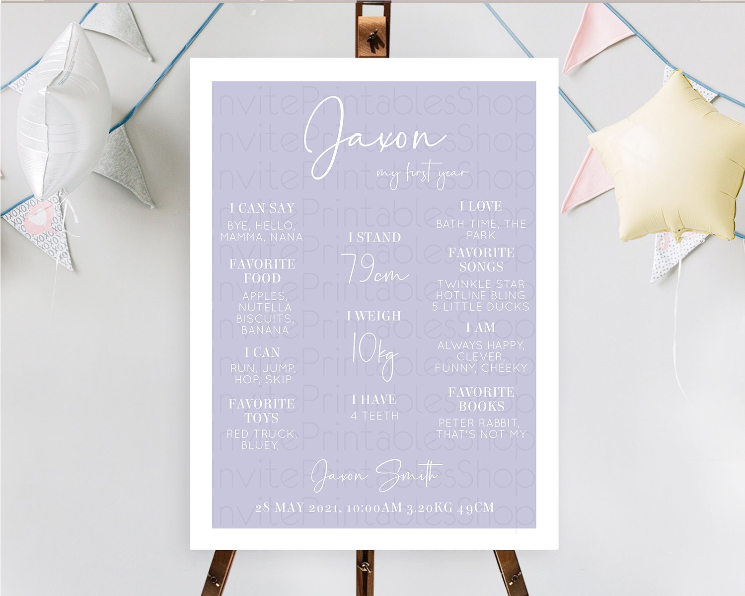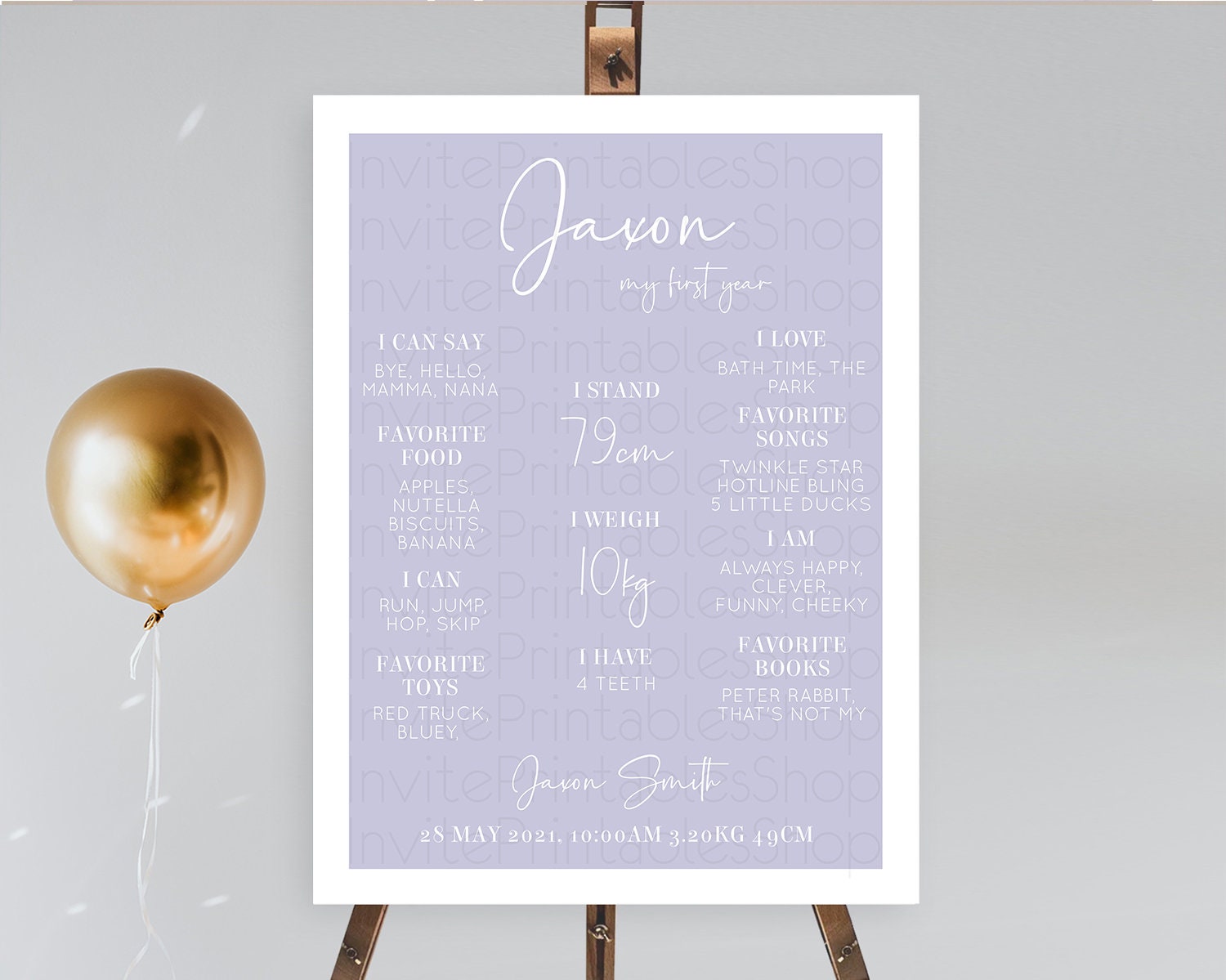 Purple First Birthday Milestone Poster Plain Purple Milestone Board Minimal Pastel Purple Milestone Modern 1st Birthday Welcome Sign D10942