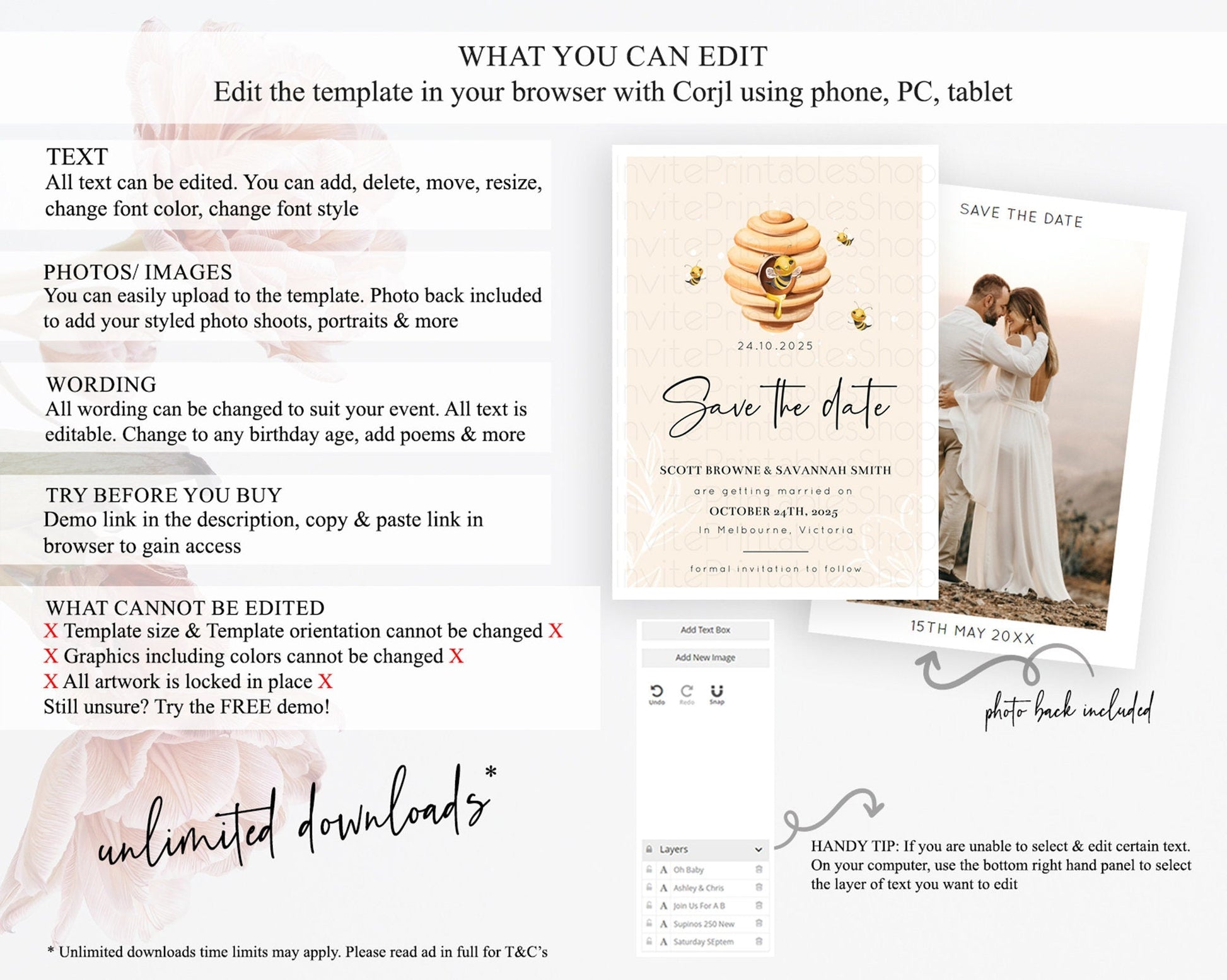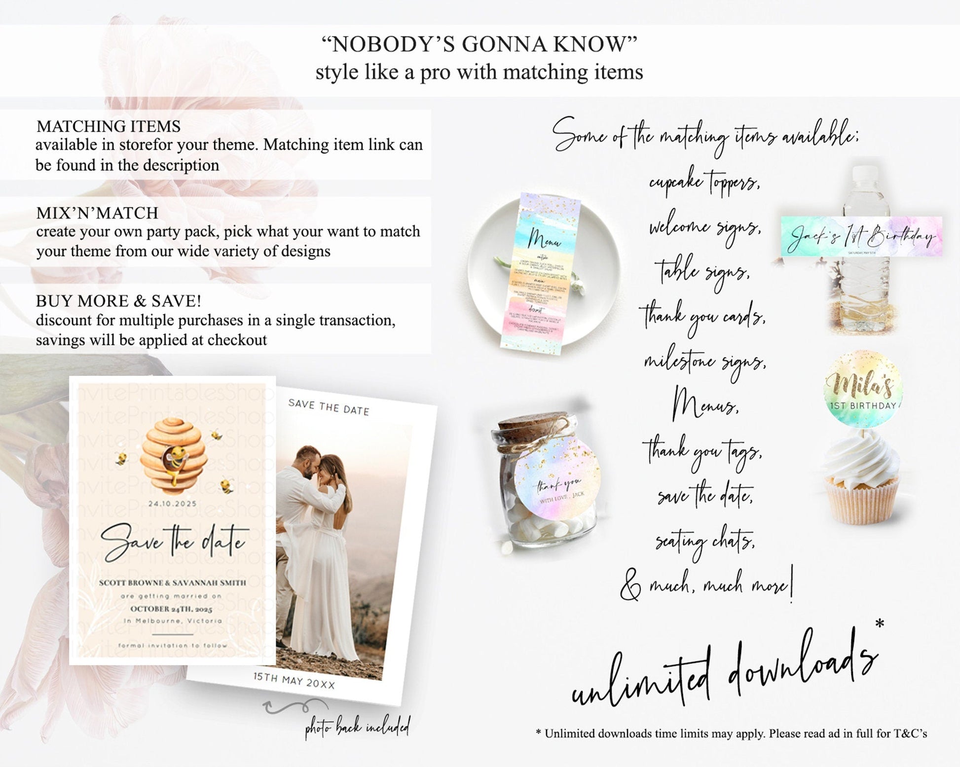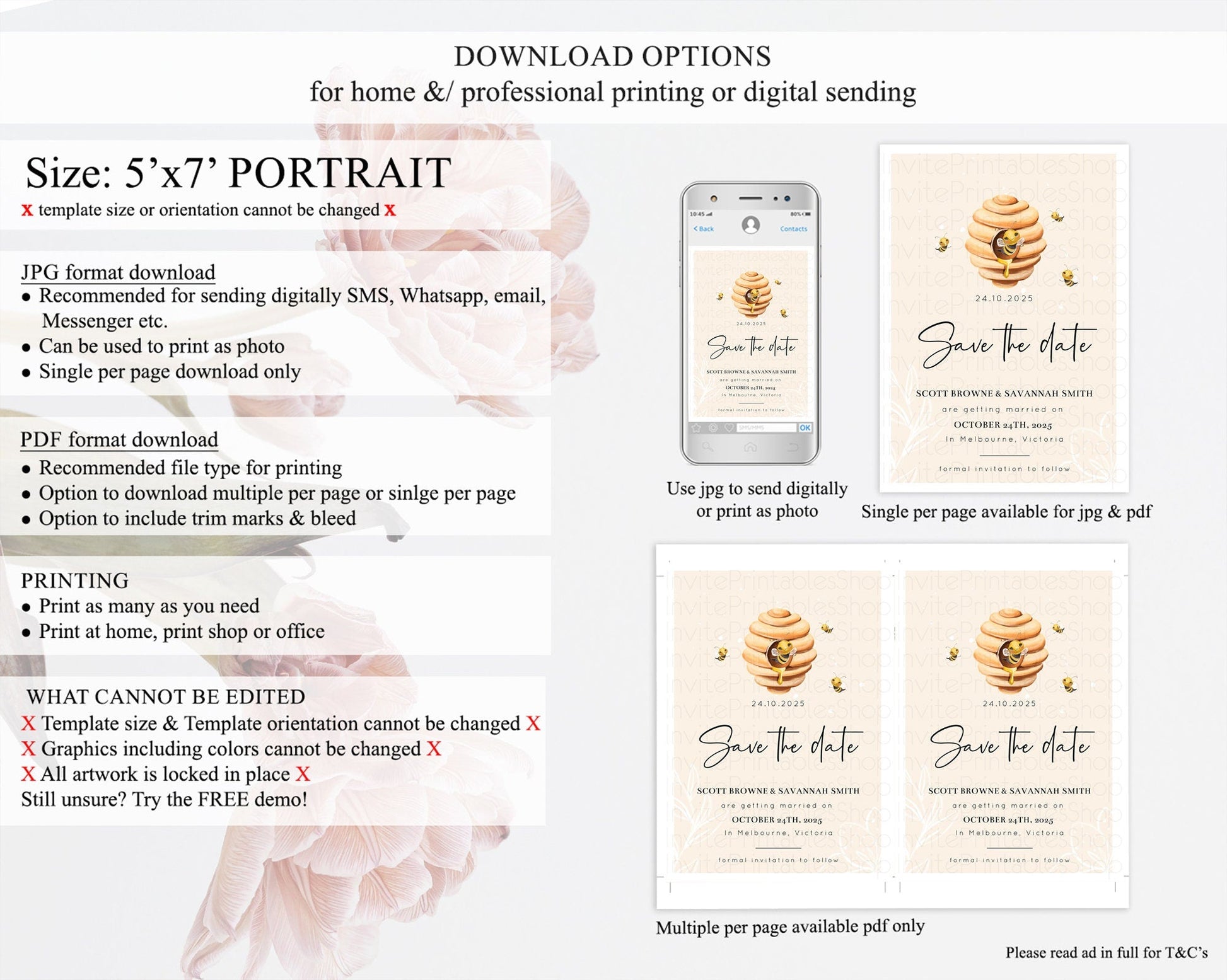 Queen Bee Save The Date Template Momma BEE First BEE-DAY 1st Birthday Baby Shower Baptism Wedding Floral Sweet Honey Beehive Party D10754